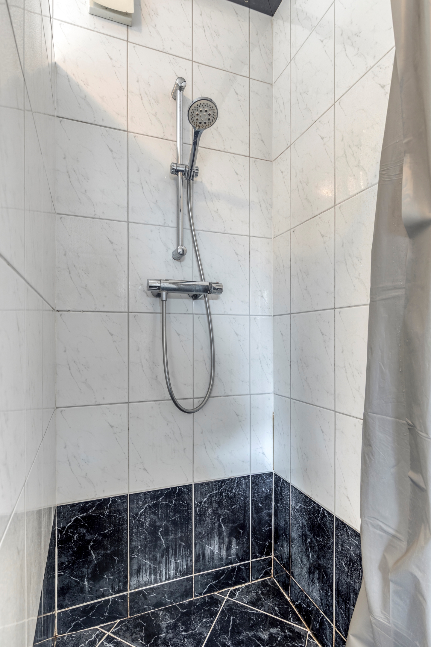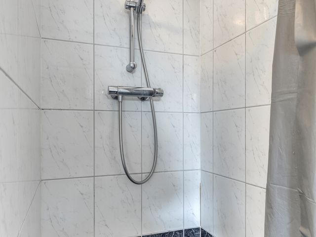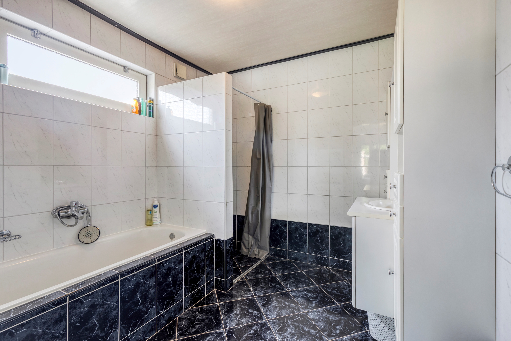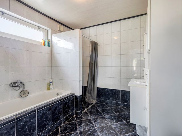 De badkamer is voorzien van een inloopdouche, een ligbad en een wastafel in wastafelmeubel. De badkamer is geheel betegeld.