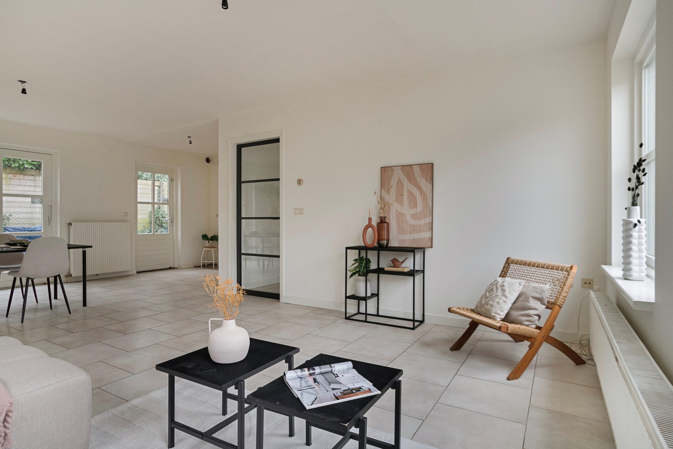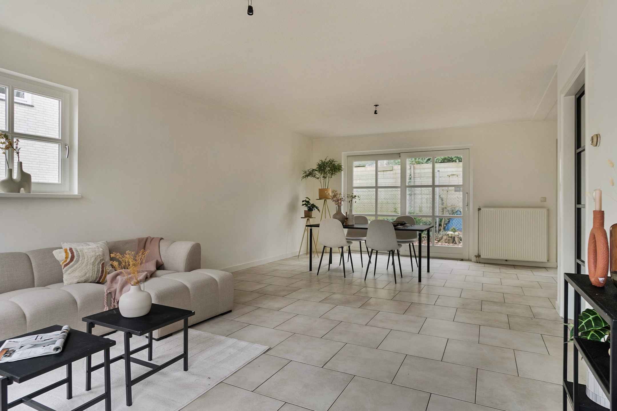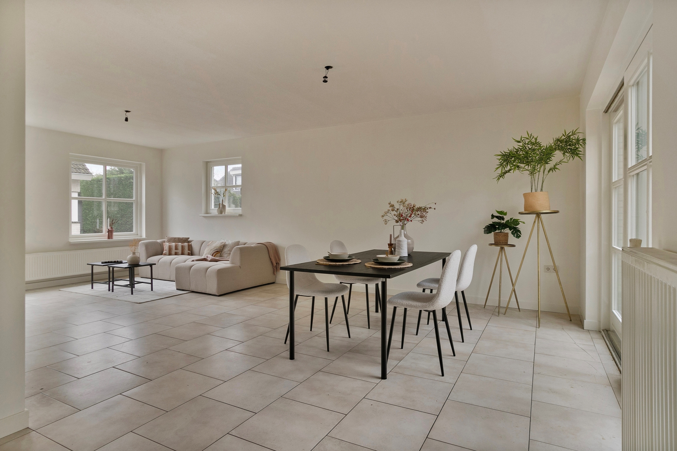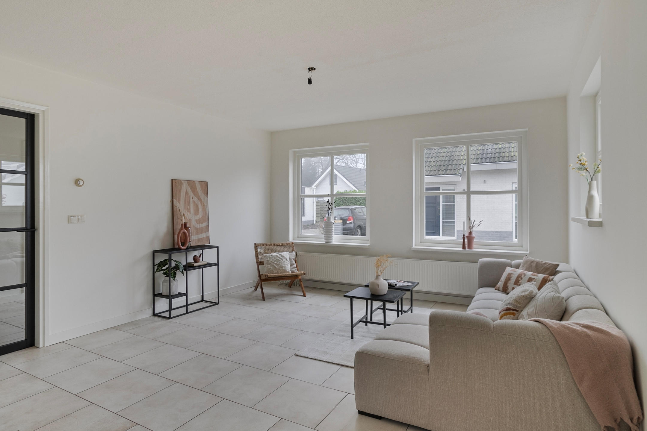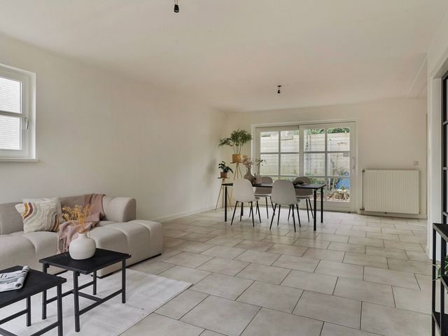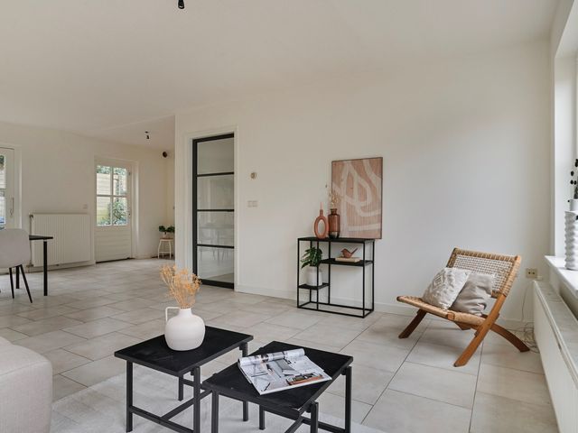 - Royale woonkamer met meerdere raampartijen en schuifpui naar de tuin