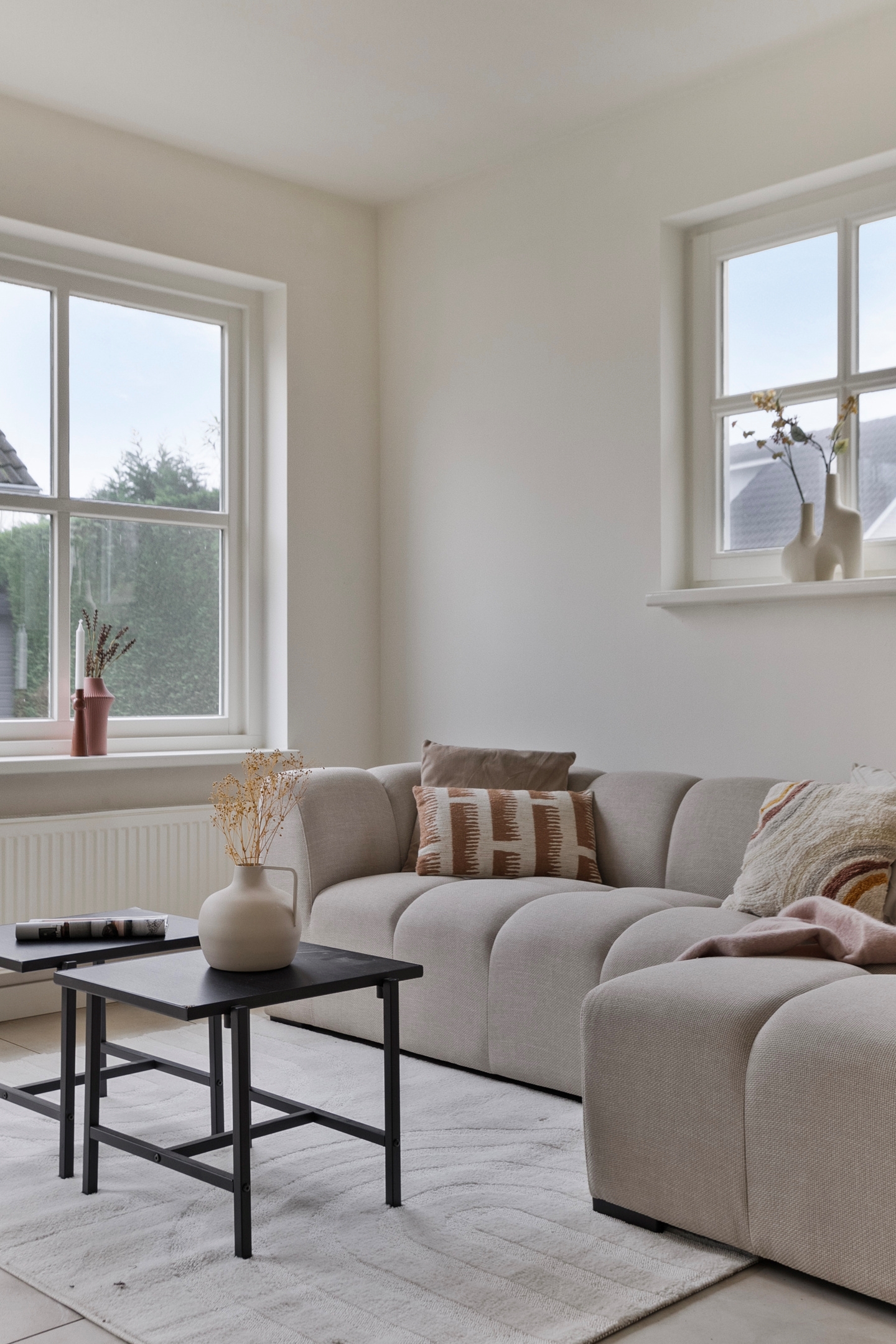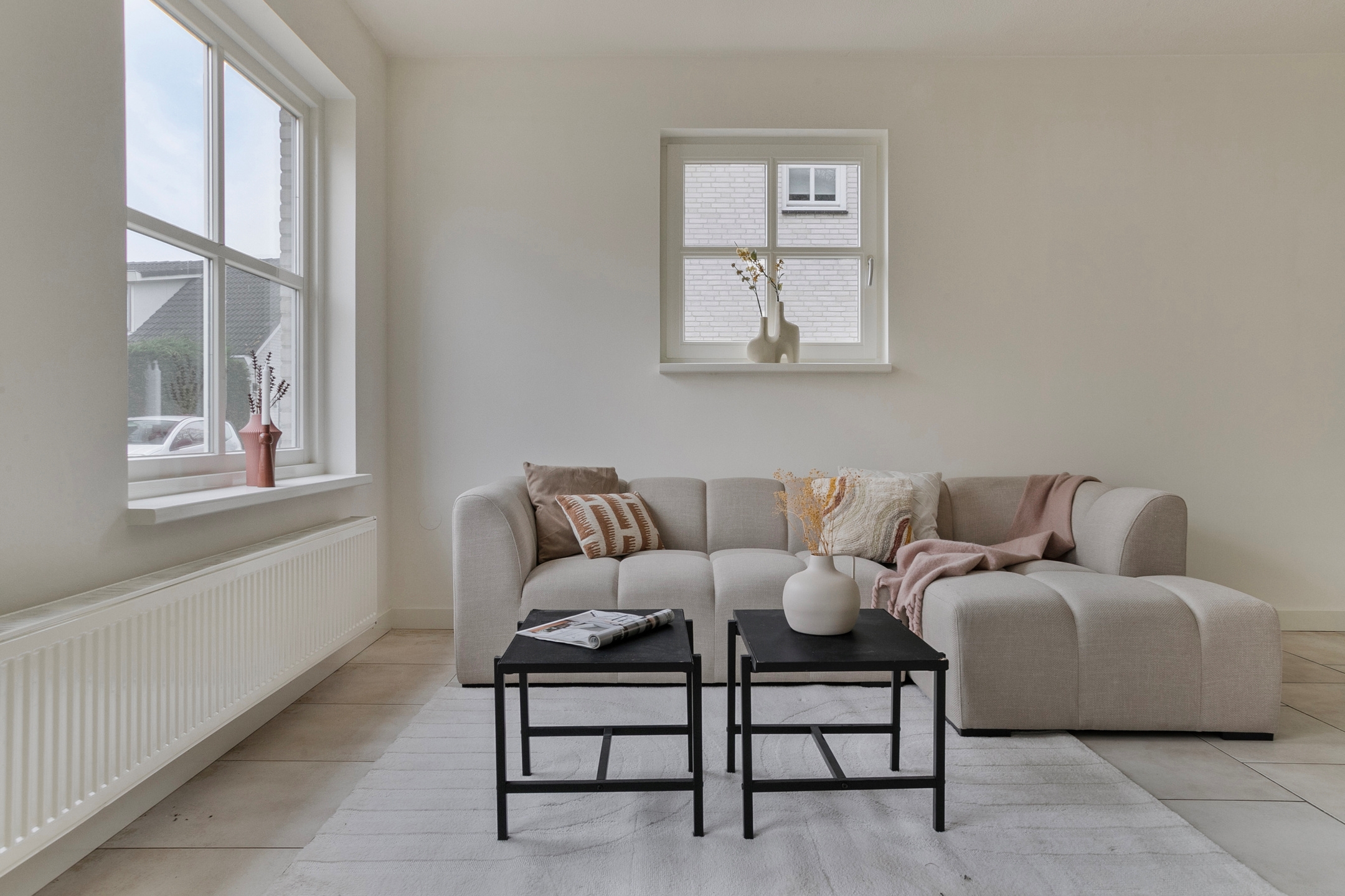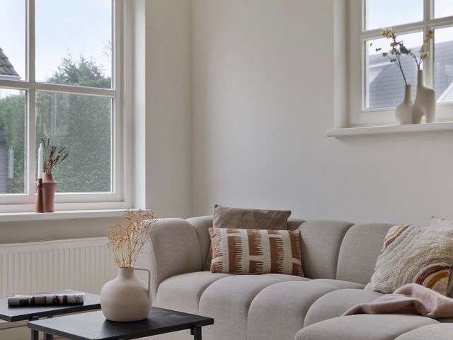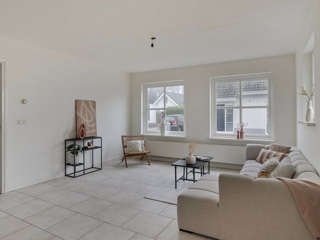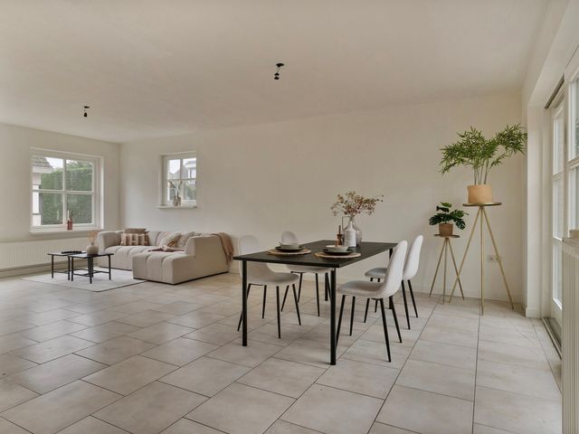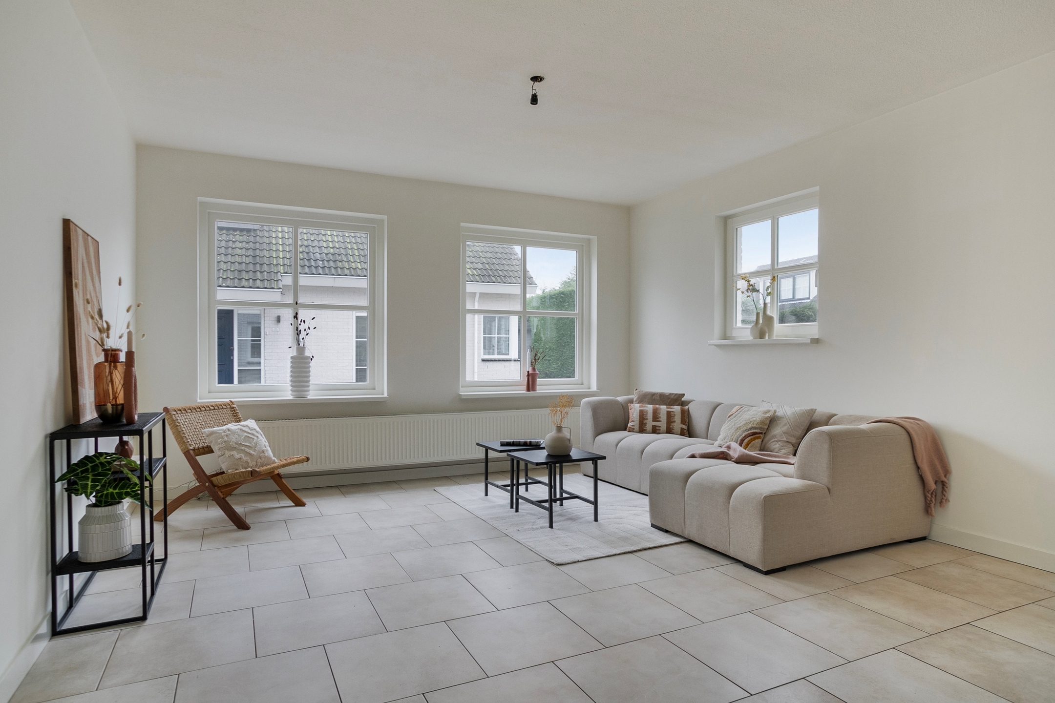 - Royale woonkamer met meerdere raampartijen en schuifpui naar de tuin