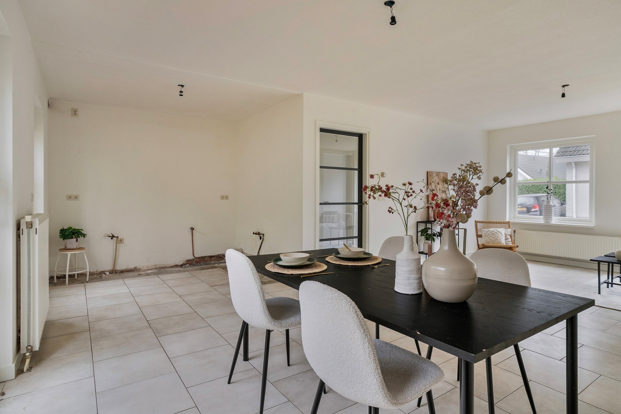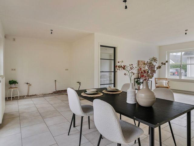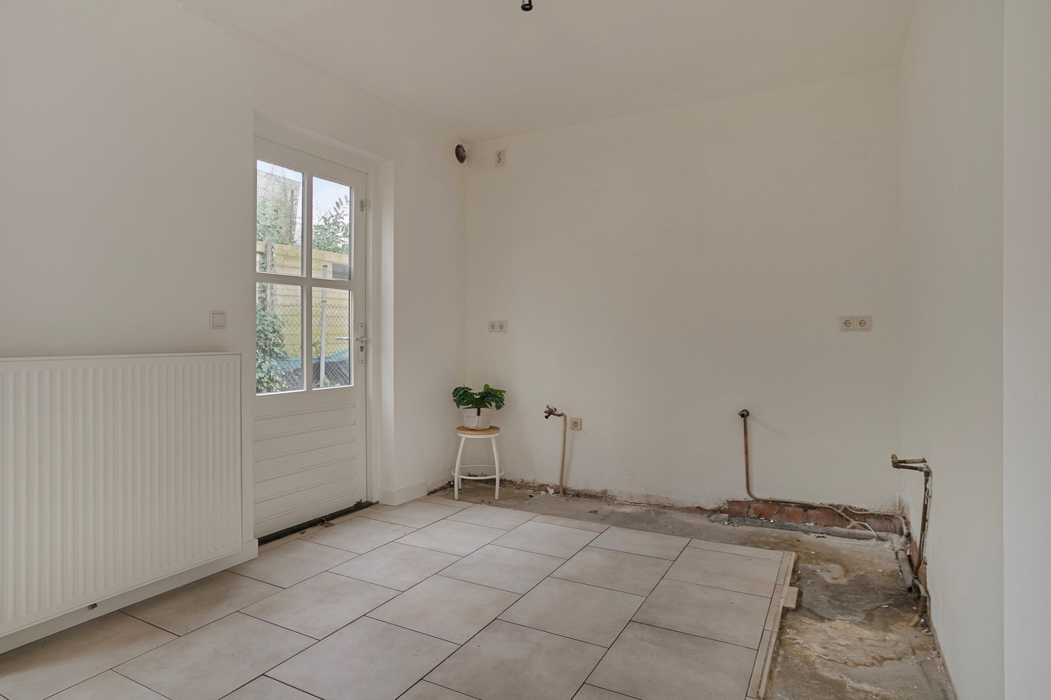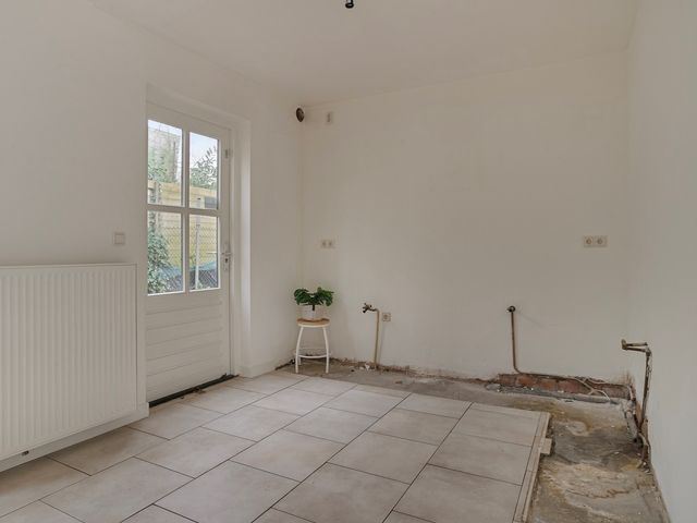 De open keuken biedt de mogelijkheid tot het plaatsen van een royale keuken in een L-vormige opstelling. Middels een loopdeur heeft u toegang tot de achtertuin.