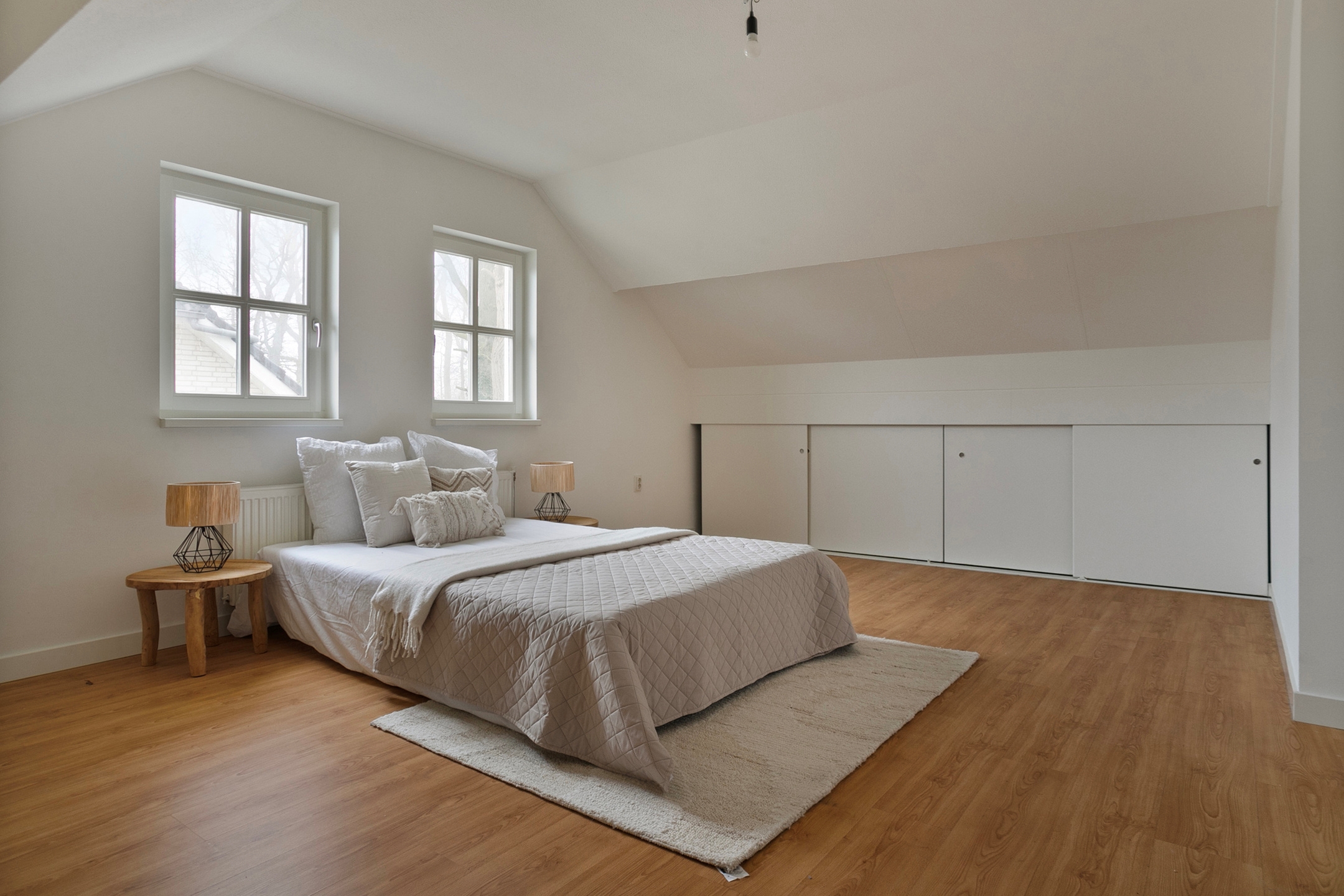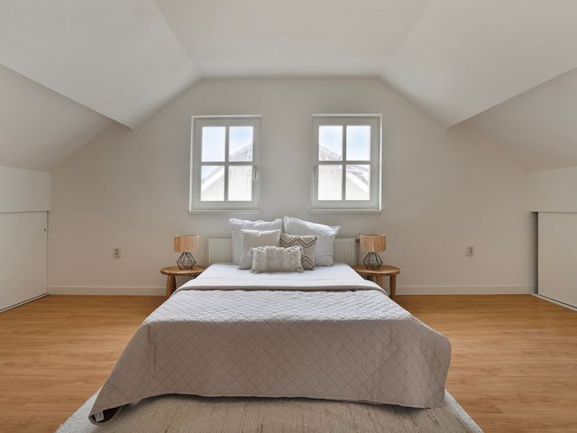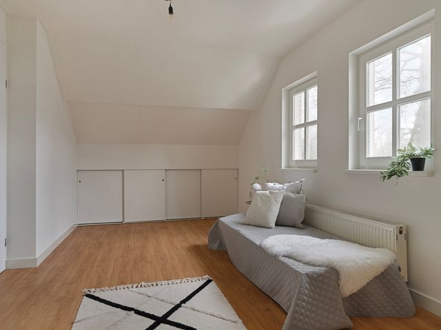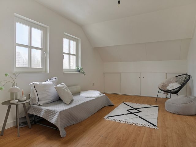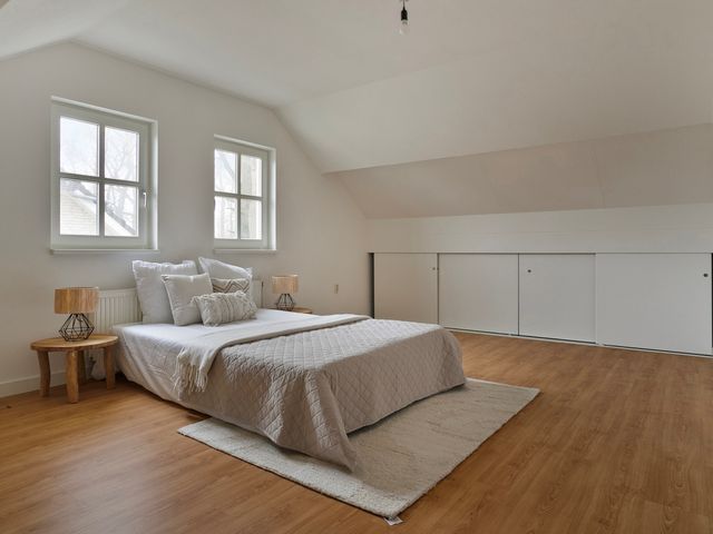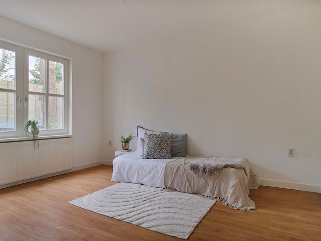 De slaapkamer op de begane grond is er een met veel ruimte. De slaapkamer is voorzien van een laminaatvloer en een stucwerk wandafwerking.