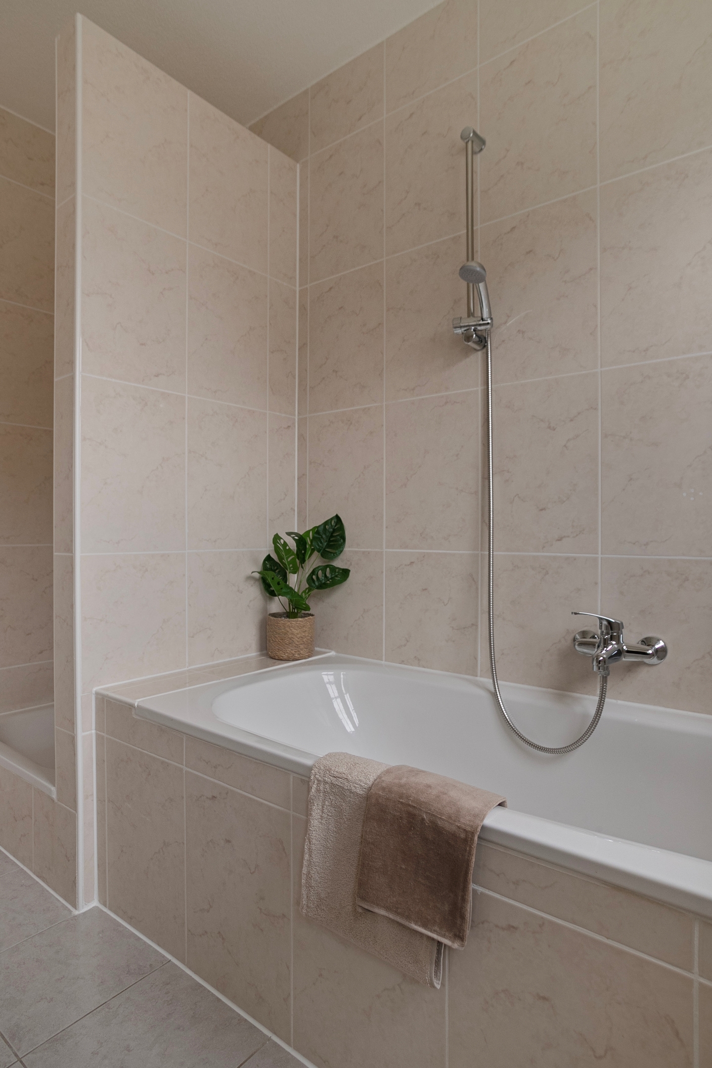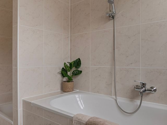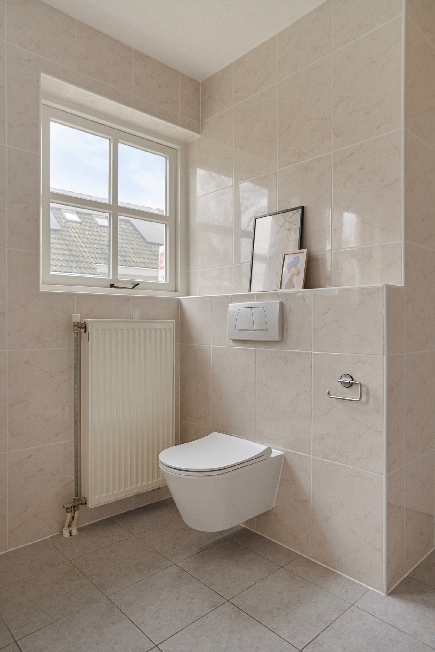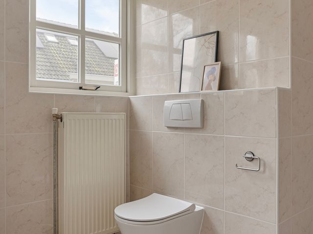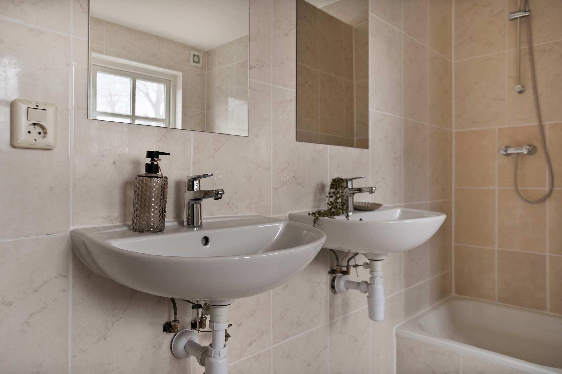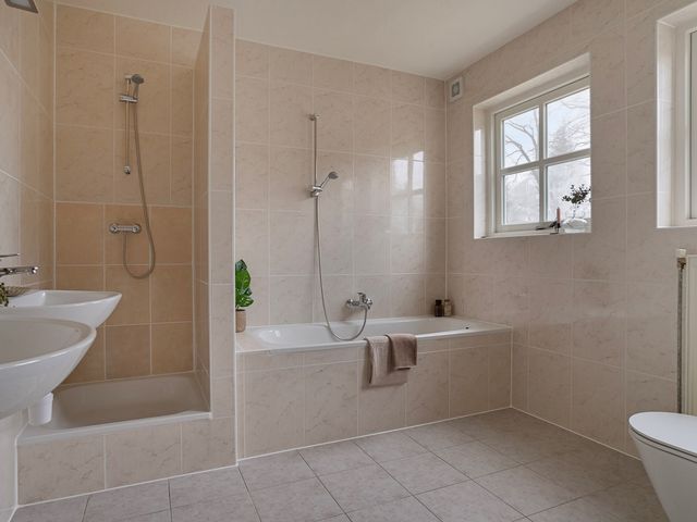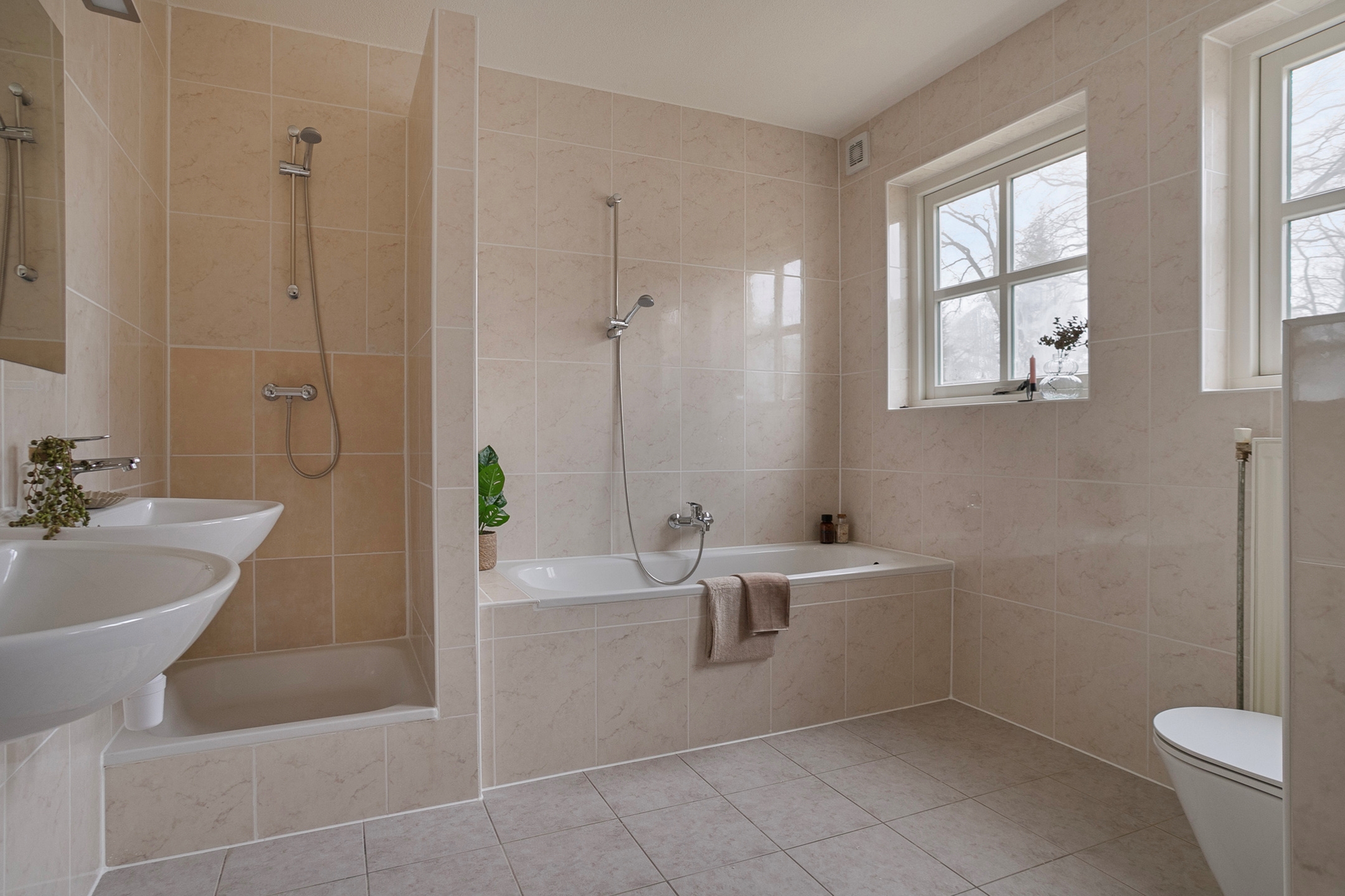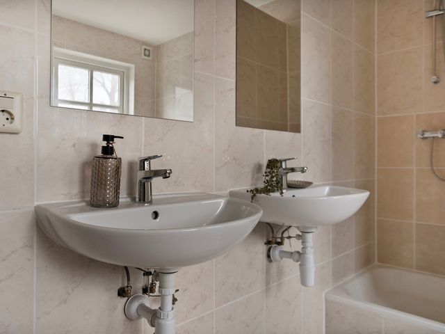 De badkamer is ingericht met douche, ligbad, dubbele wastafel, toilet en wasmachineaansluiting. De ruimte is geheel betegeld en is voorzien van een raampartij voor natuurlijke ventilatie.
