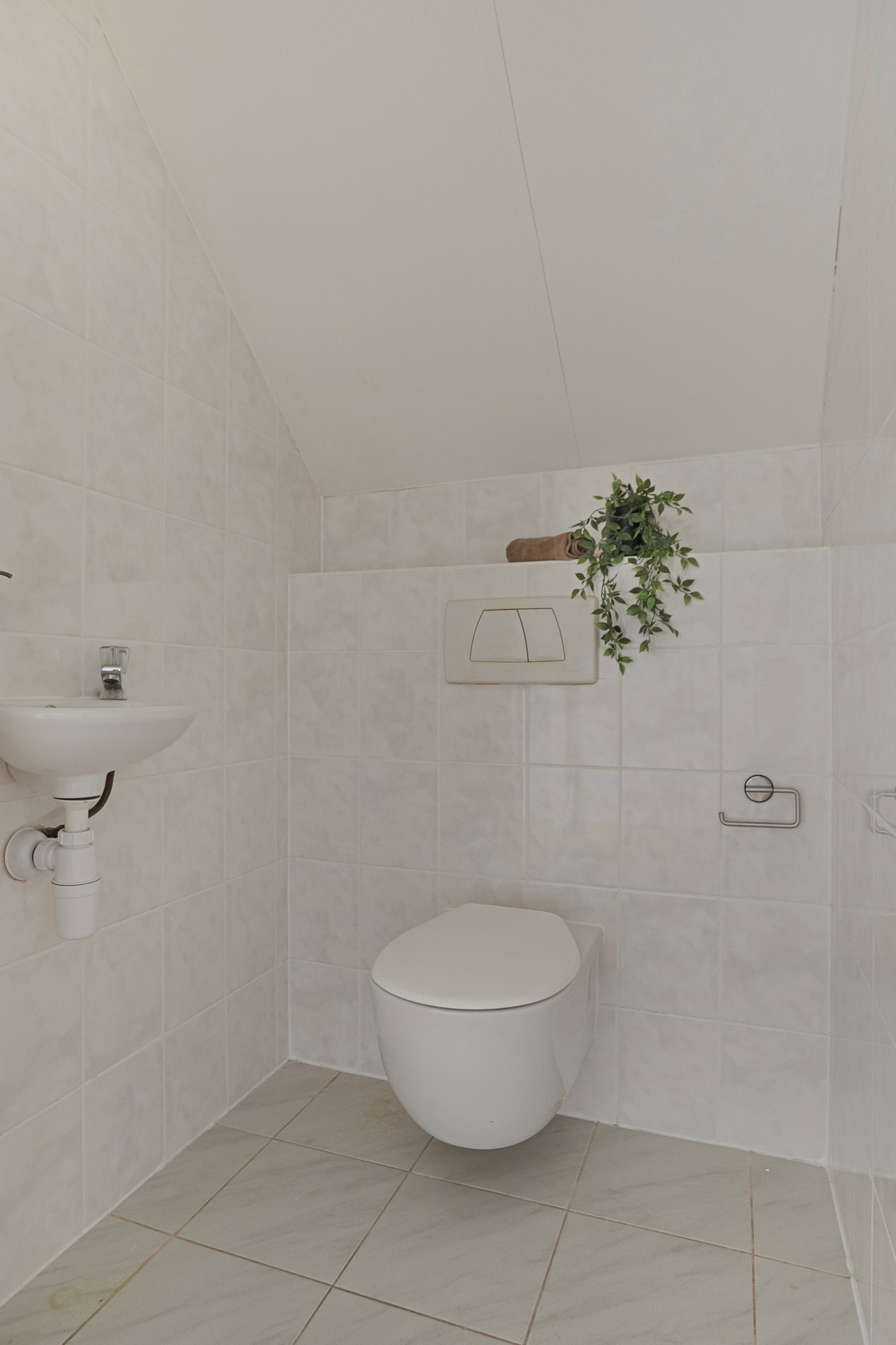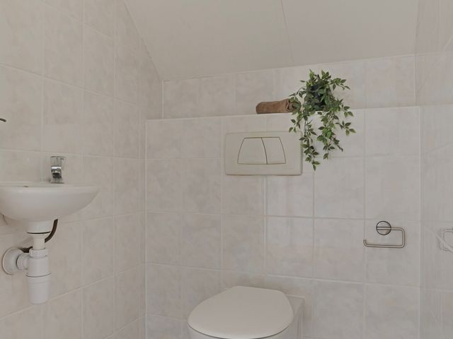 Het toilet is geheel betegeld en is voorzien van een wandcloset en een fonteintje.