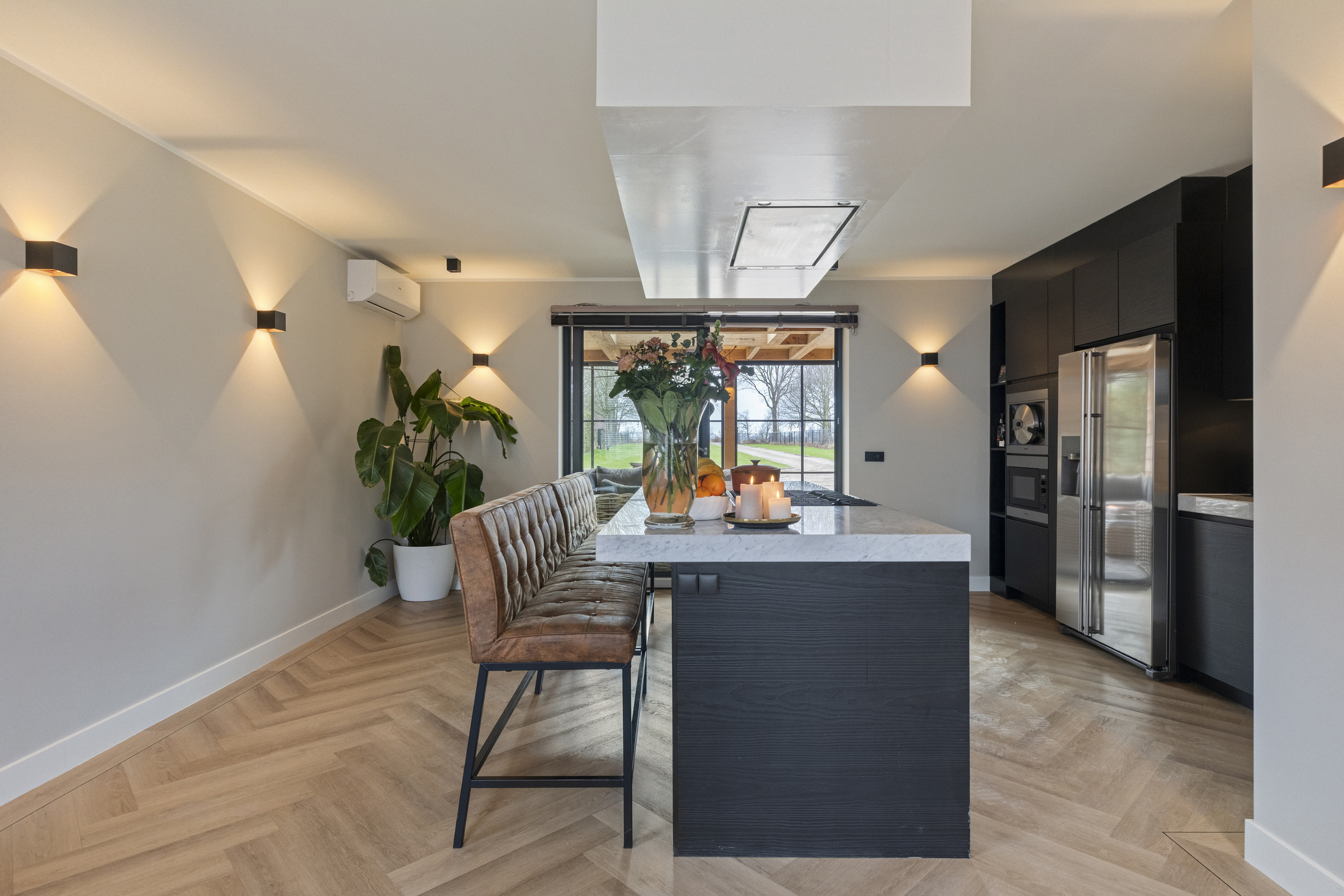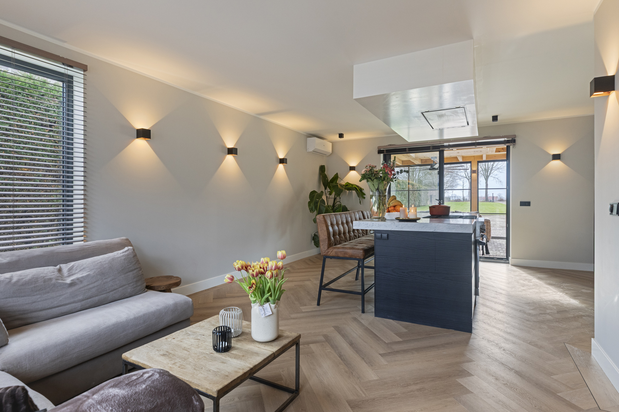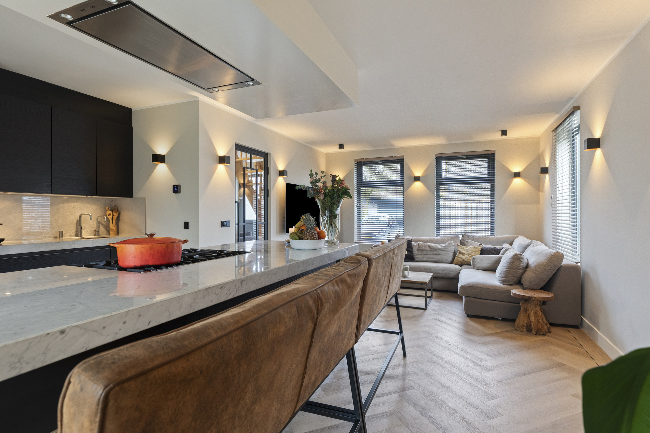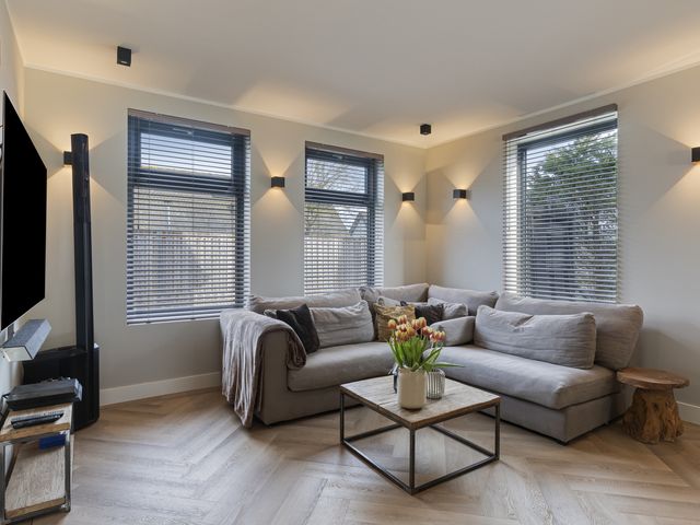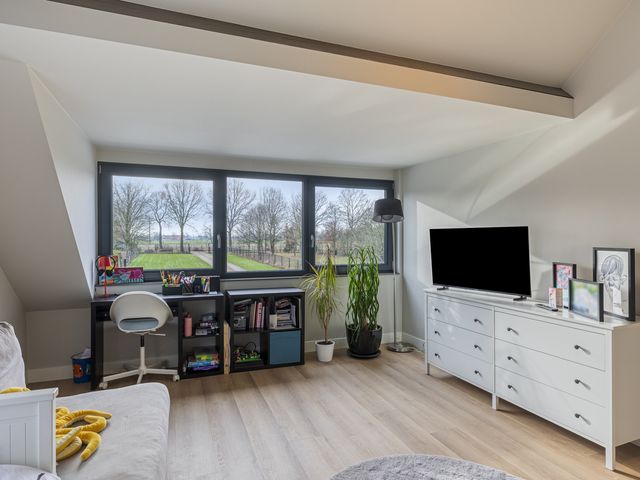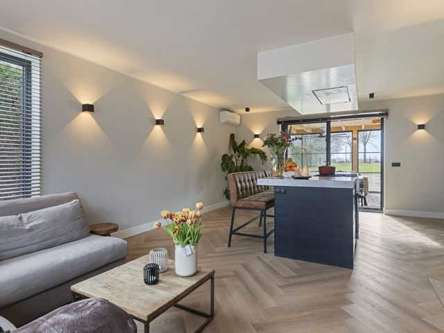 De woonkamer is een moderne maar sfeervolle en perfecte combinatie van licht, ruimte en uitzicht. Dankzij de royale raampartijen en de glazen pui geniet u hier van een schitterend, vrij uitzicht over de tuin en de omliggende landerijen. De ruimte is strak en modern afgewerkt met glad gestucte wanden en plafonds, voorzien van dimbare wand- en inbouwspots die de sfeer compleet maken.