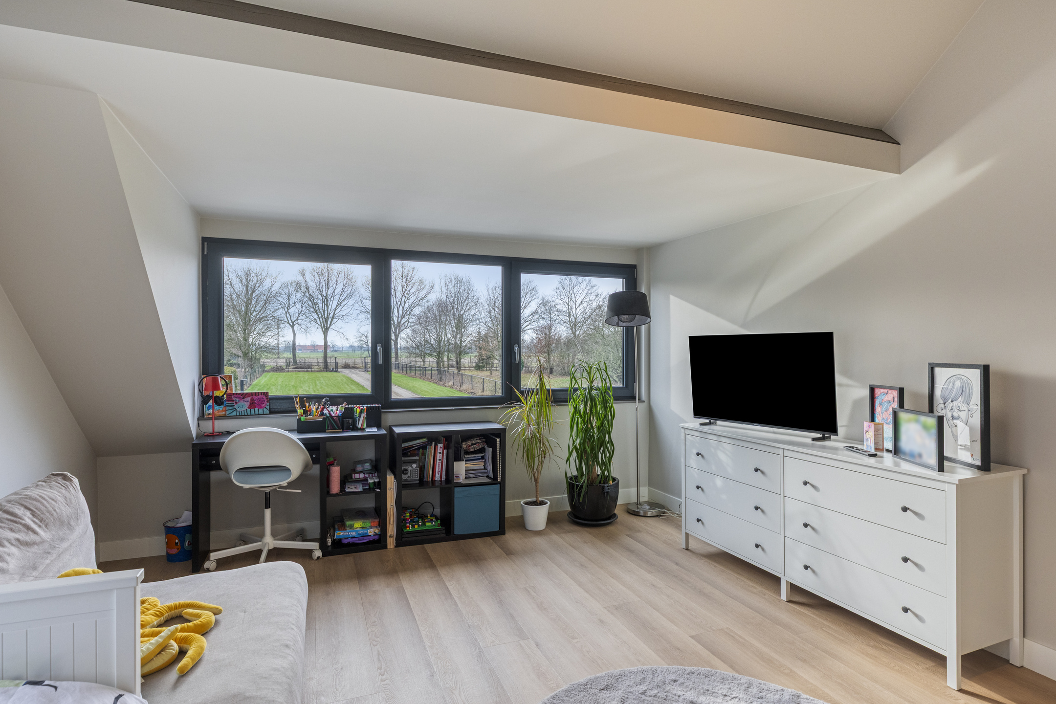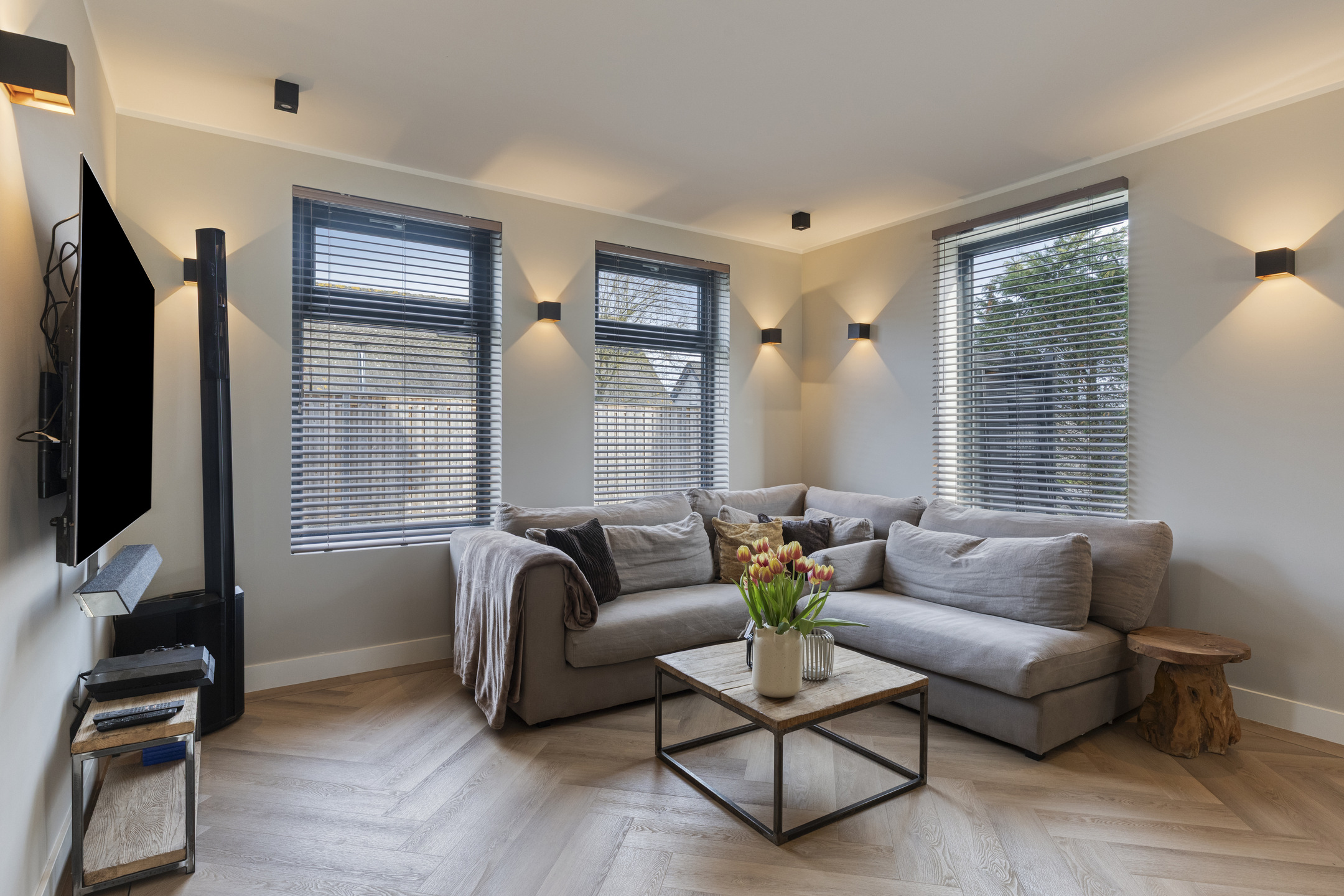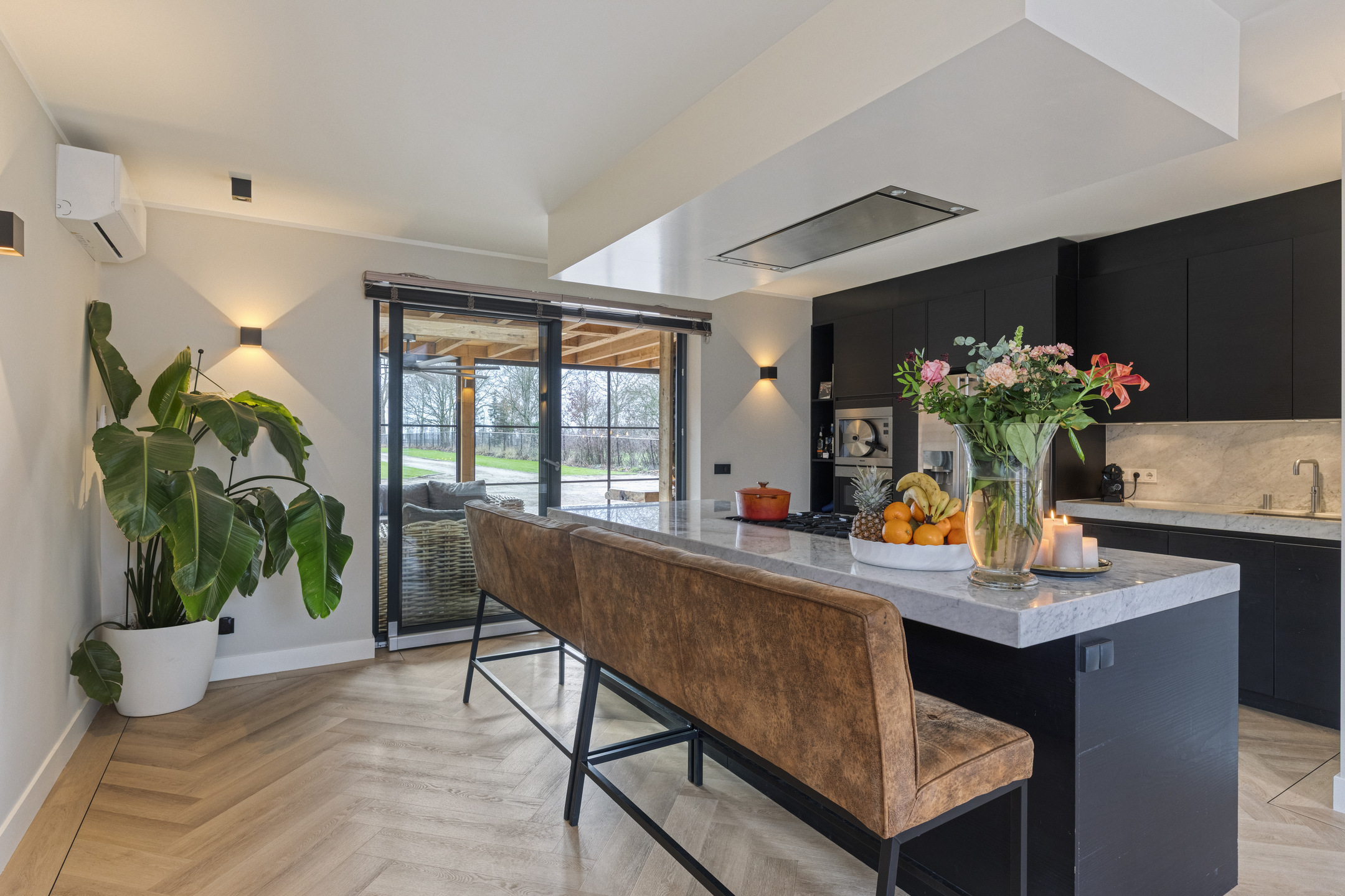 De woonkamer is een moderne maar sfeervolle en perfecte combinatie van licht, ruimte en uitzicht. Dankzij de royale raampartijen en de glazen pui geniet u hier van een schitterend, vrij uitzicht over de tuin en de omliggende landerijen. De ruimte is strak en modern afgewerkt met glad gestucte wanden en plafonds, voorzien van dimbare wand- en inbouwspots die de sfeer compleet maken.