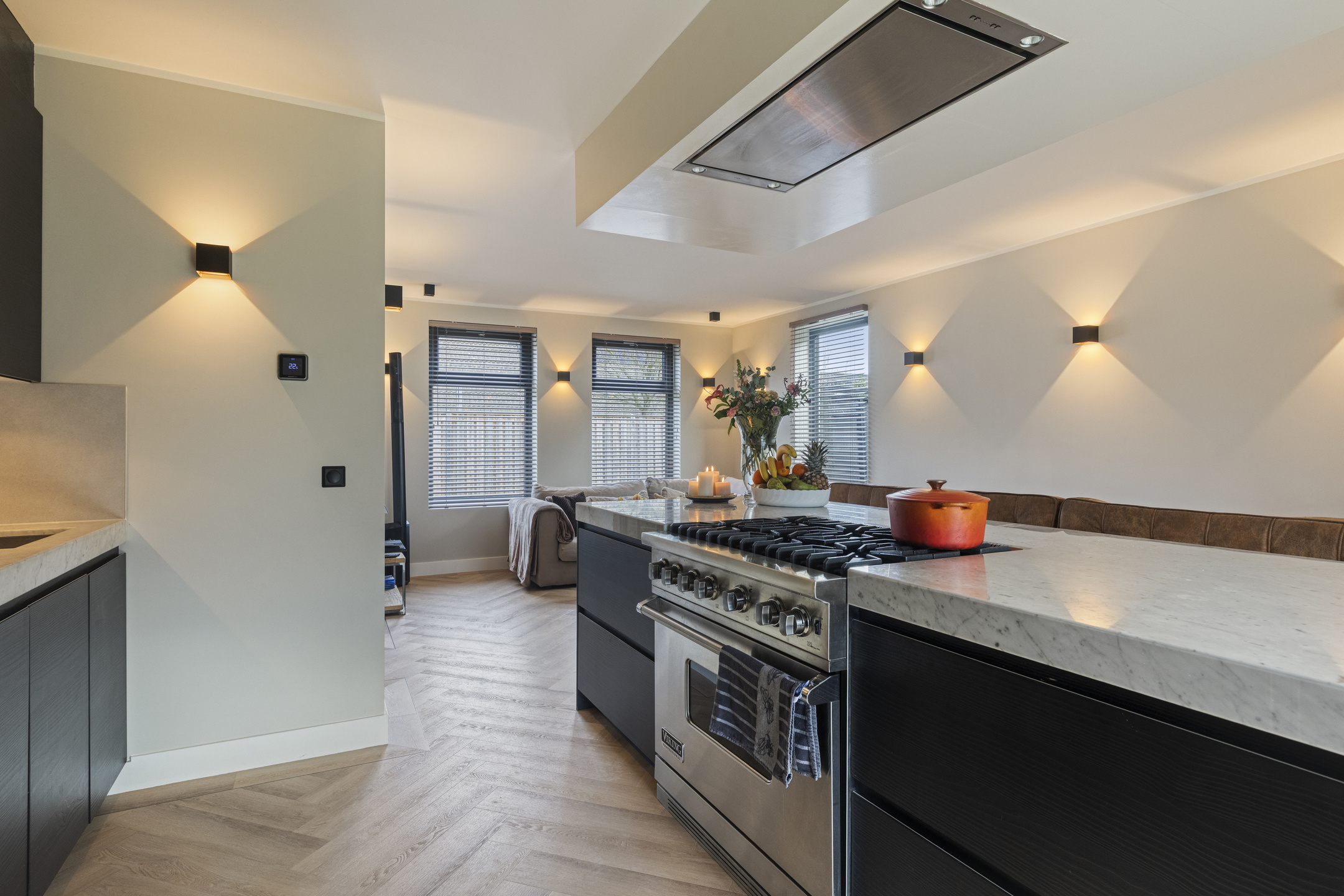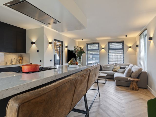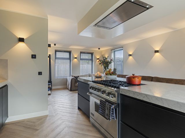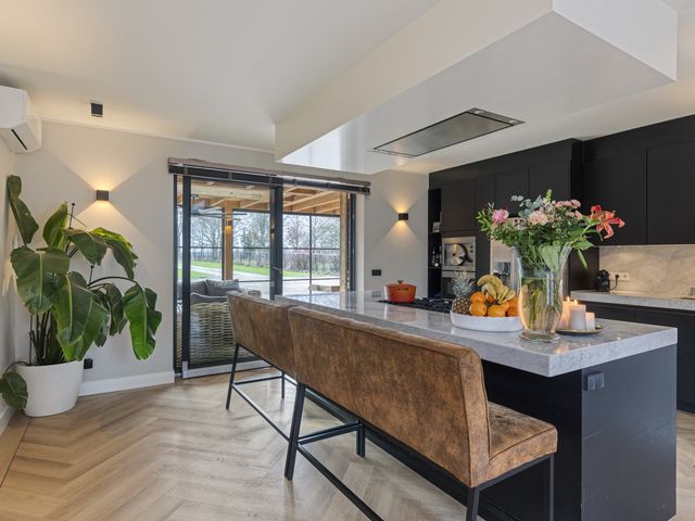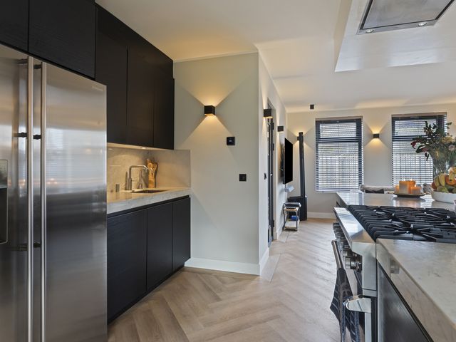 De luxe open keuken vormt het stijlvolle hart van de woning en is uitgevoerd met een royaal kookeiland voorzien van een elegant marmeren aanrechtblad. Het kookeiland biedt volop bergruimte dankzij diverse kasten en lades en is uitgerust met een 6-pits Viking Professional gasfornuis met oven en een afzuigunit. Daarnaast is de keuken alvast voorbereid op inductie koken door de reeds aanwezige loze leiding. Aan het kookeiland is ruimte gecreëerd voor een gezellige baropstelling, een heerlijke plek om samen te komen tijdens het koken en eten.