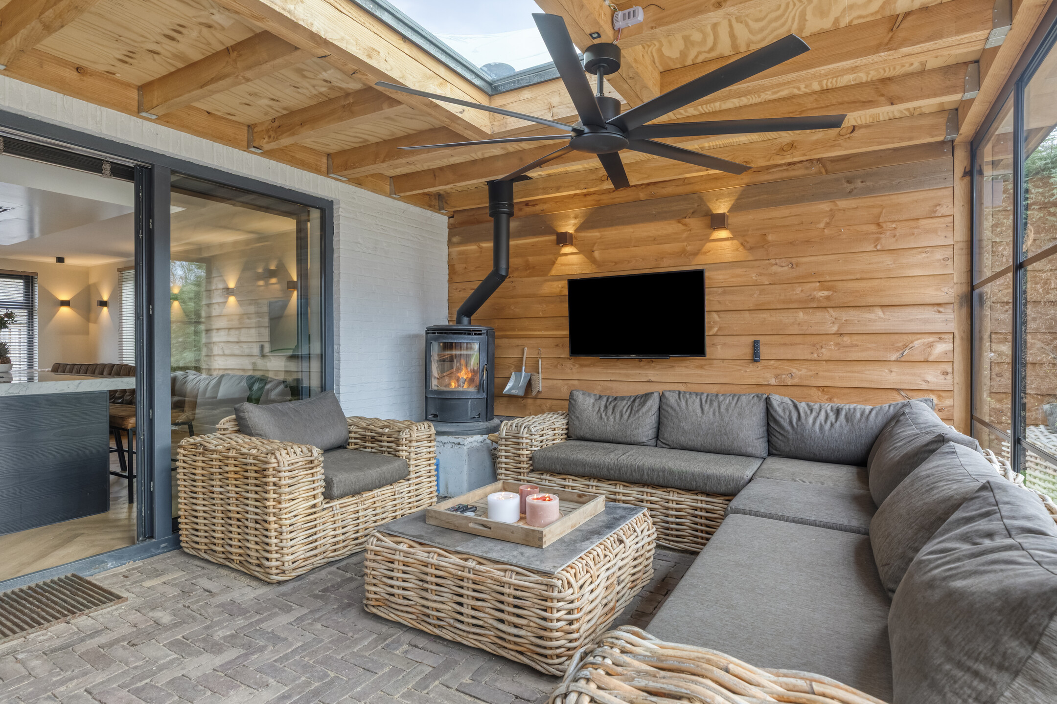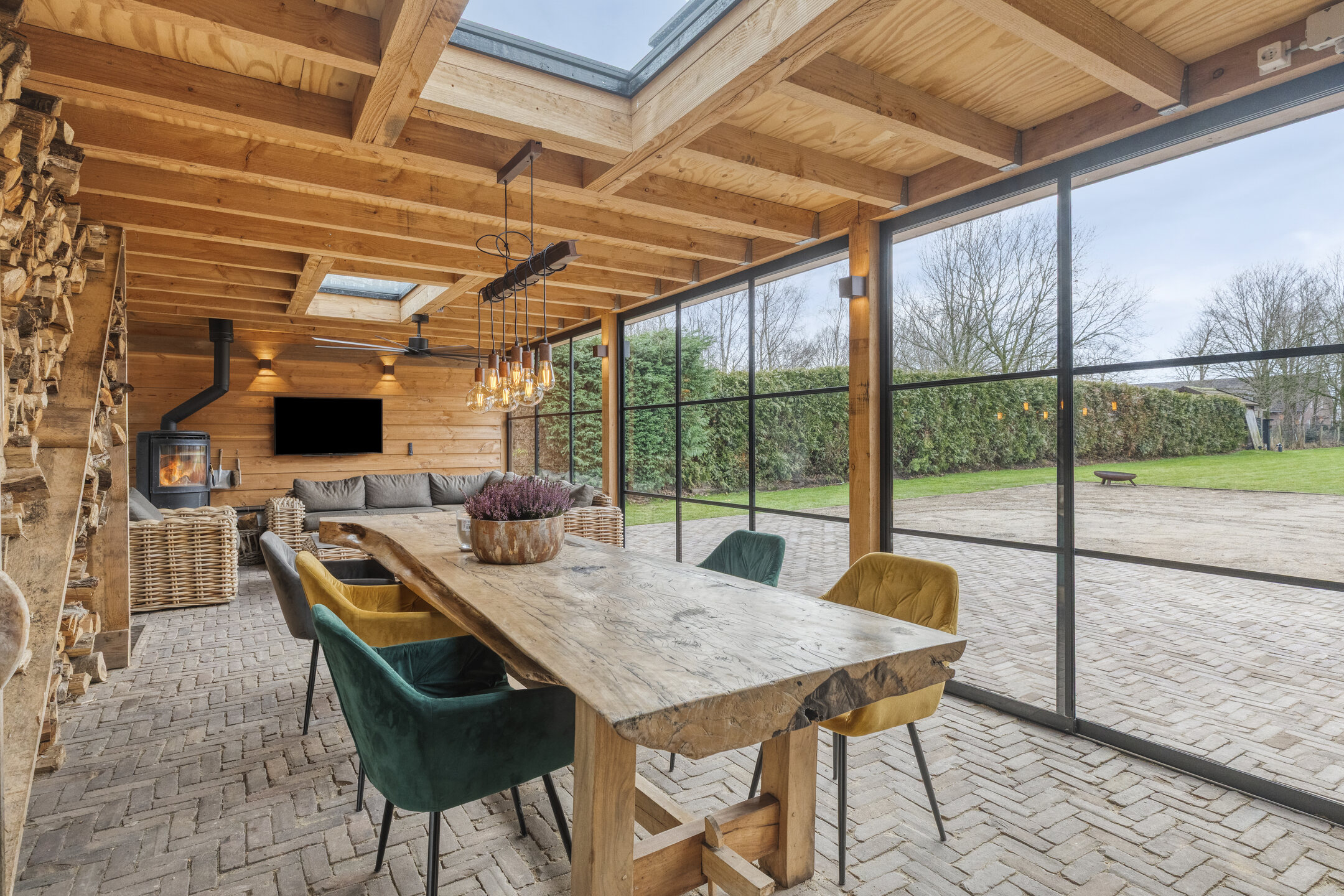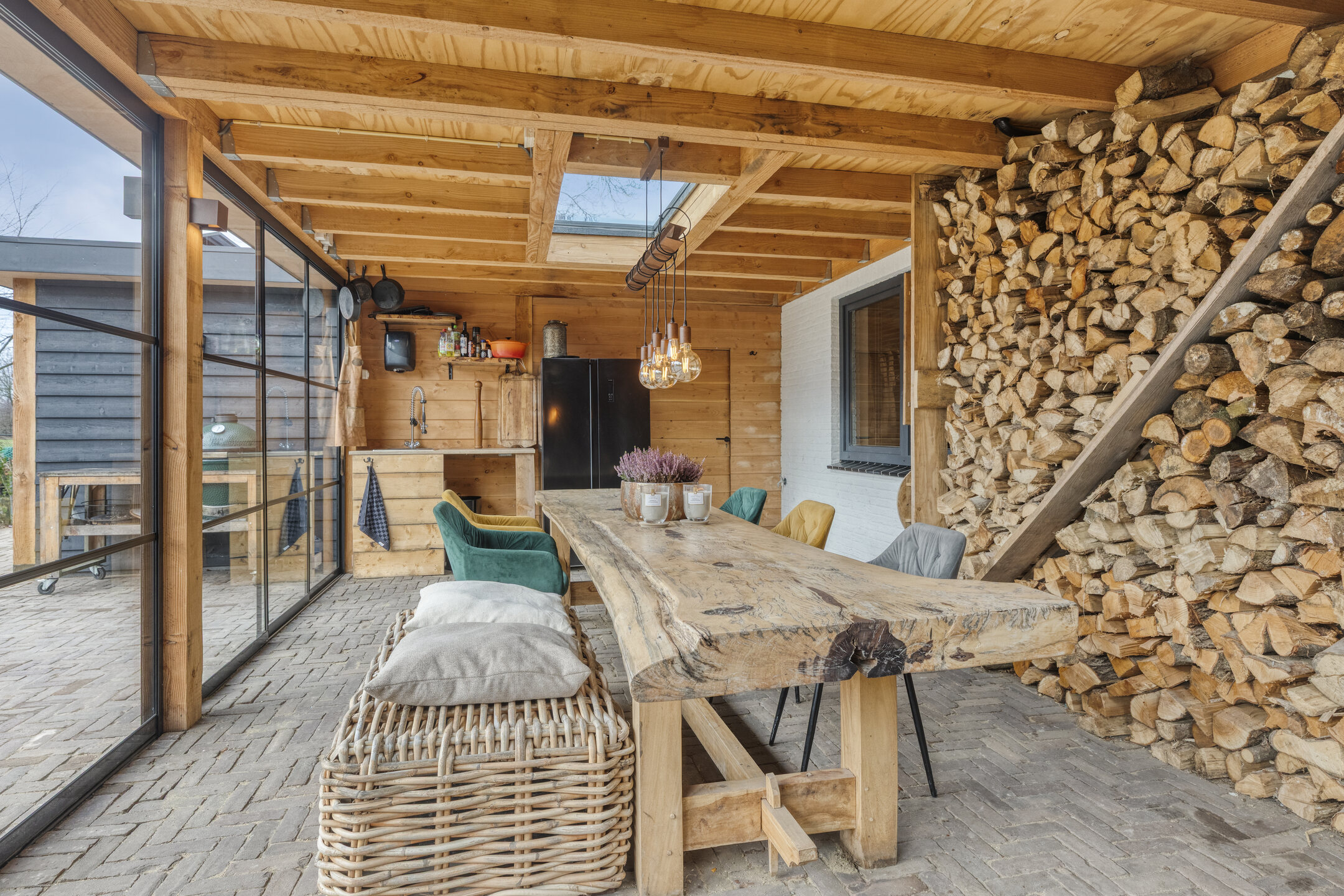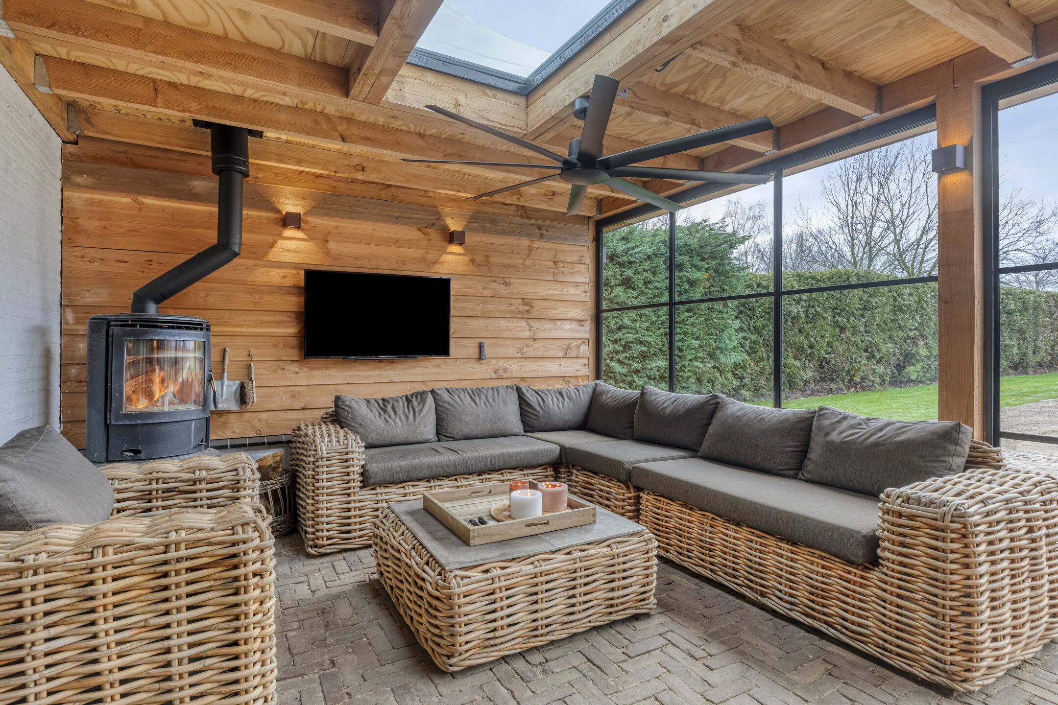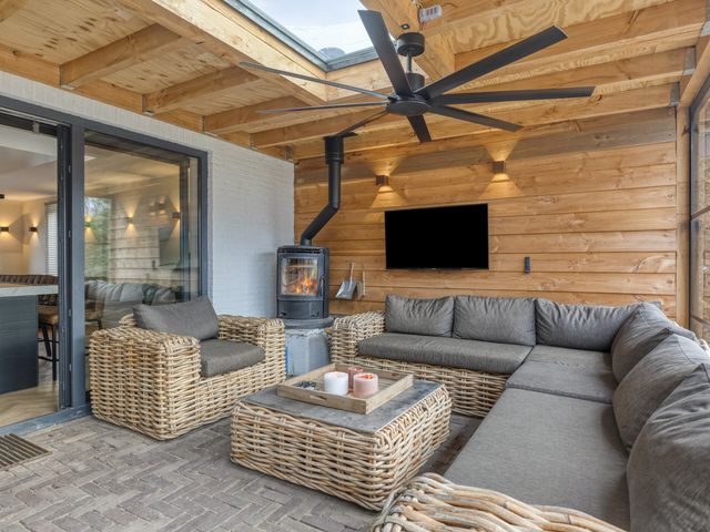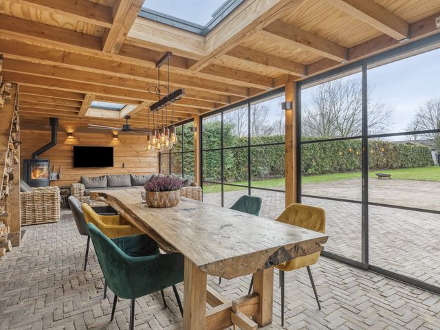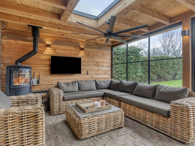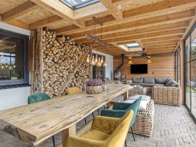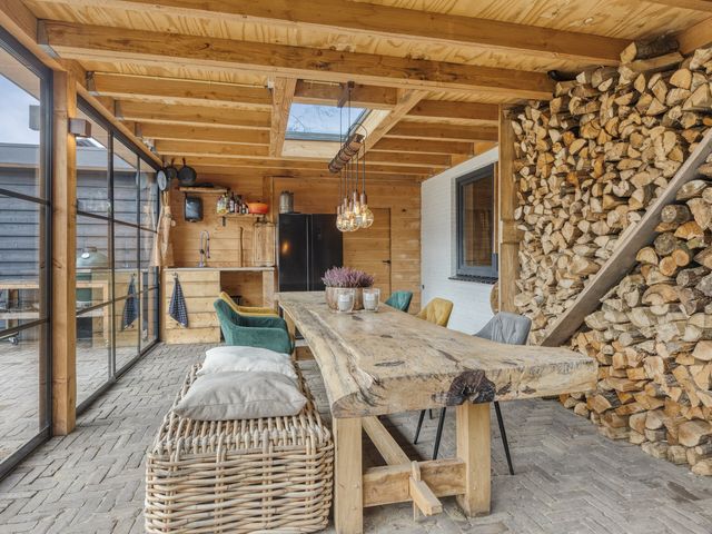 Voor de koelere dagen is de tuinkamer voorzien van een stoere houtkachel. Daarnaast beschikt deze ruimte over een praktisch aanrechtblok met zowel warm als koud water. De vloer is uitgevoerd in dezelfde bestrating als het aangrenzende terras, wat zorgt voor een naadloze overgang tussen binnen en buiten.