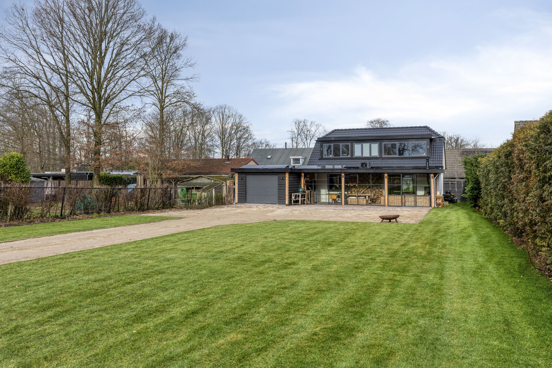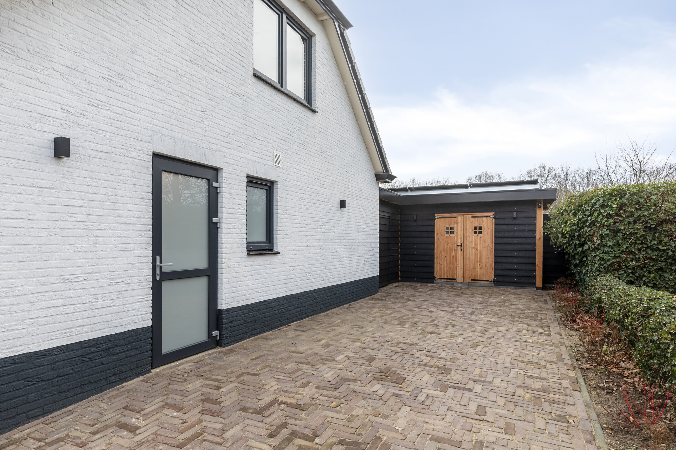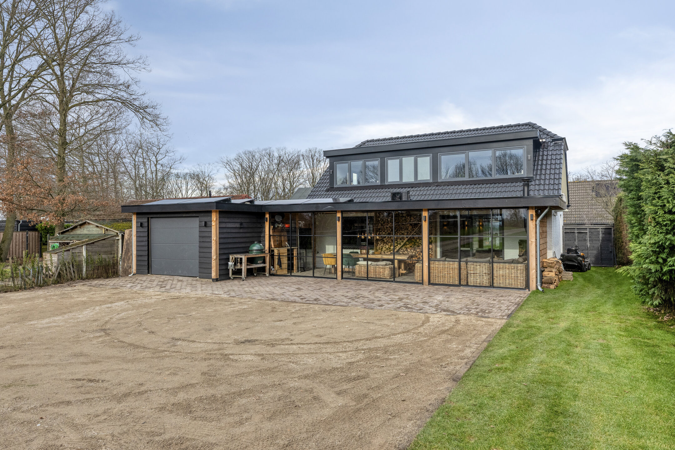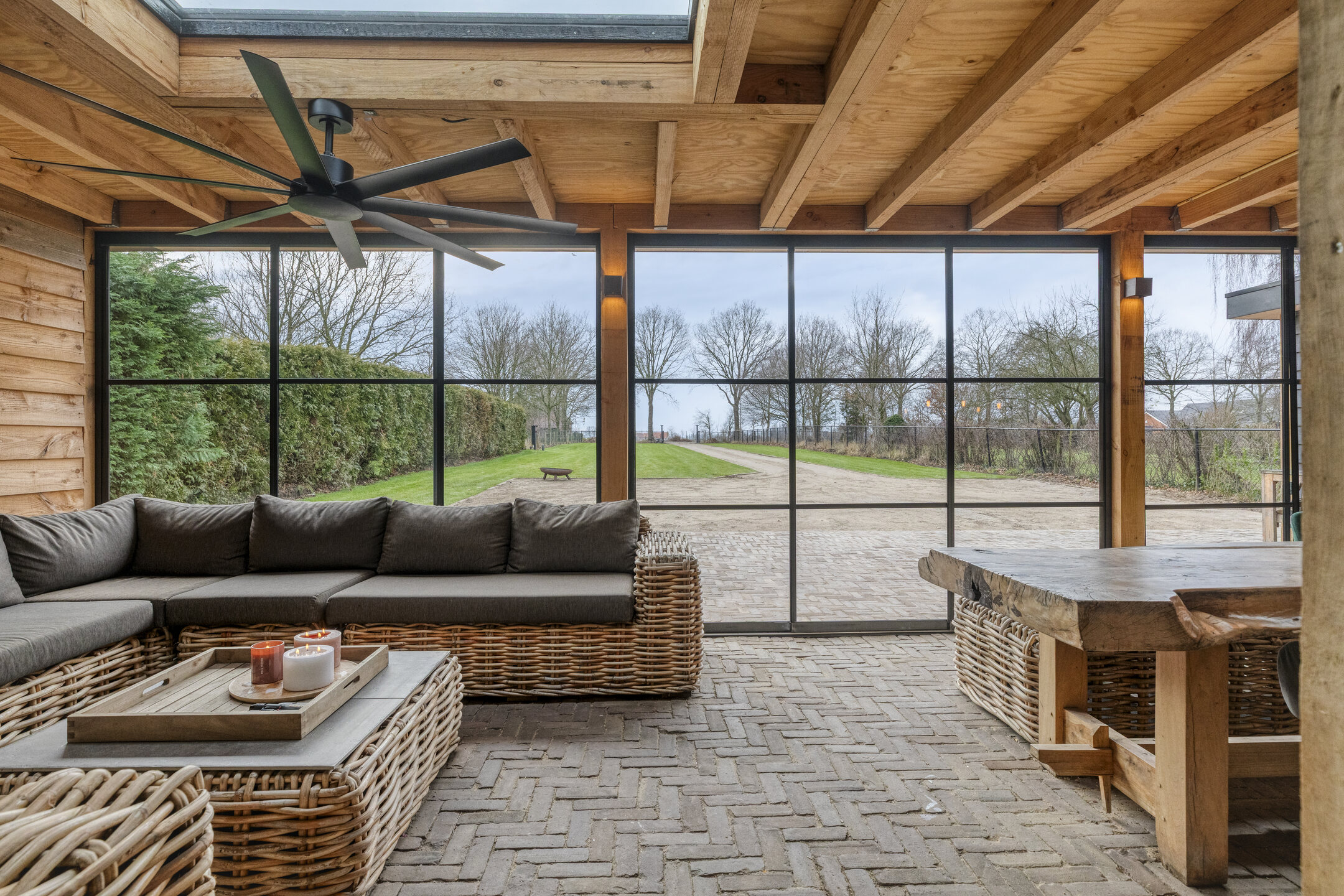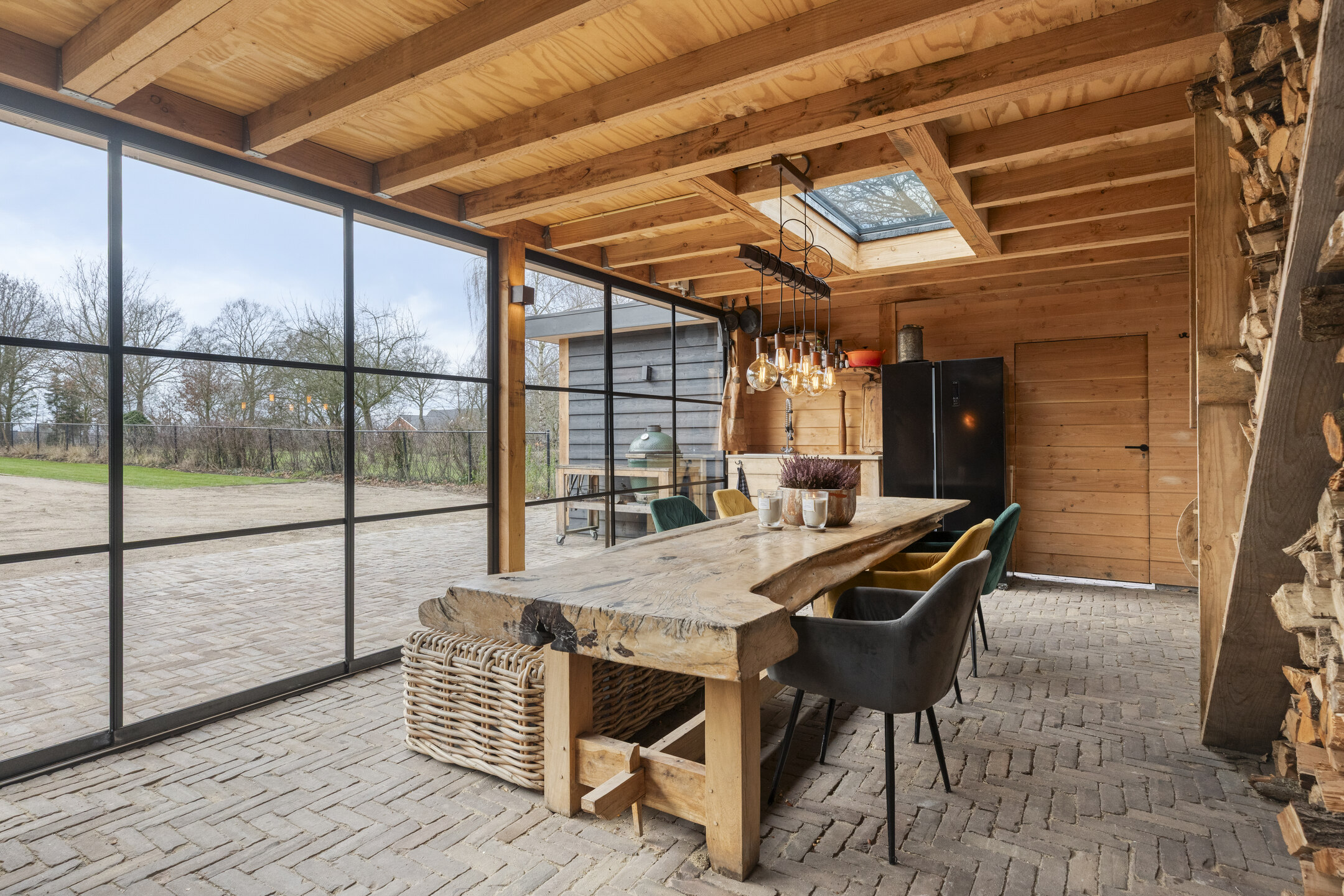Voor de koelere dagen is de tuinkamer voorzien van een stoere houtkachel. Daarnaast beschikt deze ruimte over een praktisch aanrechtblok met zowel warm als koud water. De vloer is uitgevoerd in dezelfde bestrating als het aangrenzende terras, wat zorgt voor een naadloze overgang tussen binnen en buiten.