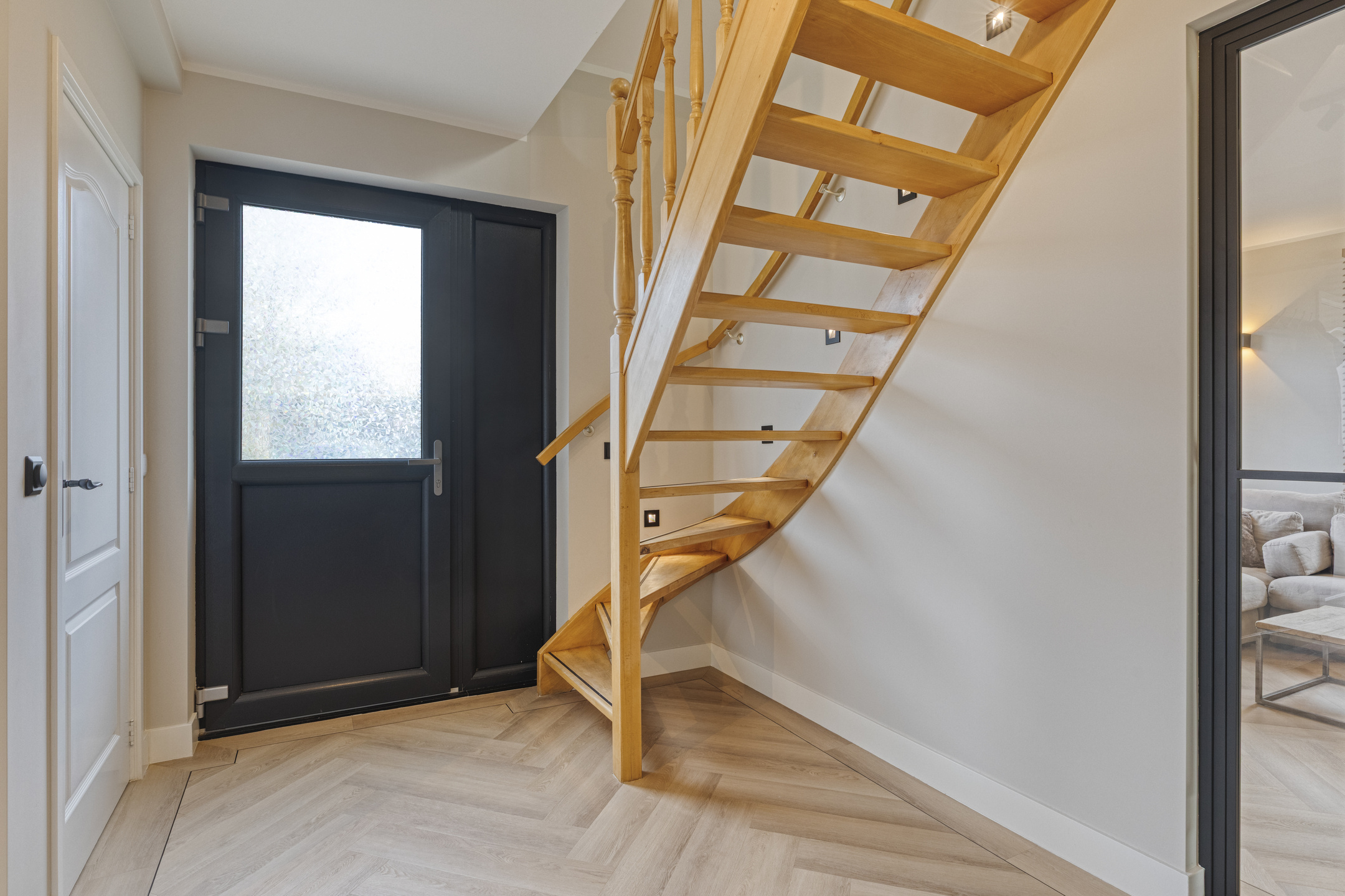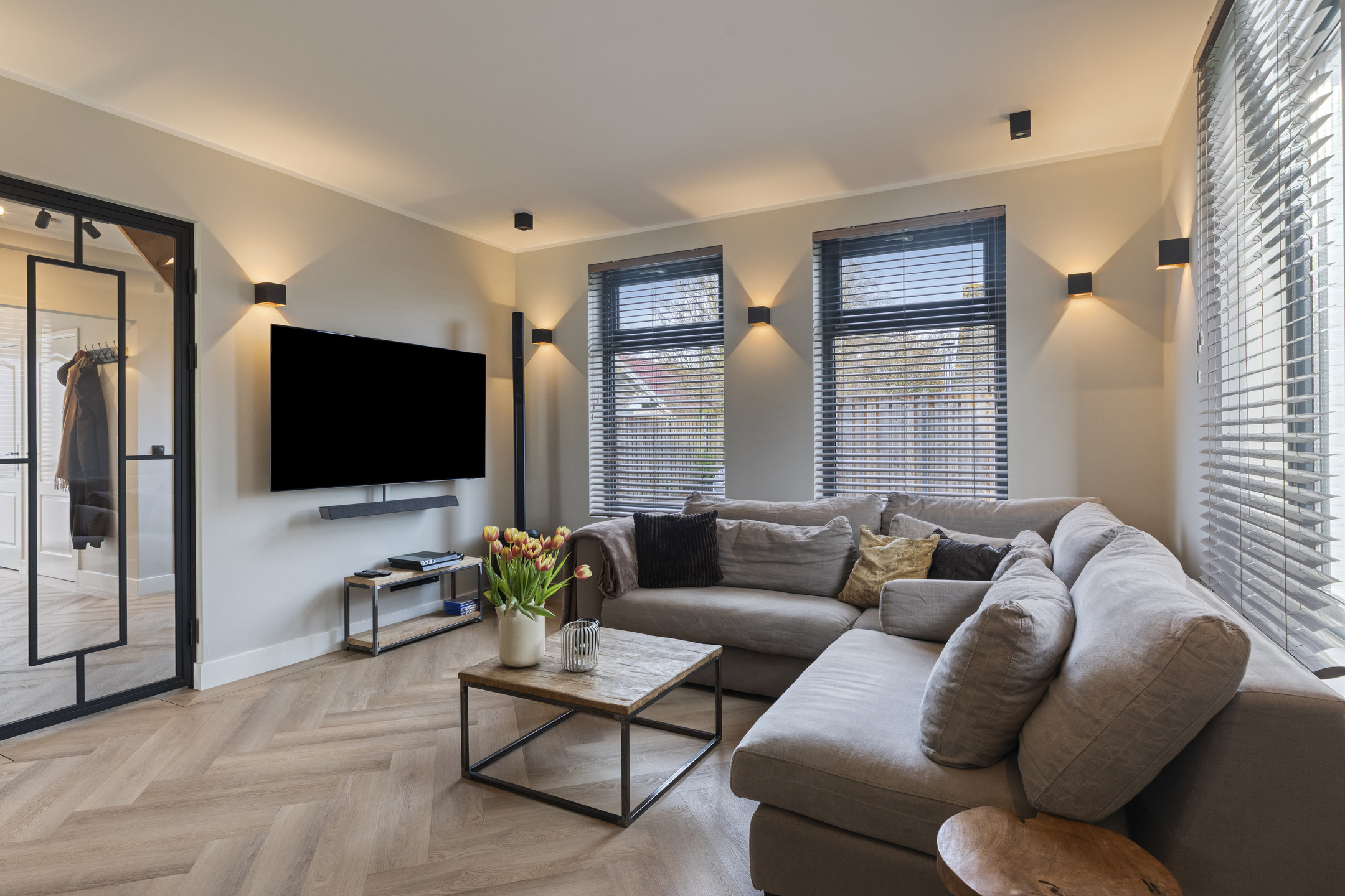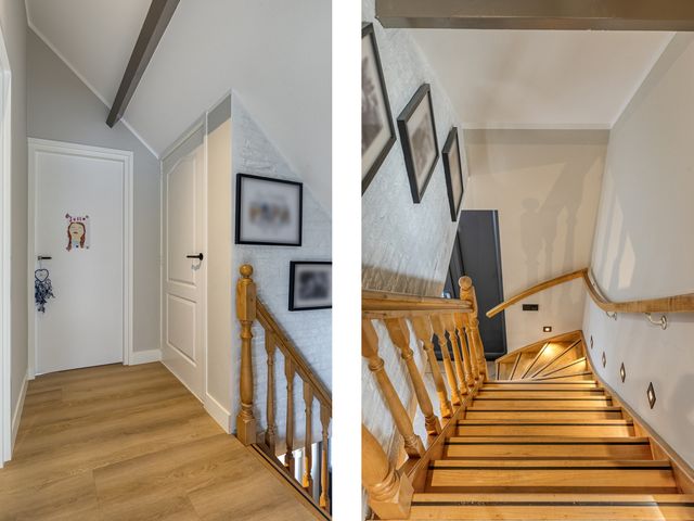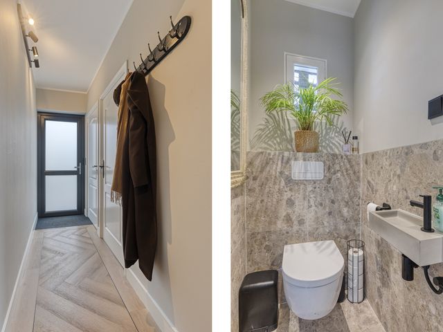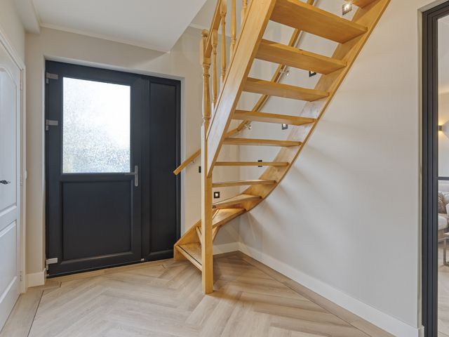 Bij binnenkomst in de stijlvolle ontvangsthal wordt direct duidelijk dat deze woning met oog voor detail en eigentijdse sfeer is afgewerkt. De ruime hal biedt door middel van een fraaie stalen deur toegang tot de woonkamer. Vanuit de hal is ook de entree naar de slaapkamer met badkamer ensuite, de meterkast, de wasruimte, de toiletruimte en trapopgang naar de eerste verdieping. De gehele begane grond is voorzien van een prachtige pvc-vloer in visgraatmotief met bies, wat zorgt voor een chique en warme uitstraling.