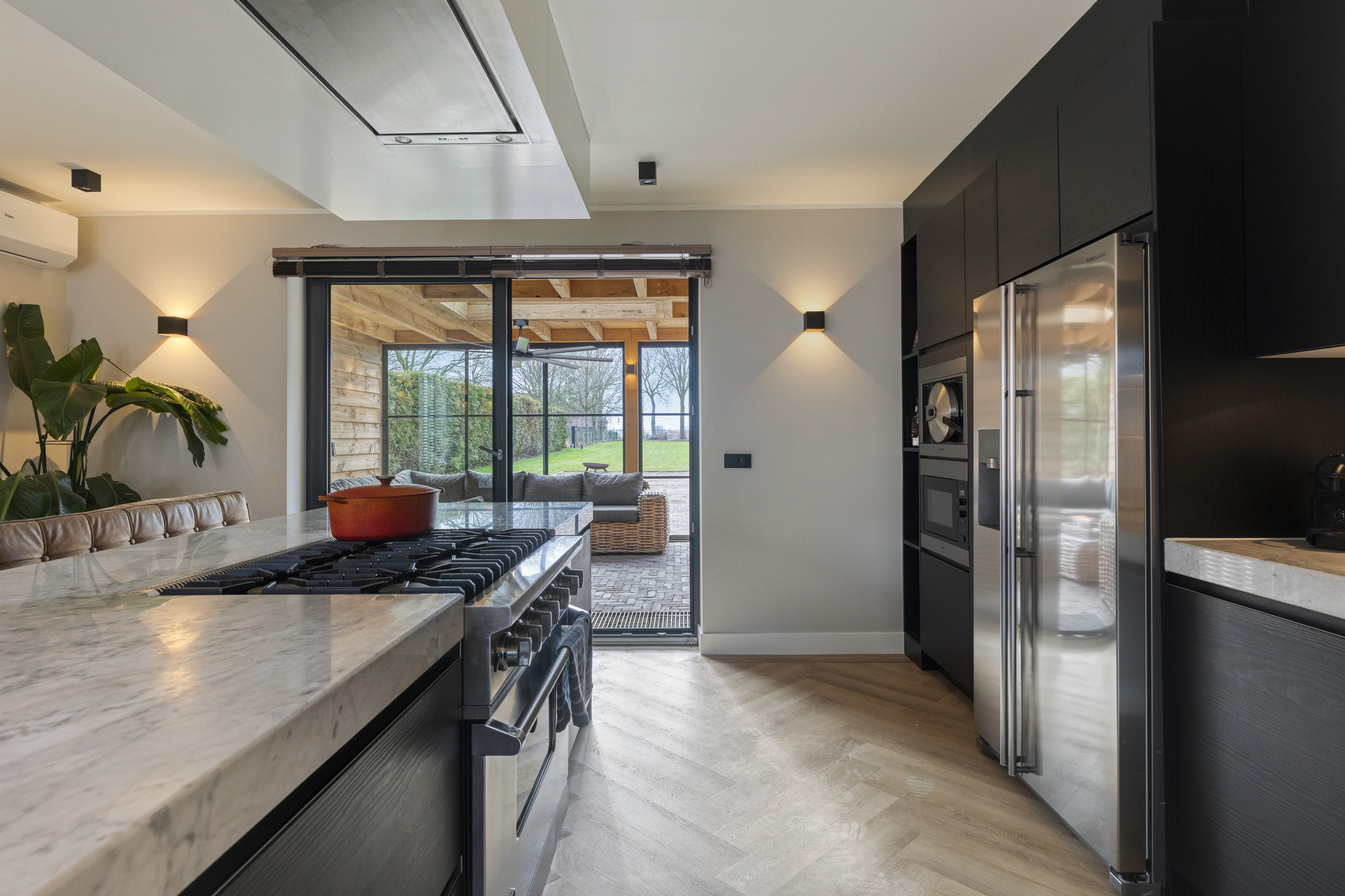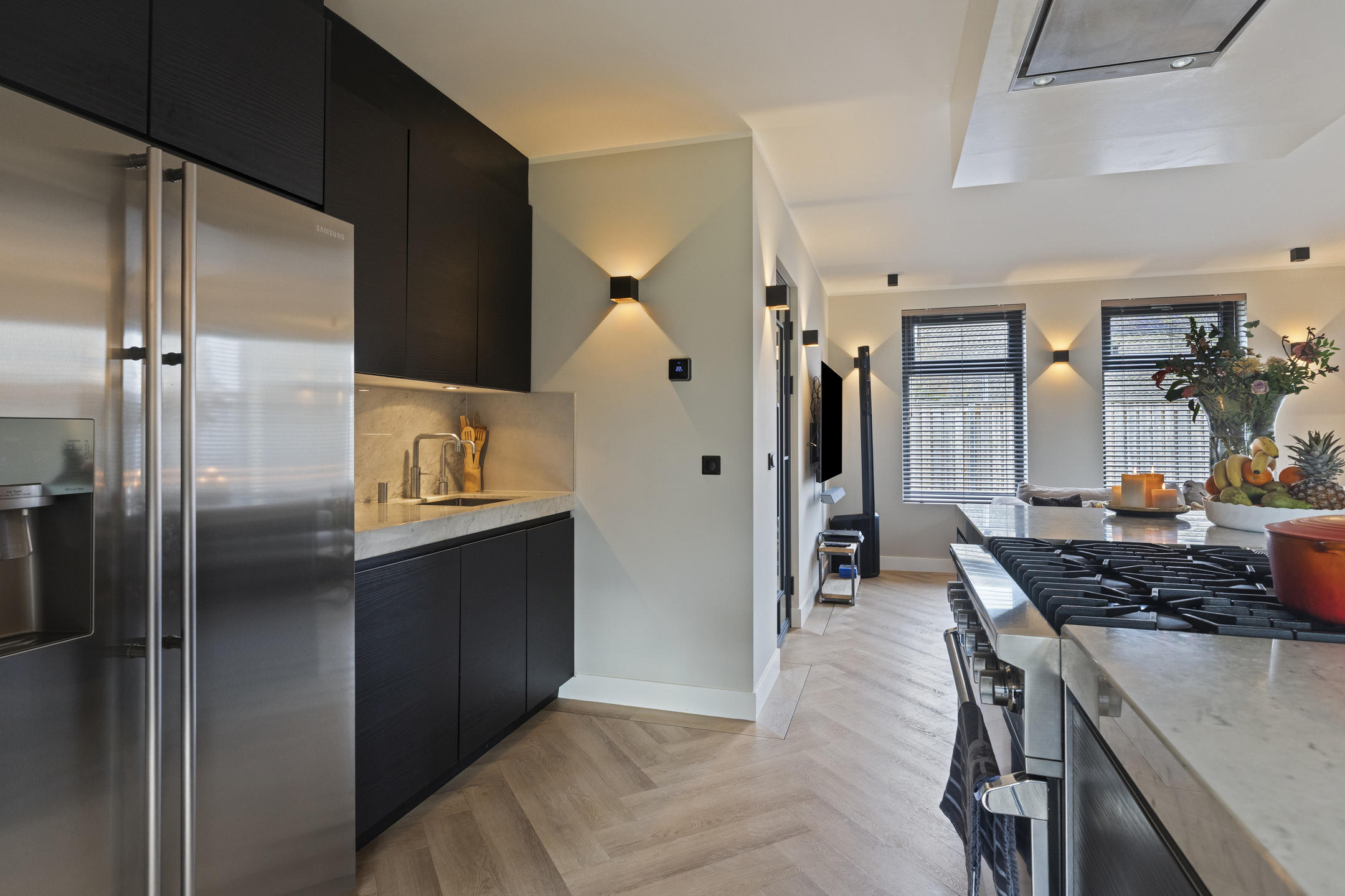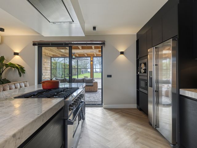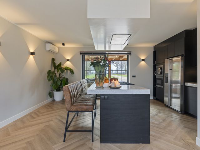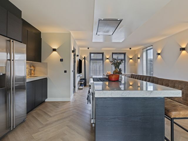 Langs de wand bevindt zich een compleet en hoogwaardig keukenblok met een spoelbak en Quooker-kraan, een vaatwasser, een Amerikaanse koelkast met ijsblokjesfunctie, een Miele powersteamer en een magnetron. Deze keuken combineert luxe, functionaliteit en comfort en is daarmee perfect voor de echte thuiskok .