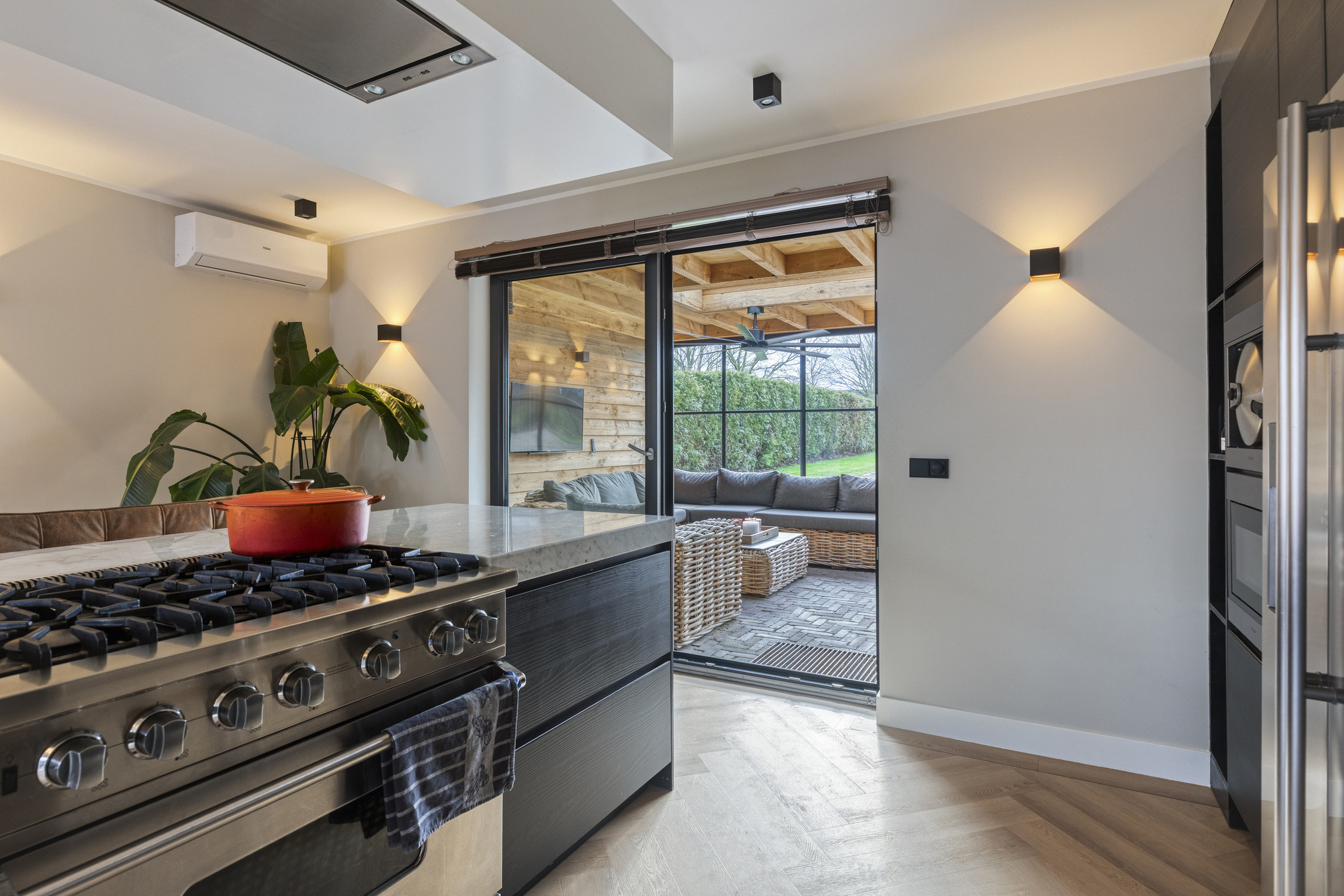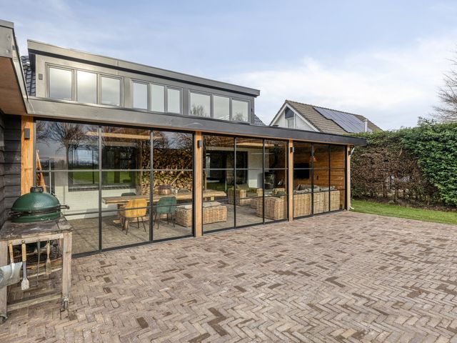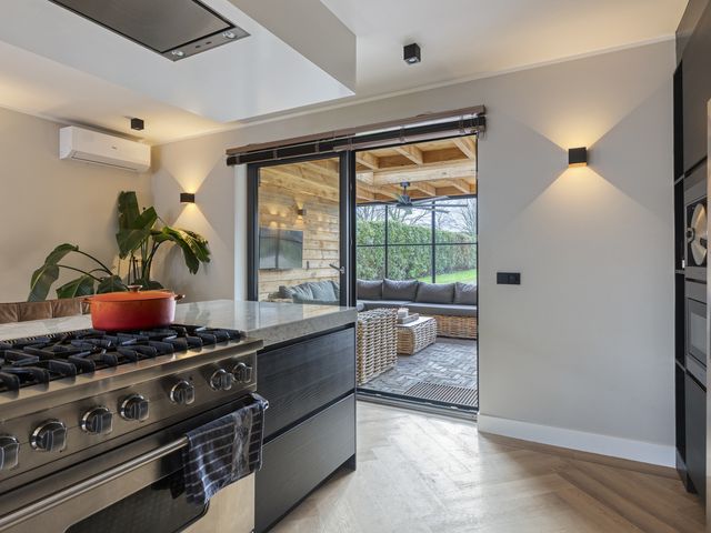 Vanuit de woonkamer met open keuken is de aangebouwde tuinkamer bereikbaar, een heerlijke plek om in elk seizoen te verblijven en optimaal te genieten van het binnen- en buitenleven. Twee lichtkoepels zorgen voor een prachtige lichtval van natuurlijk daglicht, terwijl de steellook glazen pui volledig kan worden geopend voor een directe verbinding met de tuin.