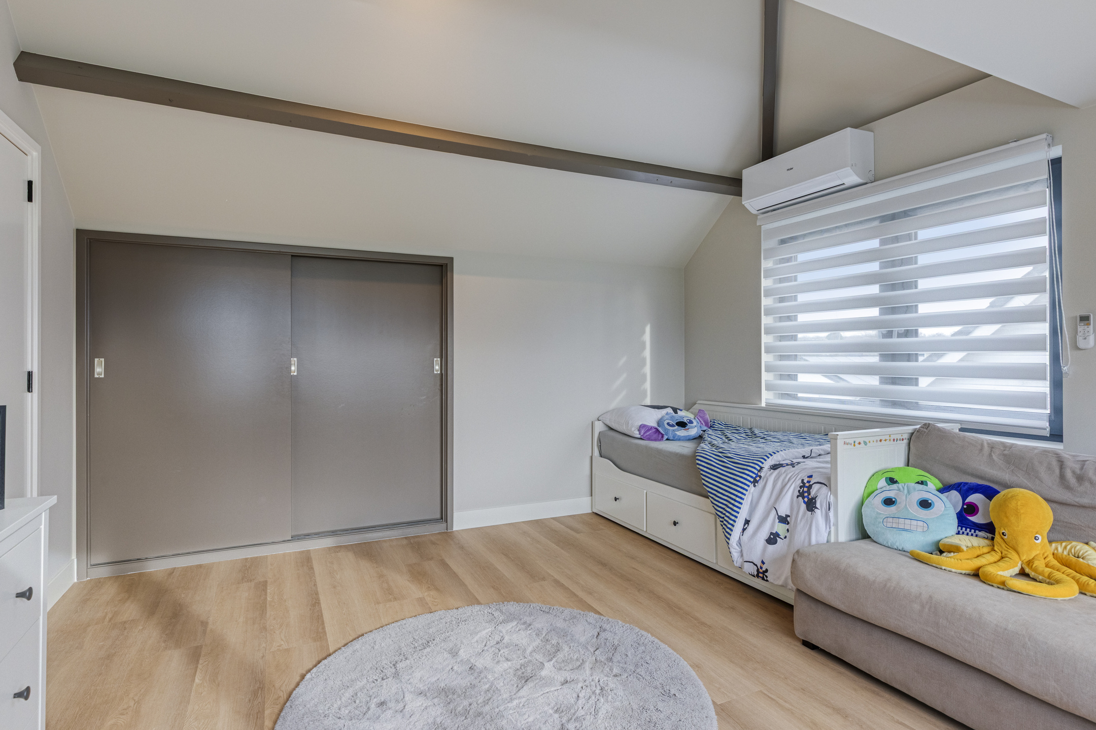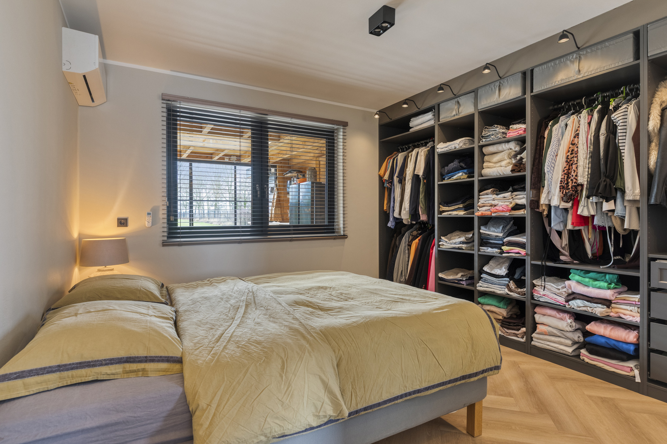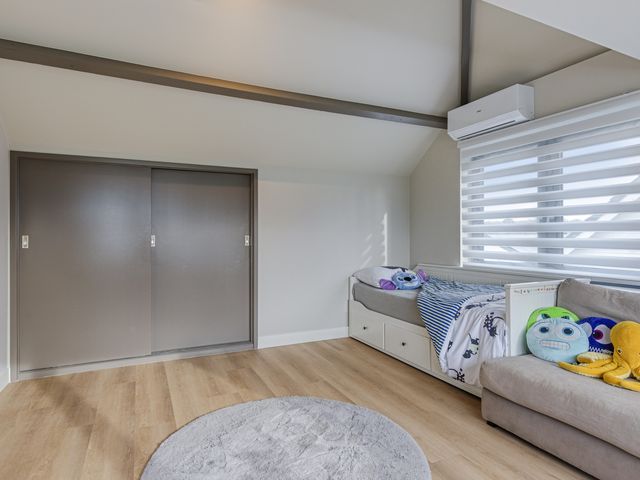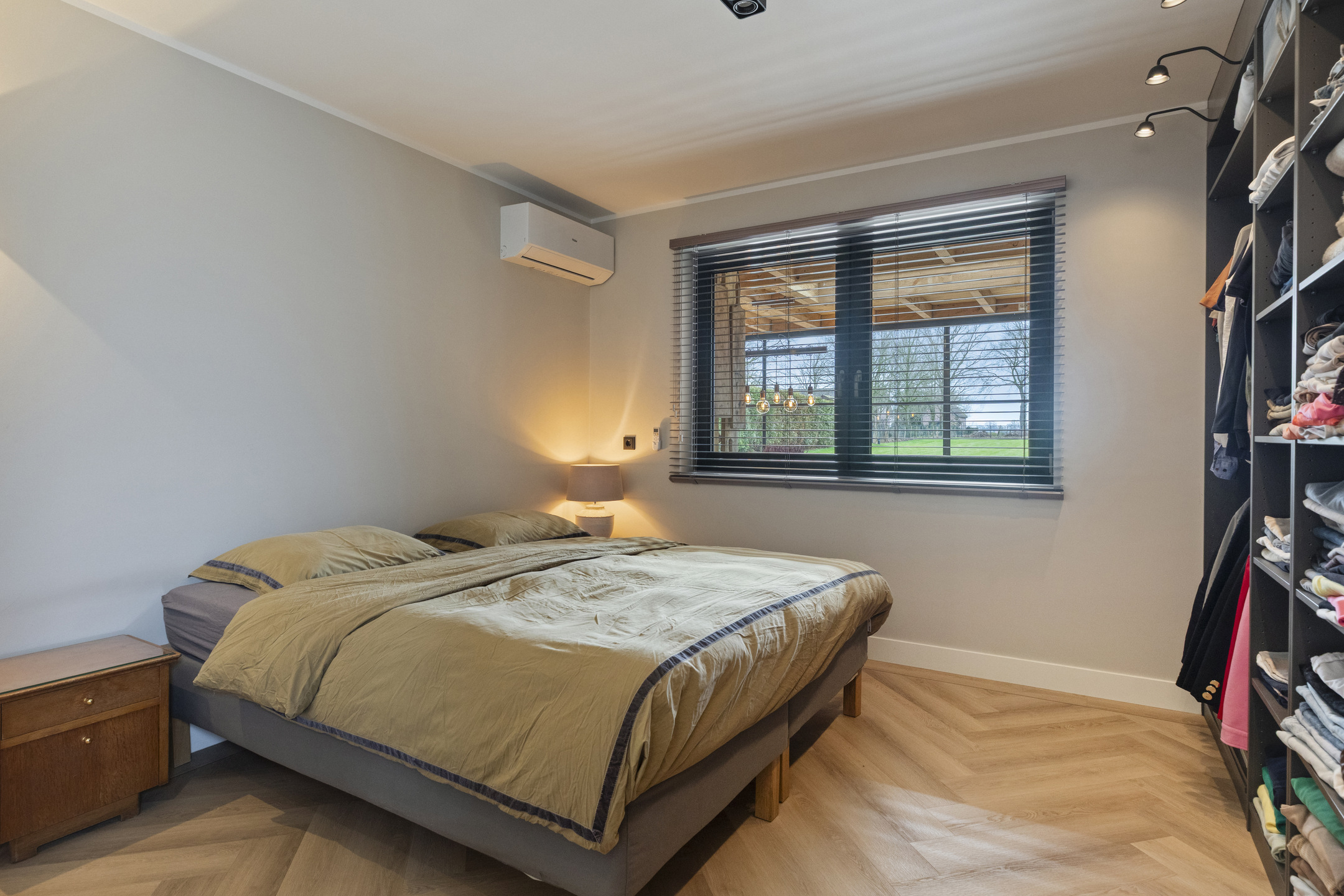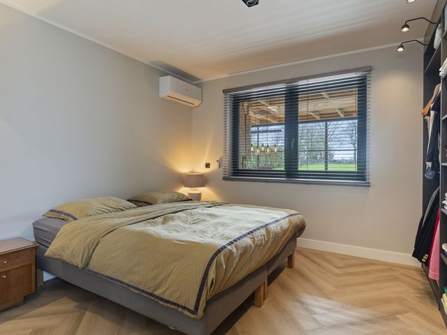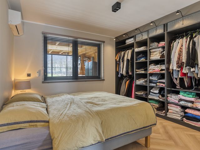 De fijne slaapkamer op de begane grond is een comfortabele en stijlvolle ruimte, afgewerkt met strak gestucte wanden en eveneens voorzien van dimbare wandverlichting. Daarnaast beschikt deze slaapkamer over airconditioning die zowel kan koelen als verwarmen en een grote inbouwkast, waardoor comfort en functionaliteit perfect samenkomen. Vanuit de slaapkamer is de moderne badkamer en suite direct toegankelijk.
