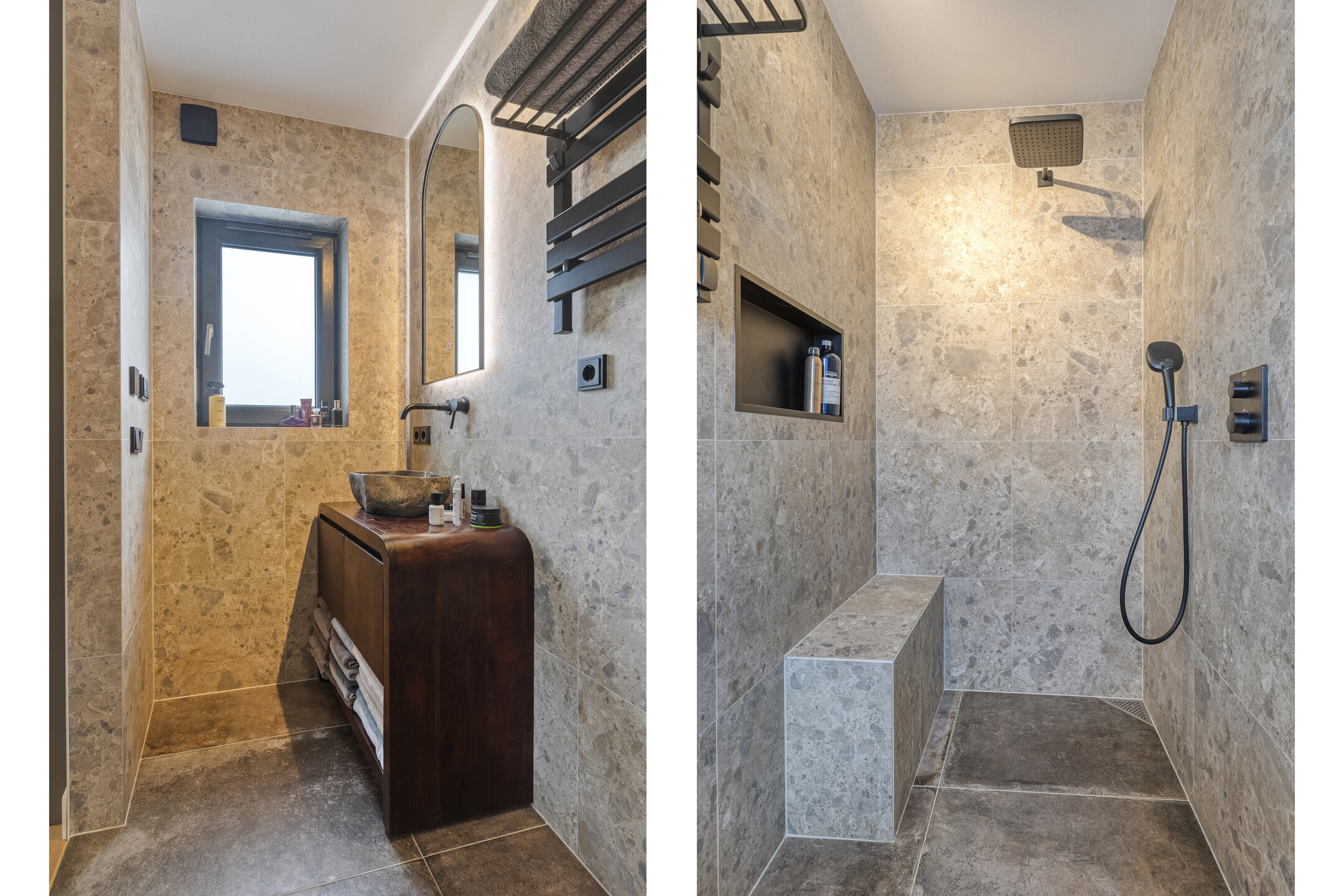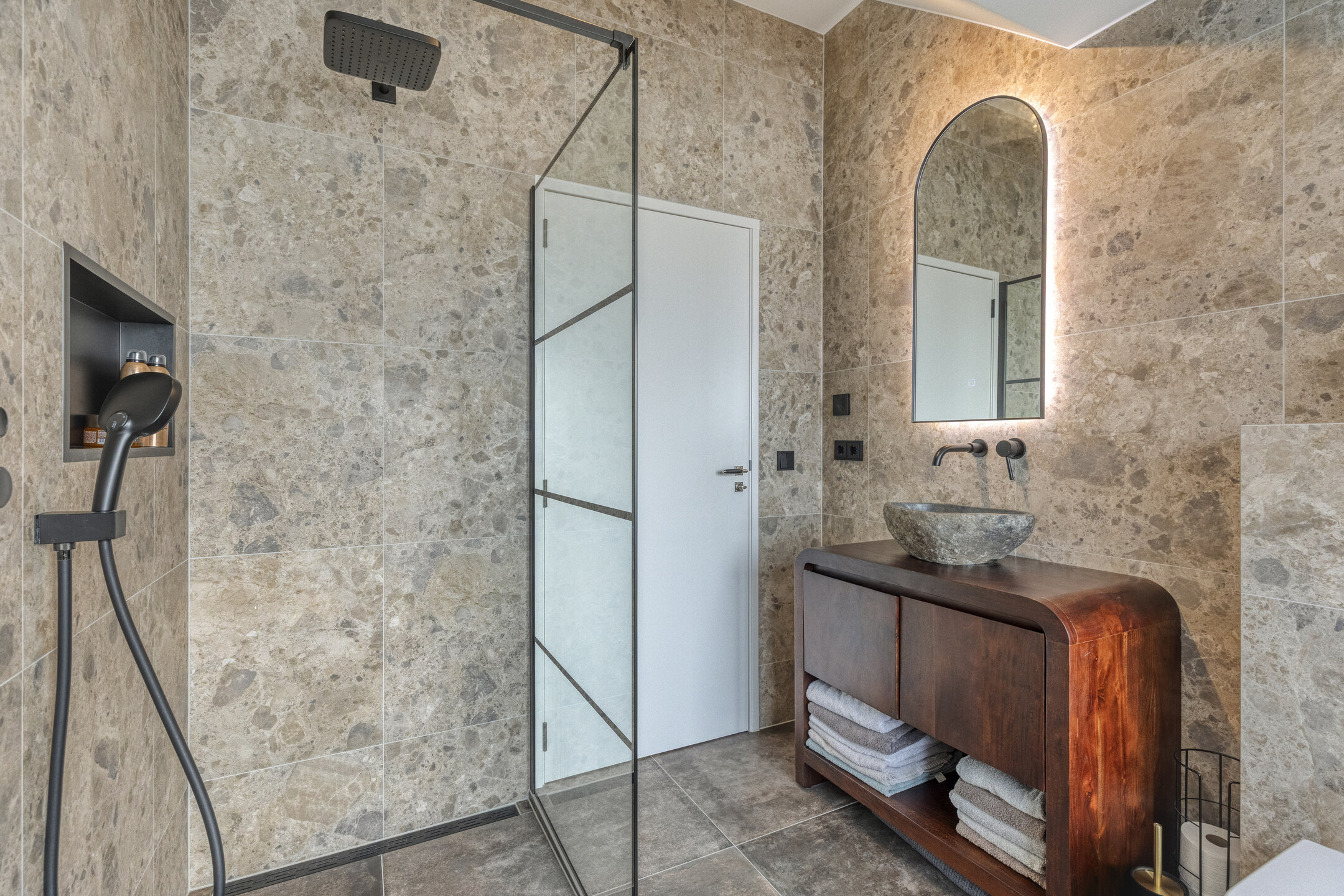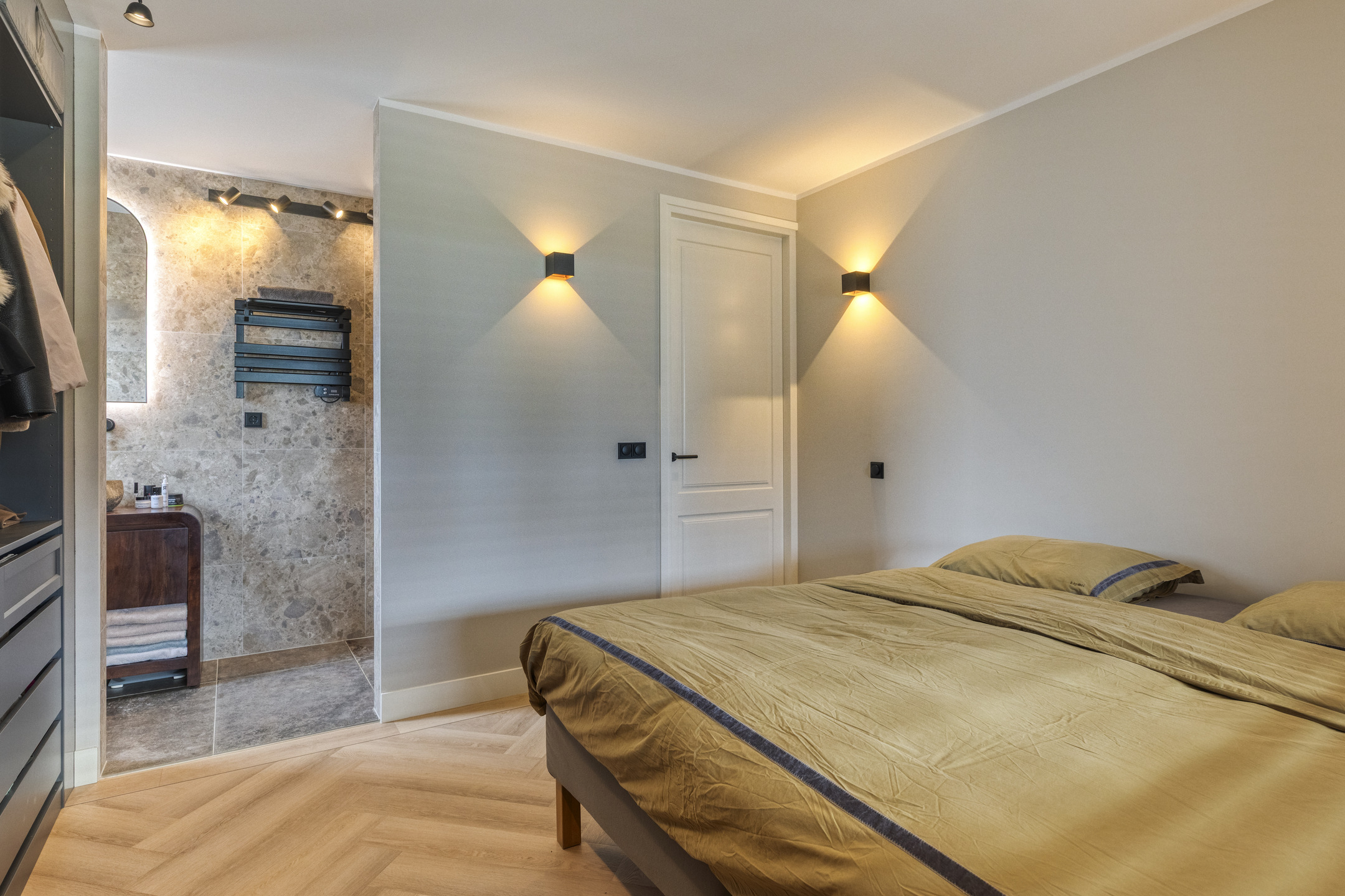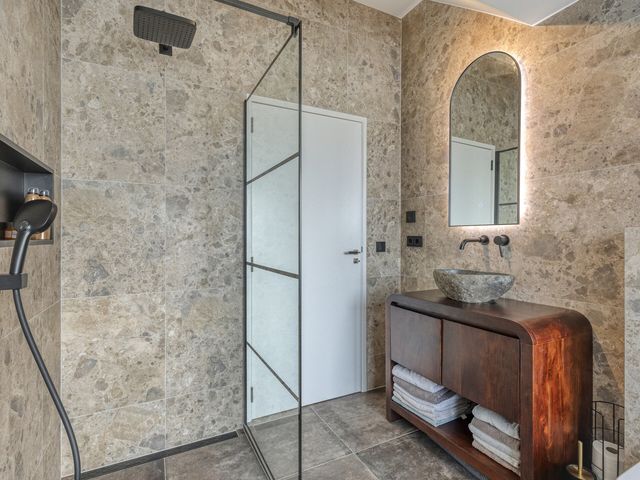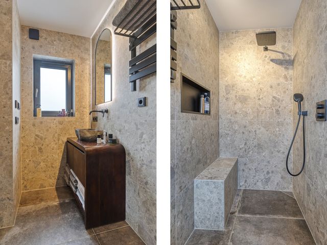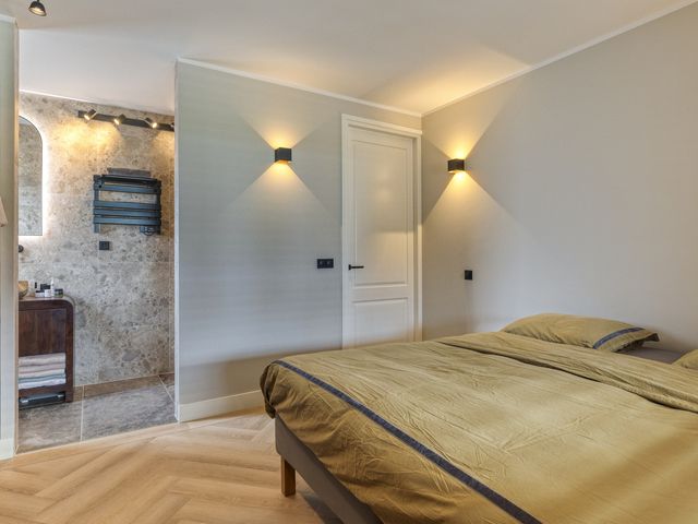 De ensuite badkamer is luxe uitgevoerd en beschikt over een ruime inloopdouche met zowel een regen- als handdouche. Verder is de badkamer voorzien van een natuurstenen wastafel op een fraai badkamermeubel, een verwarmde spiegel en een ingebouwde DAB-radio. Elektrische vloerverwarming zorgt hier voor extra comfort.
