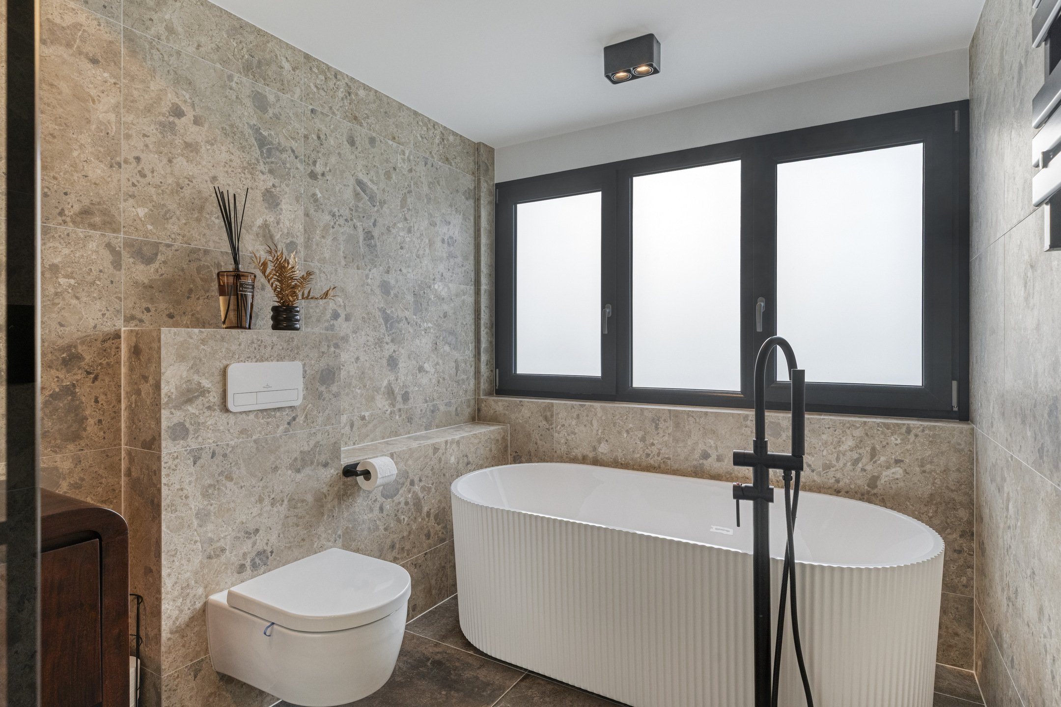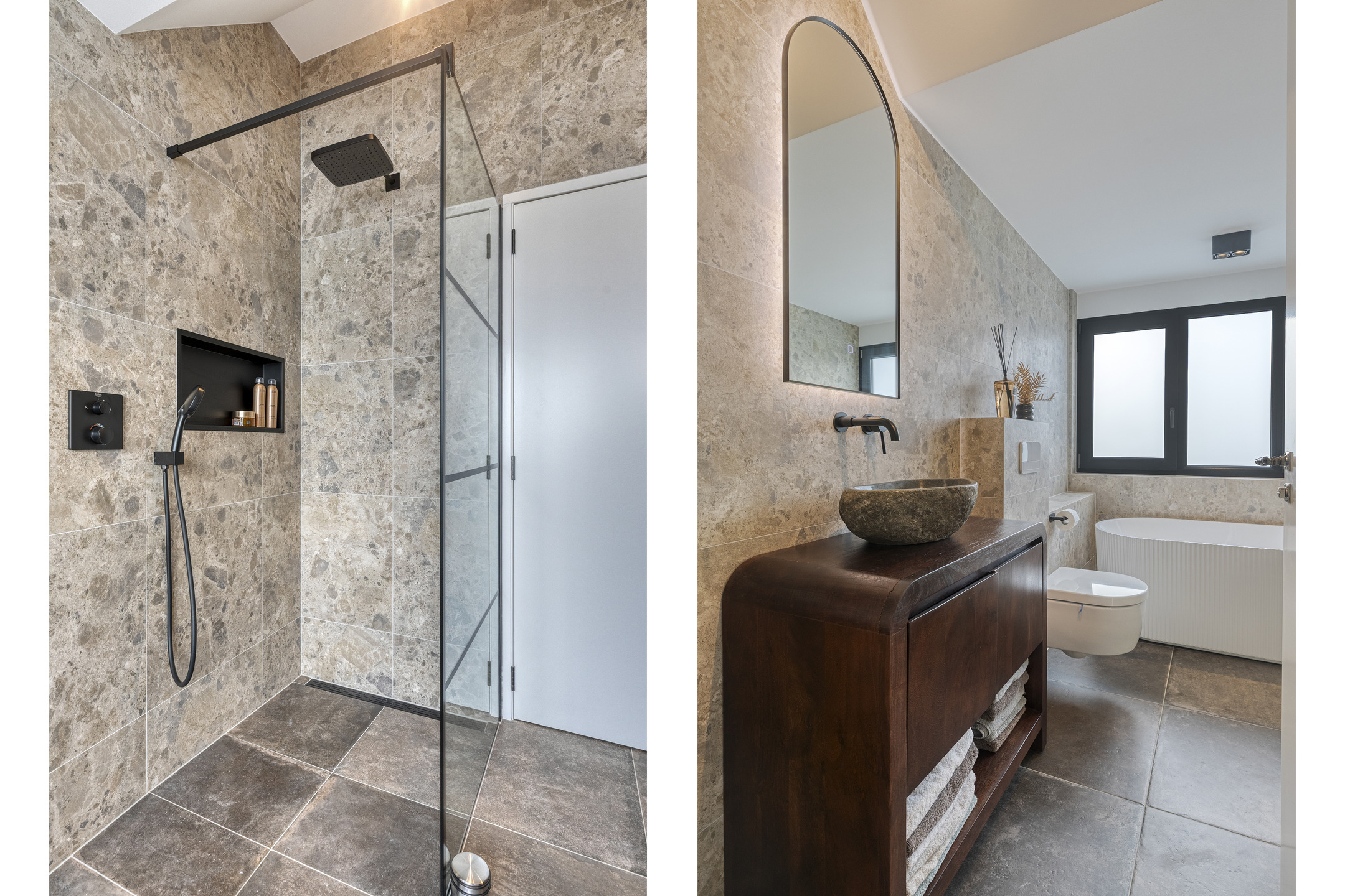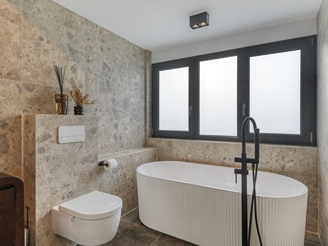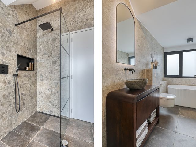 De luxe badkamer op de eerste verdieping is eveneens voorzien van een dakkapel, wat niet alleen zorgt voor extra lichtinval maar ook voor een prachtig vrij uitzicht. De badkamer is stijlvol ingericht met een elegant vrijstaand ligbad en een ruime inloopdouche met zowel een regen- als handdouche. Daarnaast beschikt deze badkamer over een natuurstenen wastafel op een fraai badkamermeubel en een verwarmde badkamerspiegel. Deze badkamer is voorzien van elektrische vloerverwarming. De kleurstelling is in natuurlijke aardetinten.