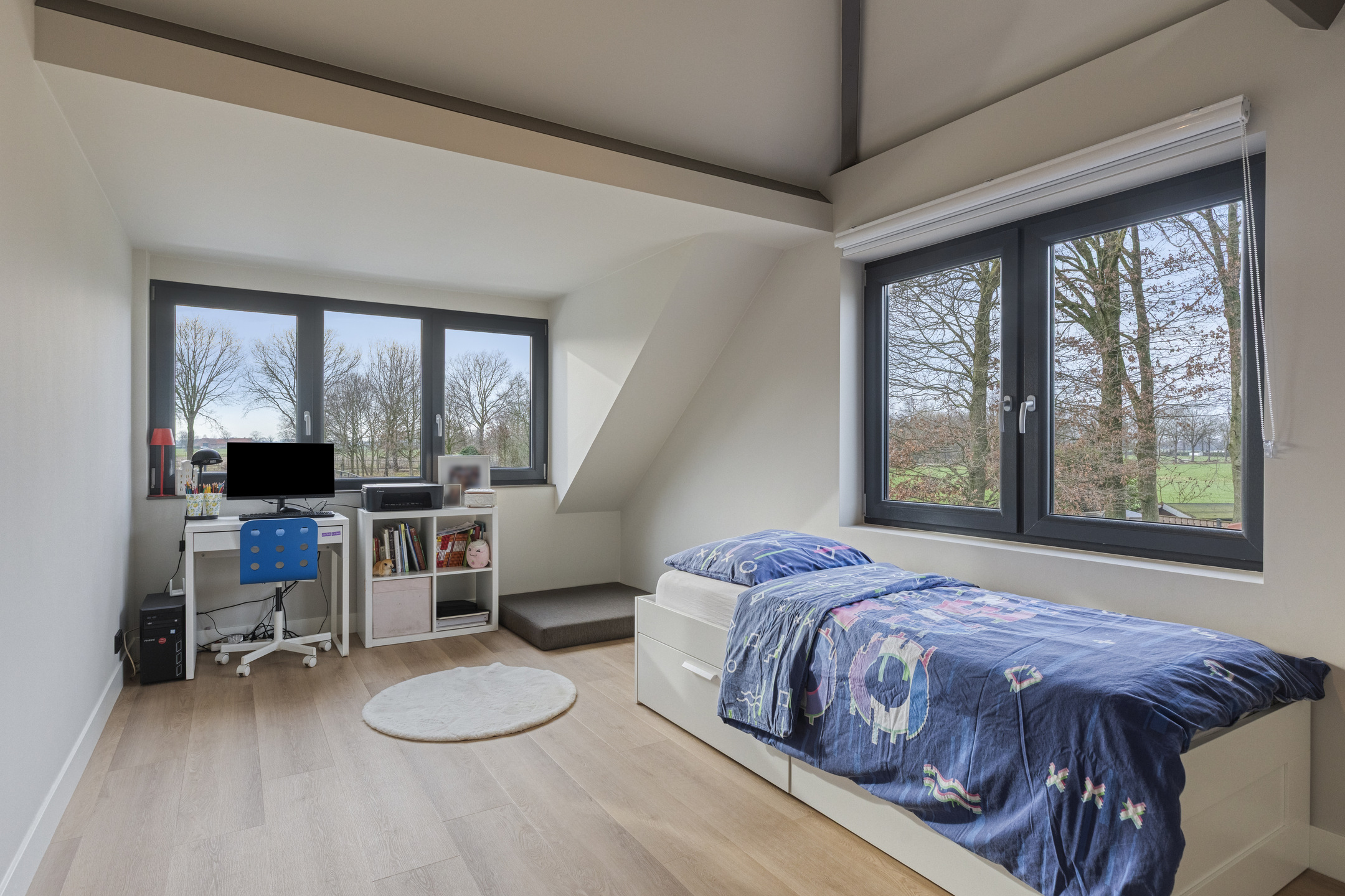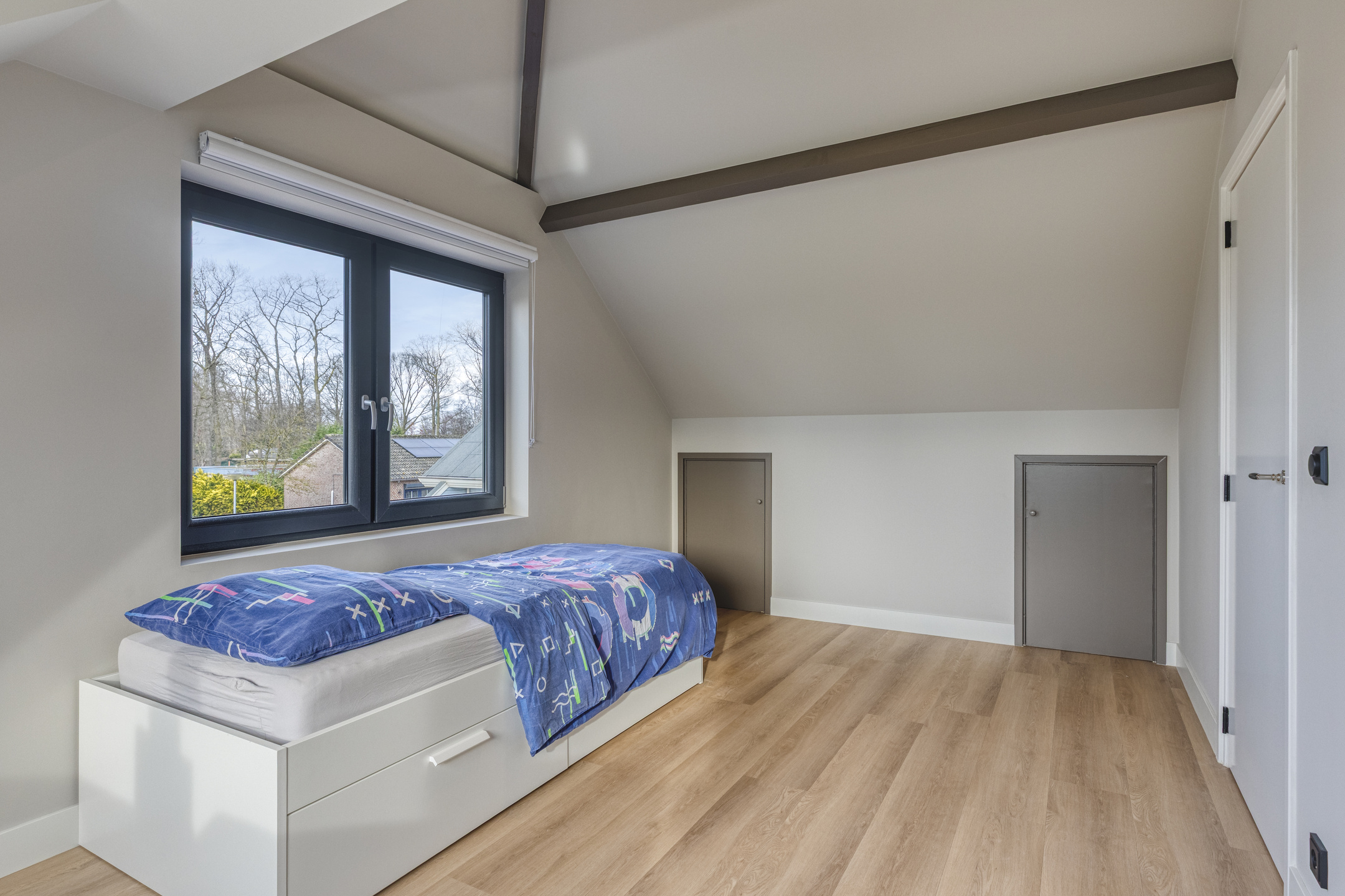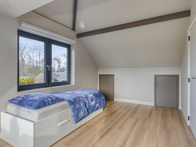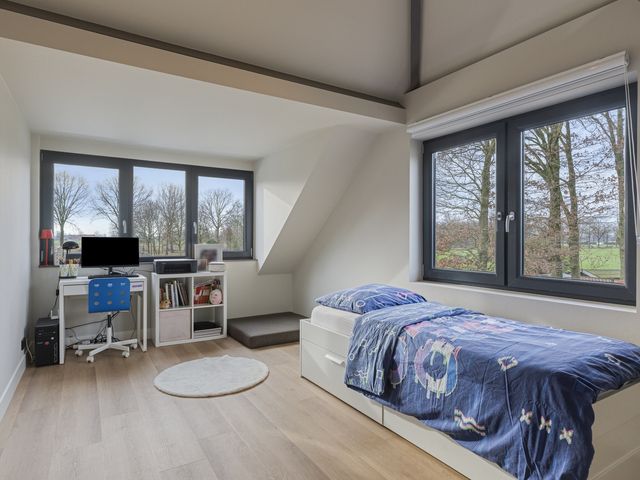 Deze twee ruime slaapkamers op de eerste verdieping zijn voorzien van een grote dakkapel, die zorgt voor veel lichtinval en een prachtig uitzicht over de achtergelegen landerijen. De kamers zijn afgewerkt met een fraaie pvc-vloer en strakke wanden, wat zorgt voor een rustige en moderne uitstraling. Daarnaast beschikken beide slaapkamers over praktische vaste kasten, waardoor er volop bergruimte is.