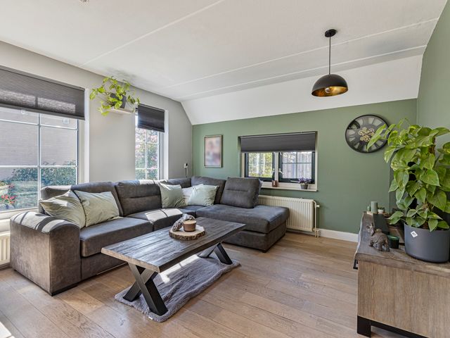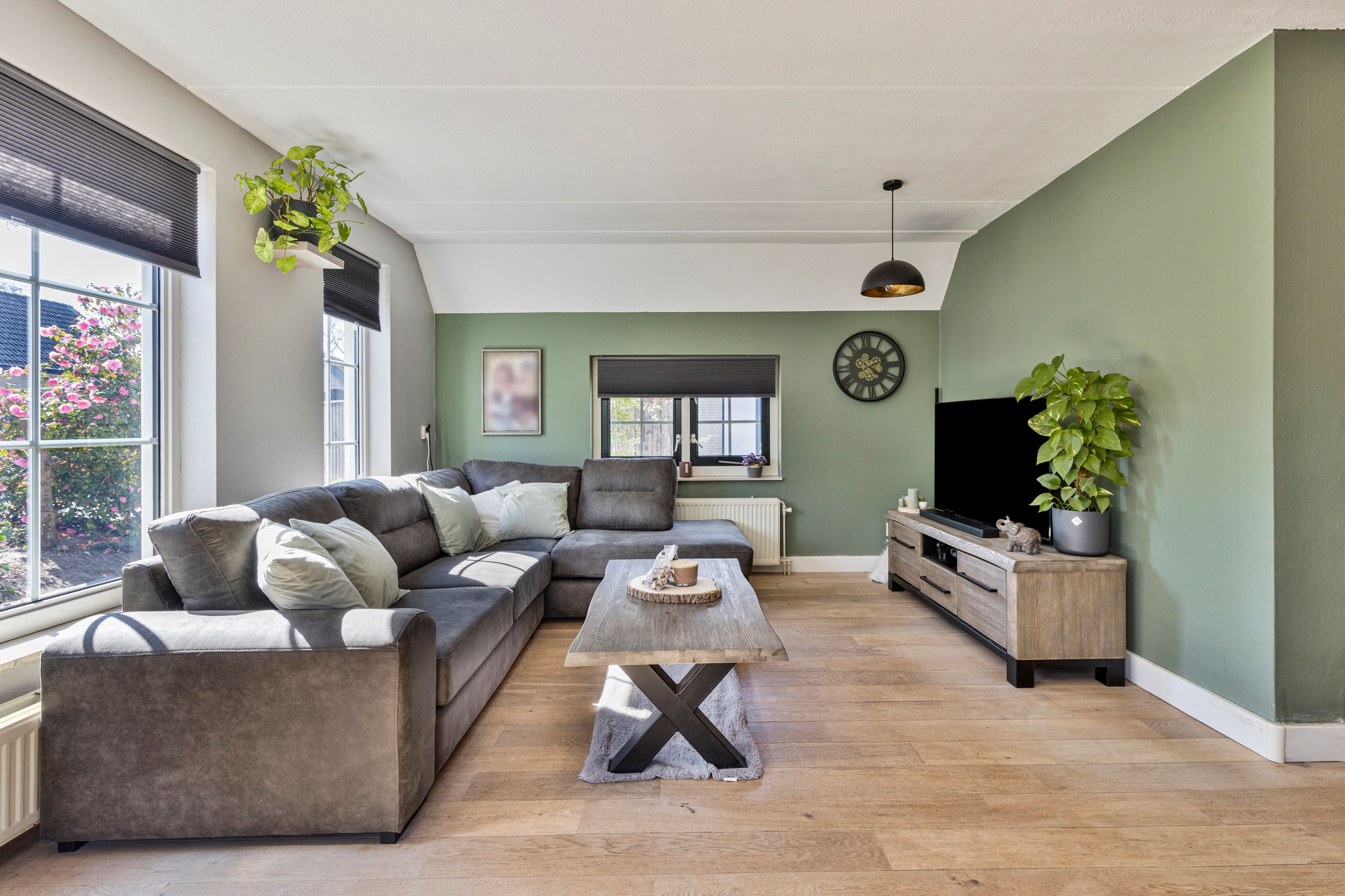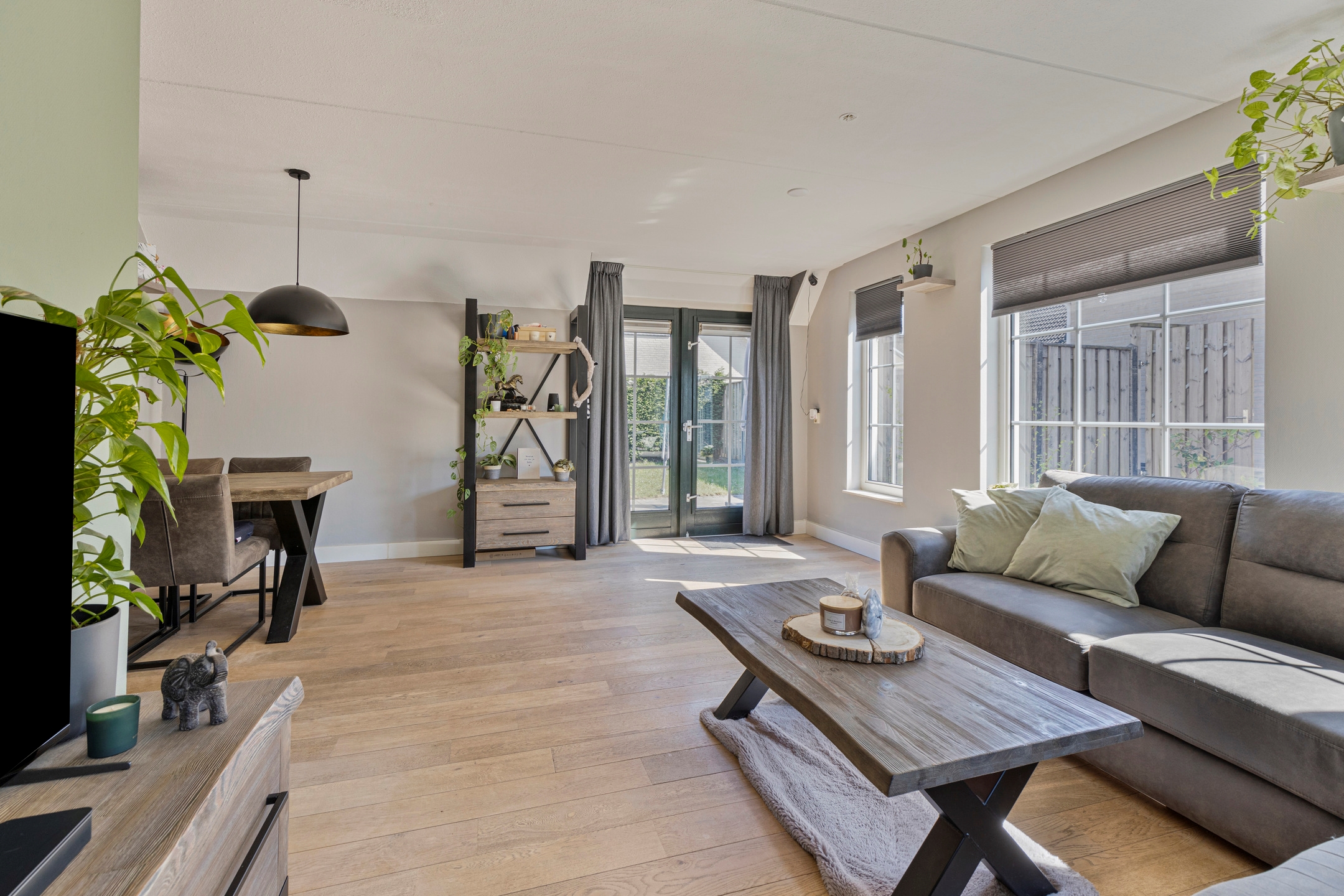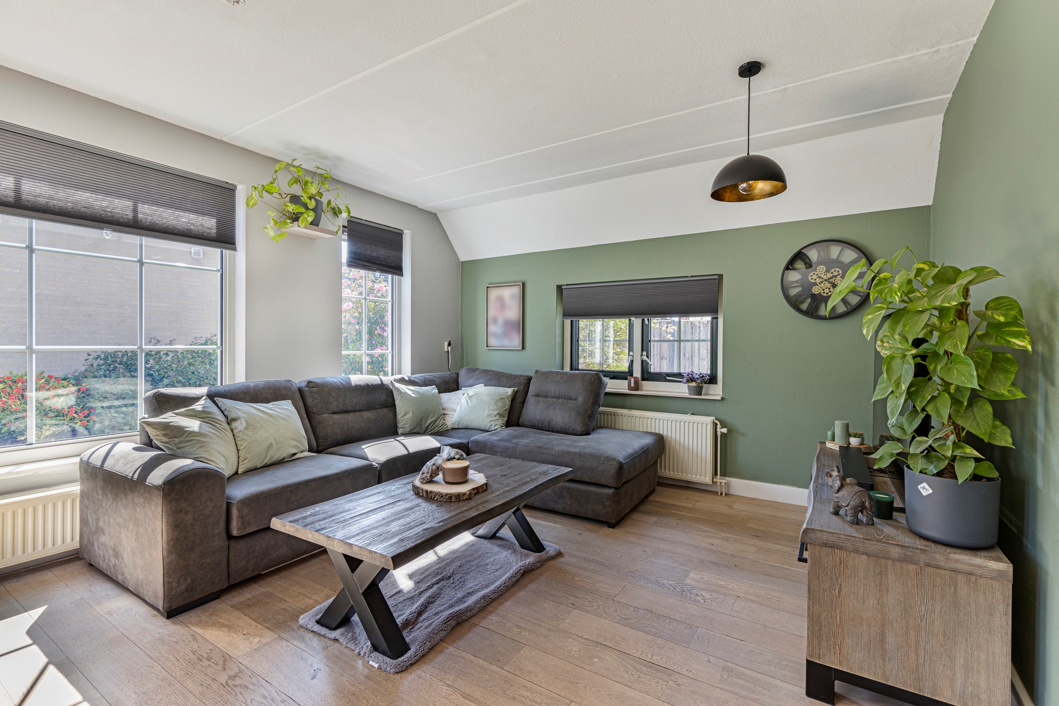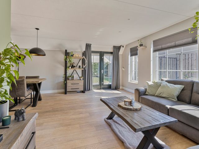 - Royale woonkamer met meerdere raampartijen en openslaande deuren naar de tuin