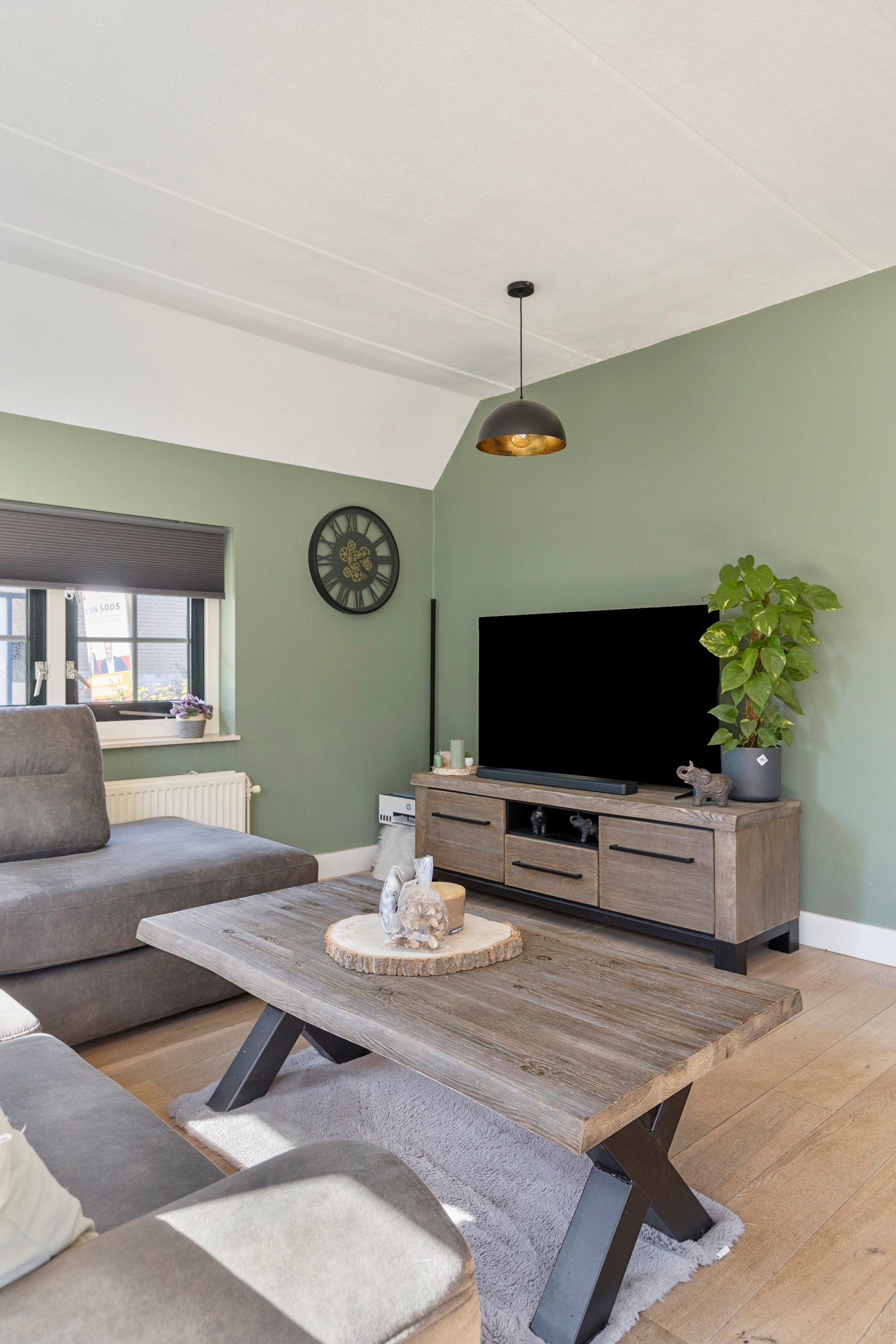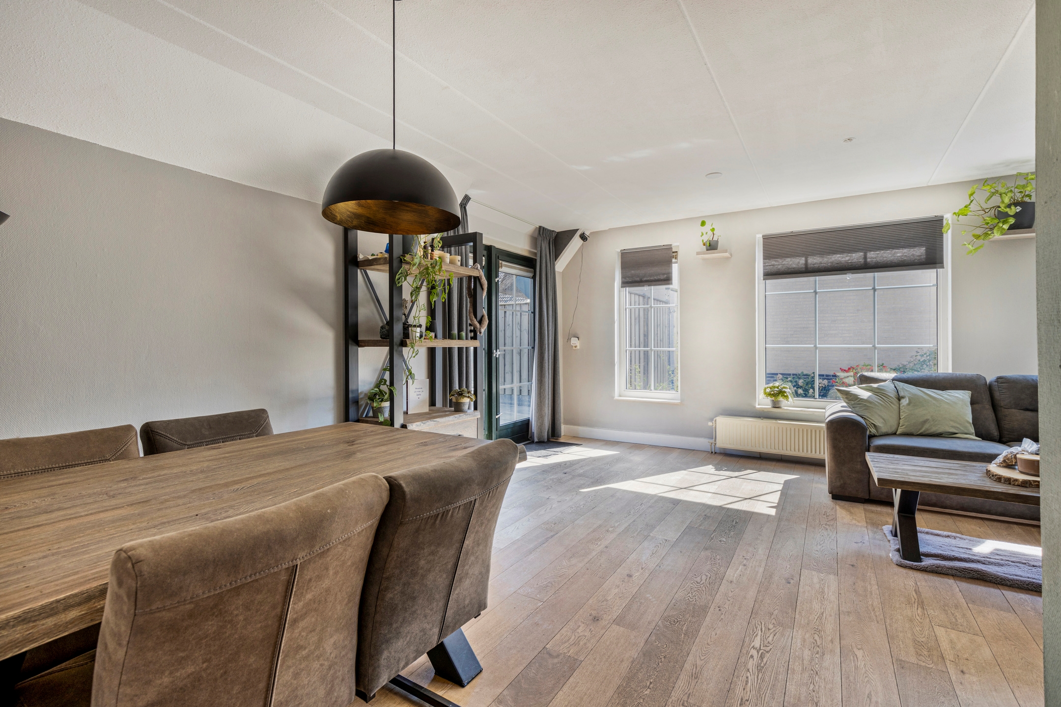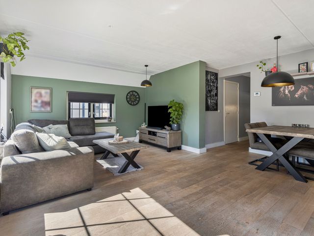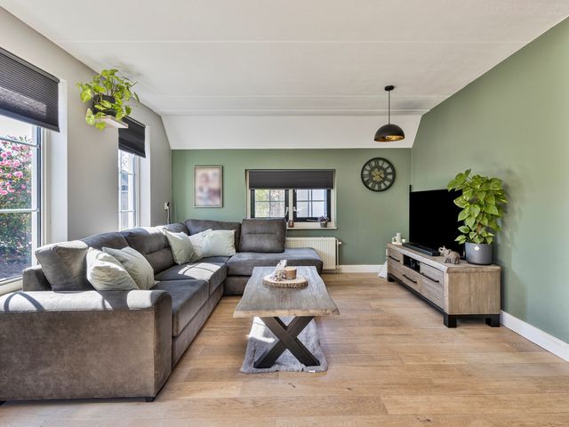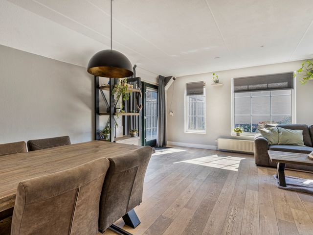 Licht, ruimte, deze L-vormige woonkamer heeft het! Door de raampartijen en openslaande tuindeuren is de woonkamer een mooie lichte ruimte. De openslaande tuindeuren komen uit op het aangrenzende terras en tuin.