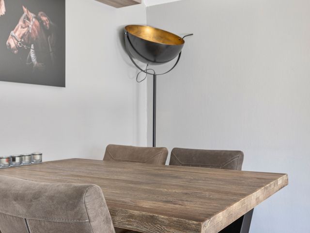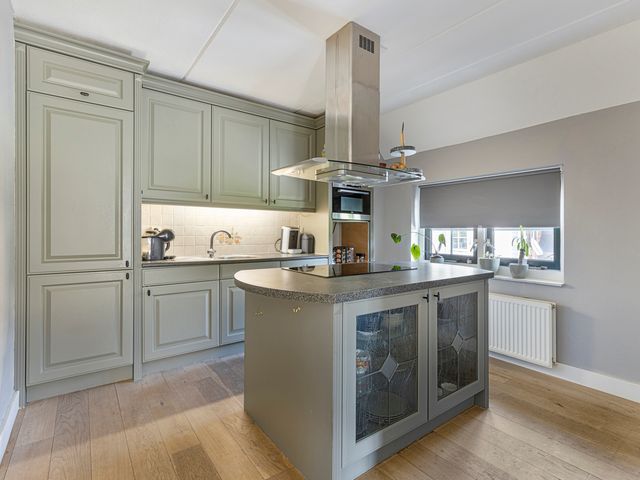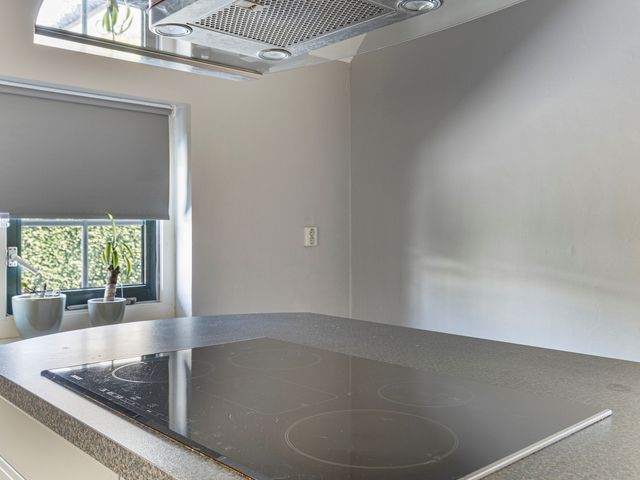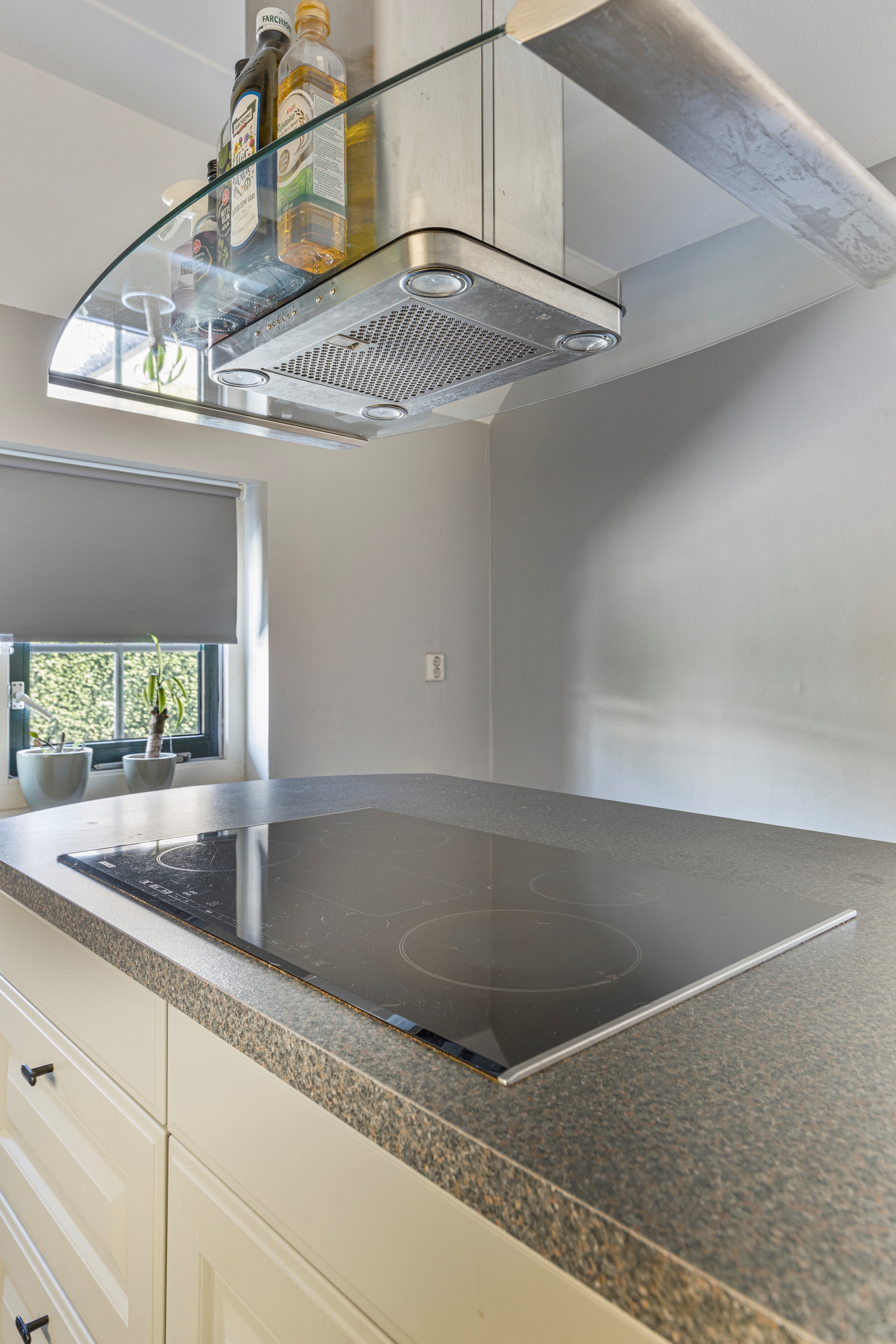 De keuken is in hout uitgevoerd en heeft een kookeiland. De inrichting bestaat uit een inductiekookplaat, afzuigkap, combi-oven, koelkast, vriezer en vaatwasser. Door de royale opstelling met onder- en bovenkasten, ontbreekt het je zeker niet aan bergruimte, ideaal.