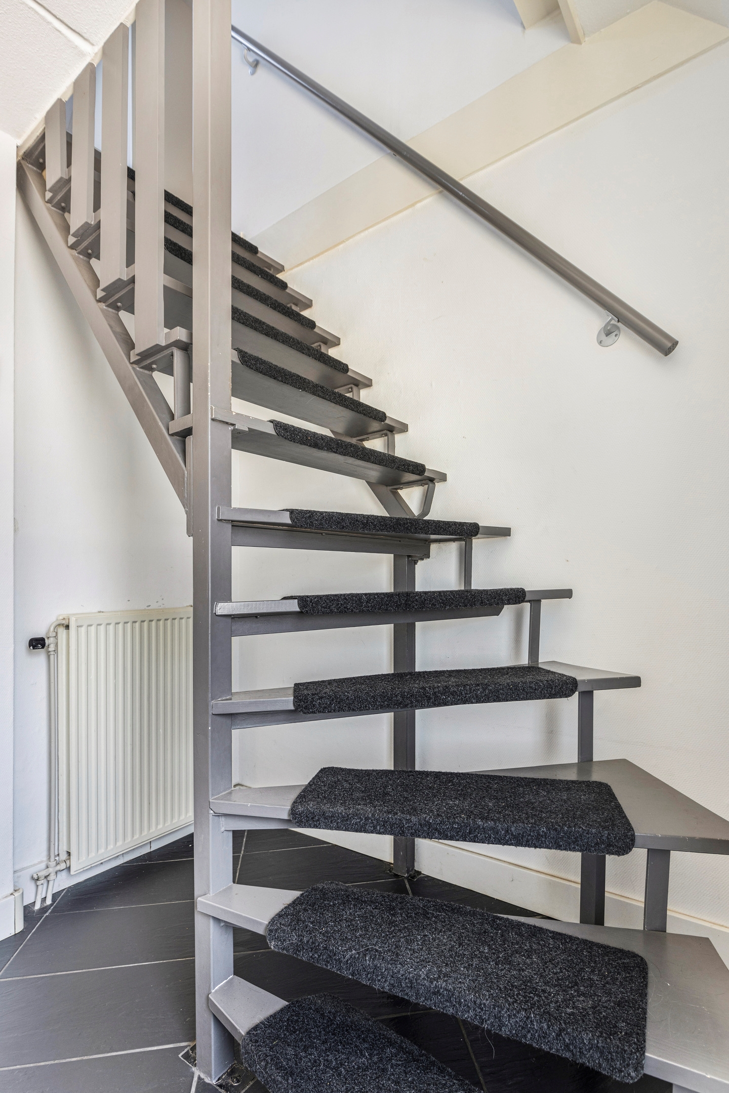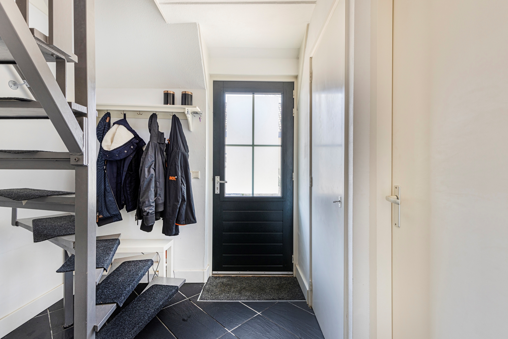 De ruime ontvangsthal met stijlvolle houten trap naar de 1e verdieping geeft toegang tot de woonkamer, de toiletruimte, badkamer, bijkeuken en meterkast.