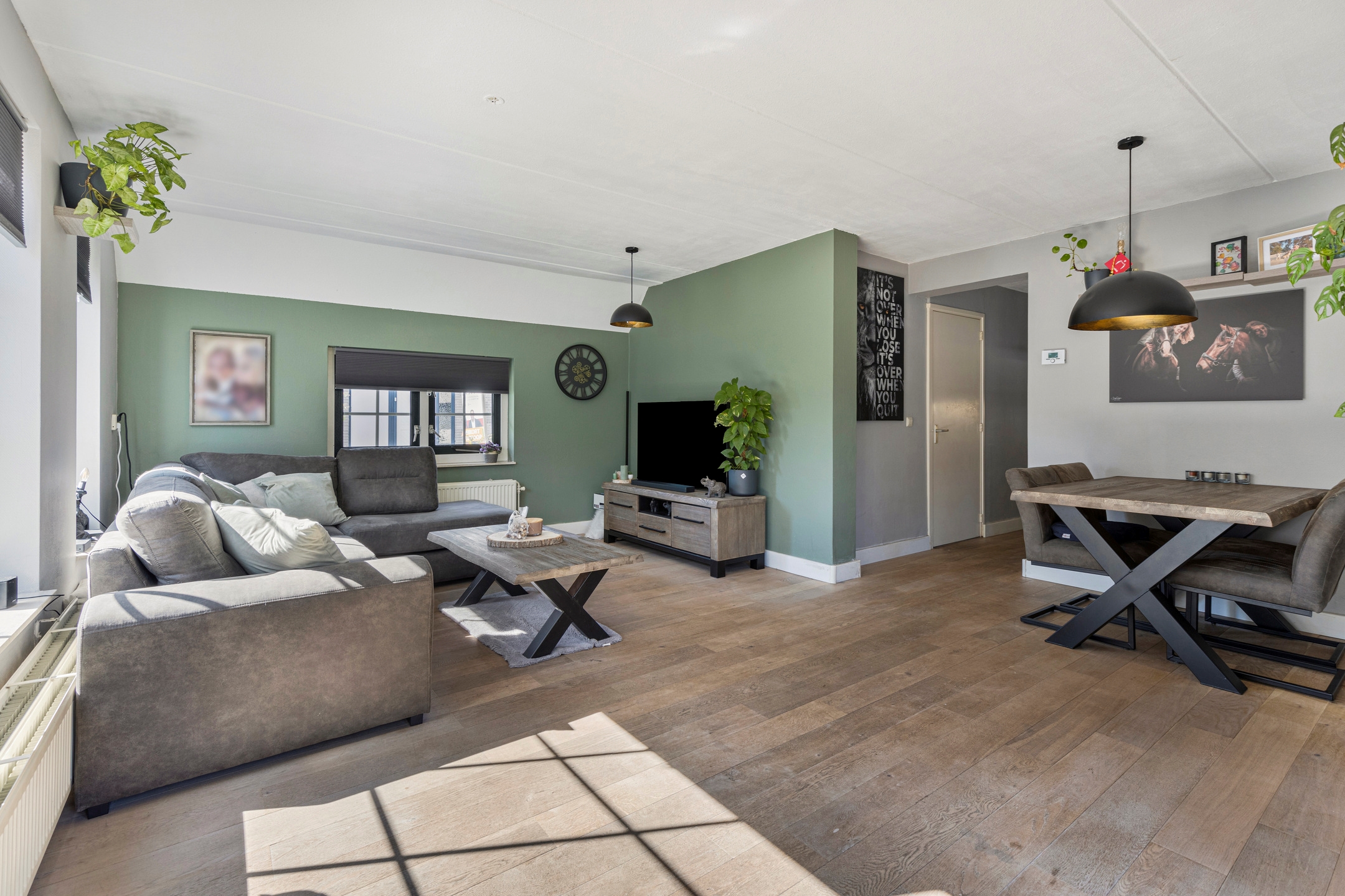 De woonkamer is voorzien van een lichte houten vloer en de wanden hebben een lichte en strakke afwerking.
