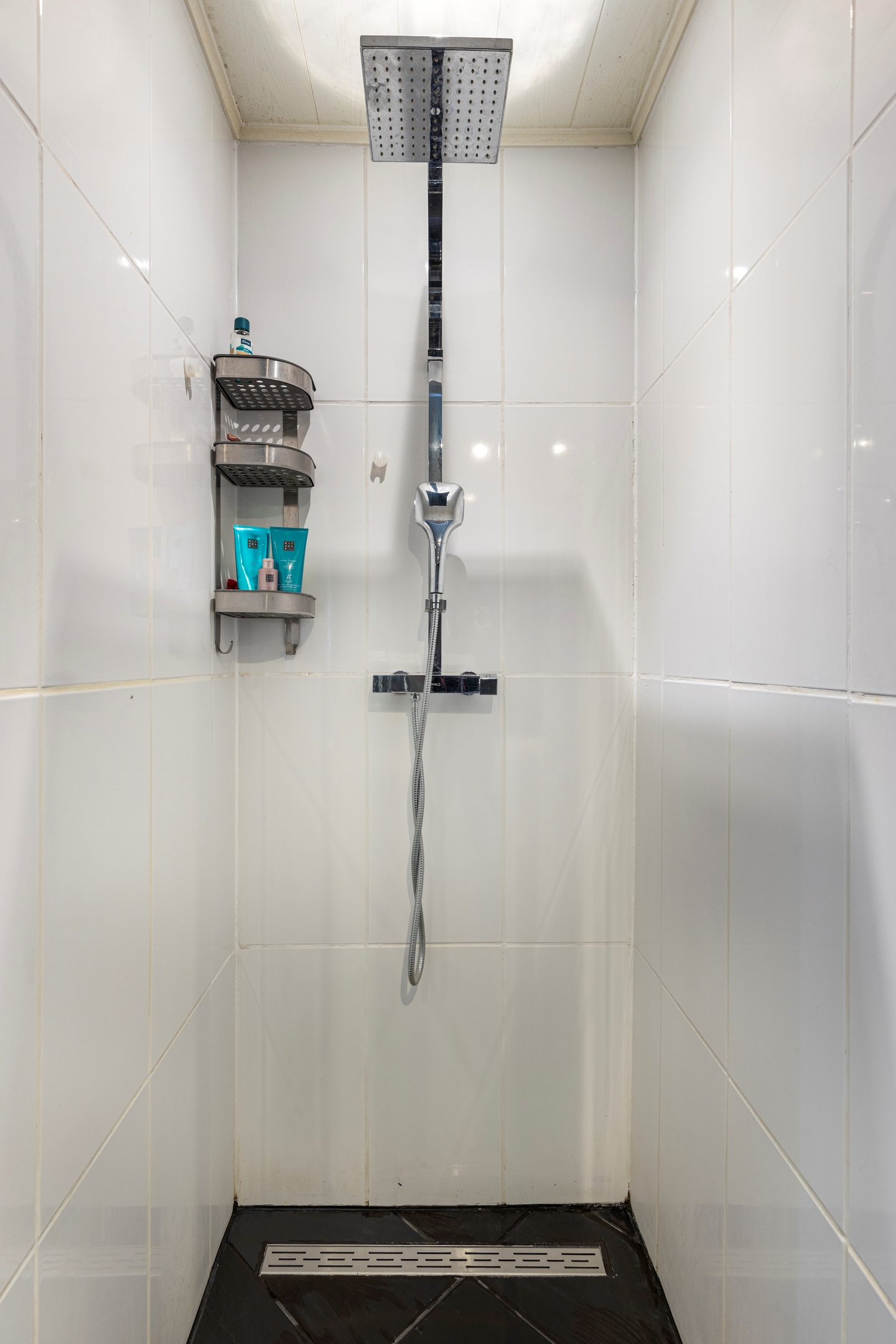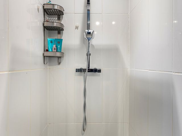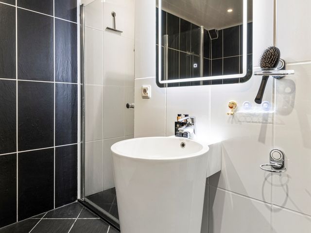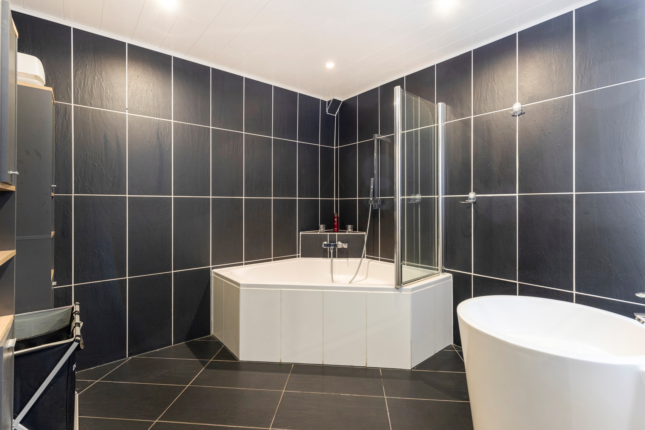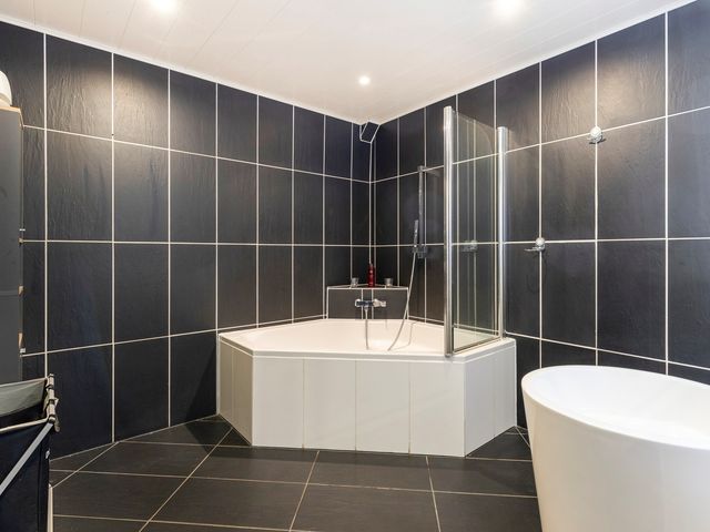 De badkamer is compleet ingericht met een inloop douche, een hoek bad, designradiator en een wastafel, spiegel en verlichting. De badkamer is geheel betegeld.