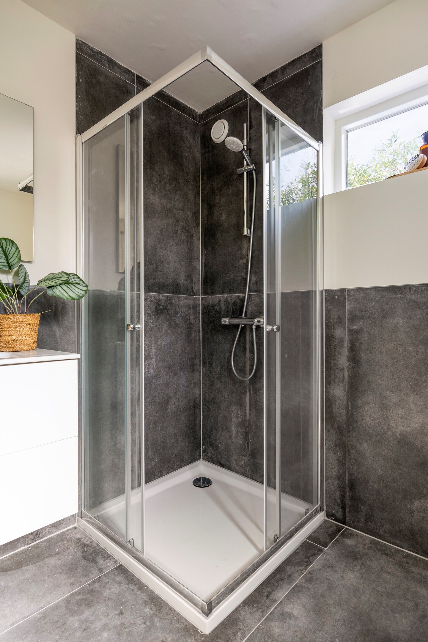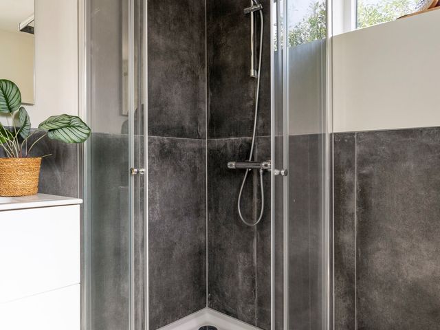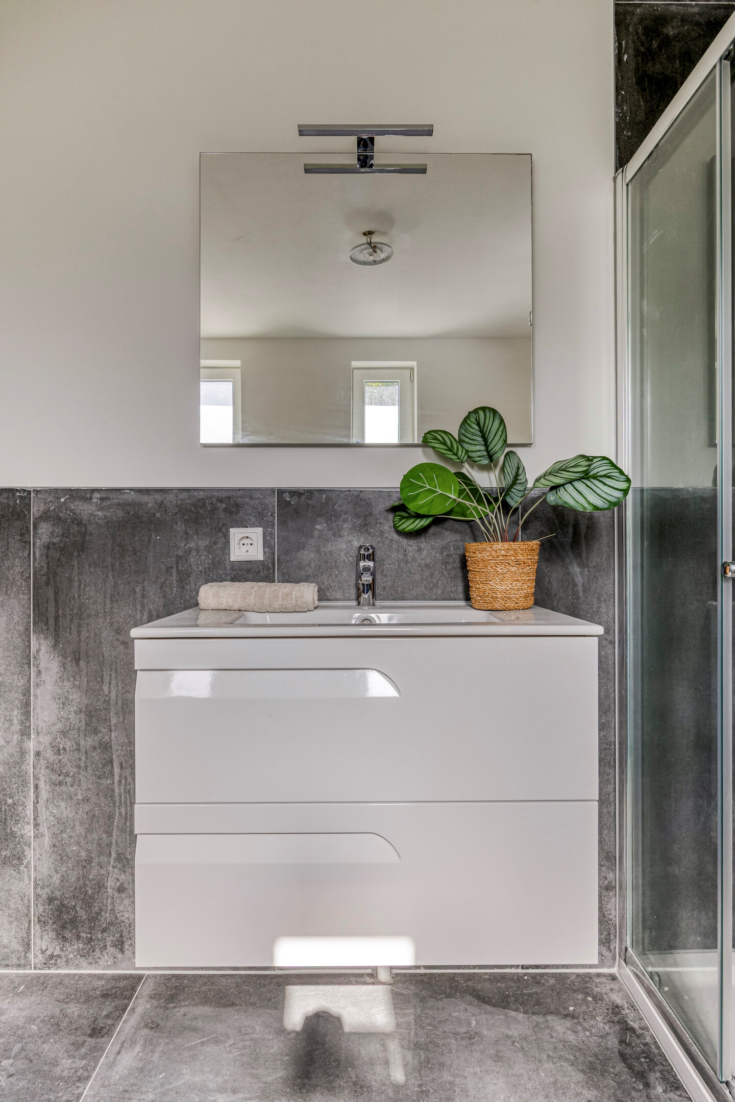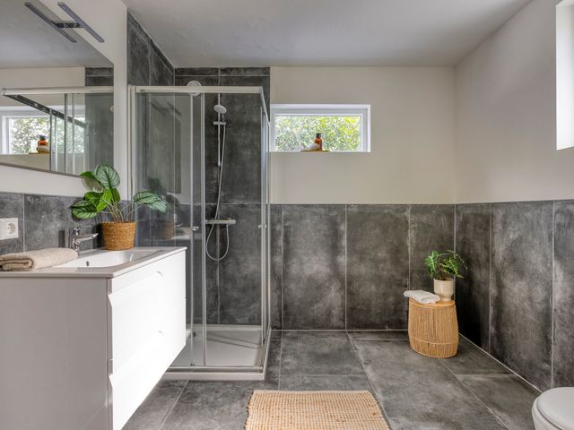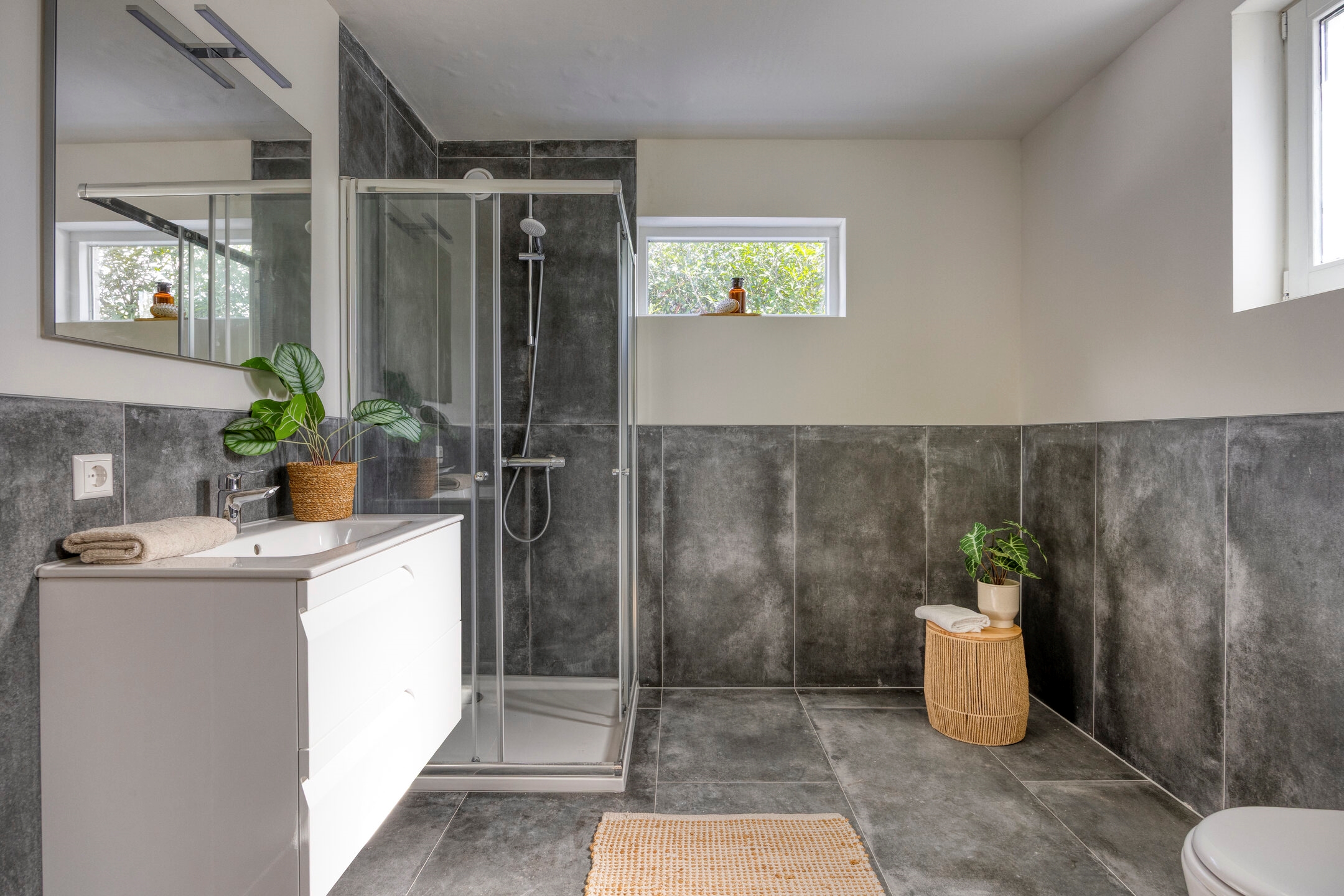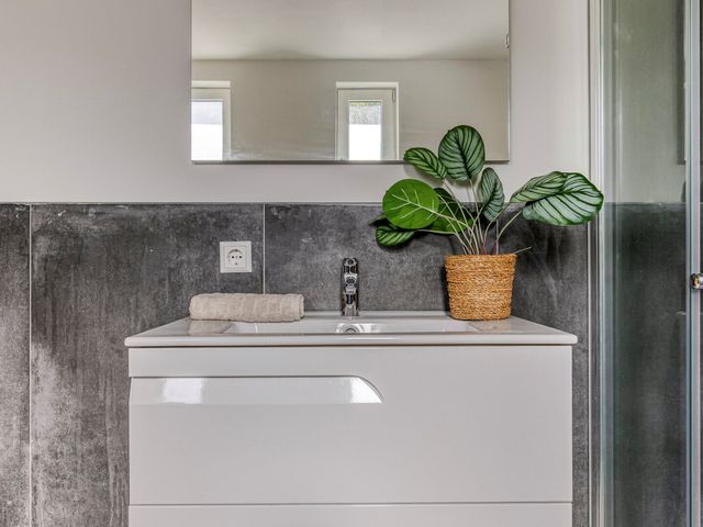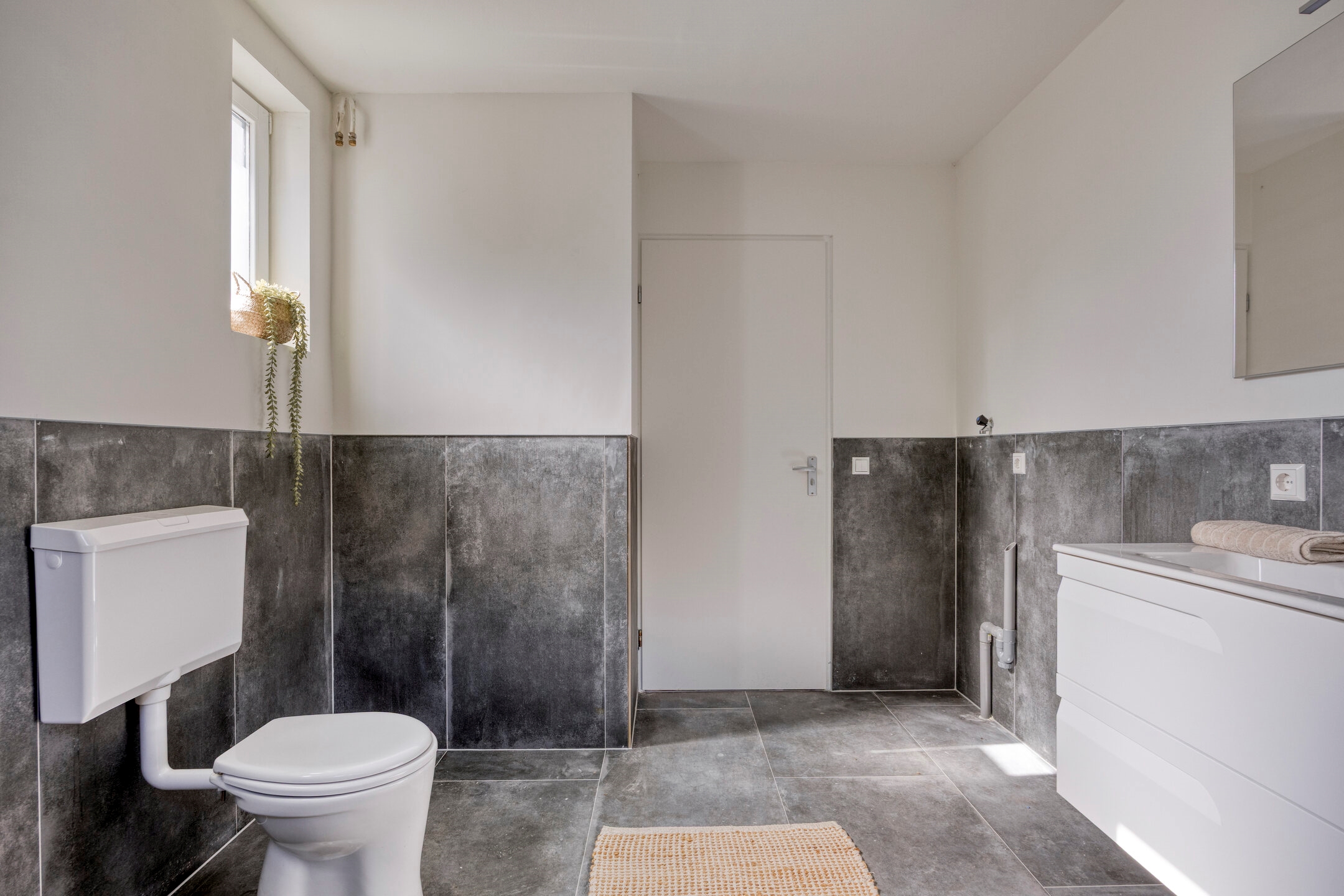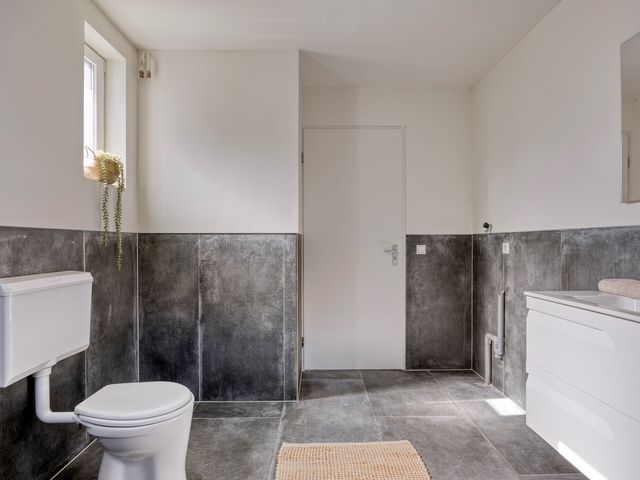 De royale badkamer is deels betegeld en voorzien van een douchecabine, een wastafel in een badkamermeubel, een verlichte badkamerspiegel en een toilet. Tevens is in deze ruimte de aansluiting voor een wasmachine en droger.