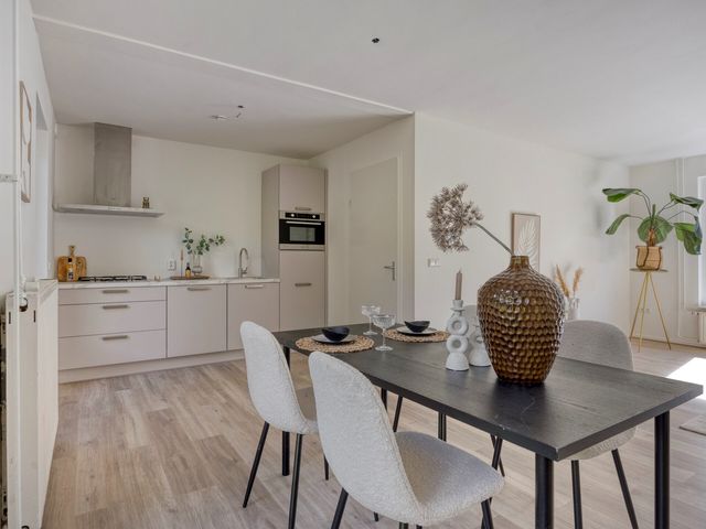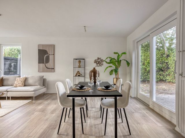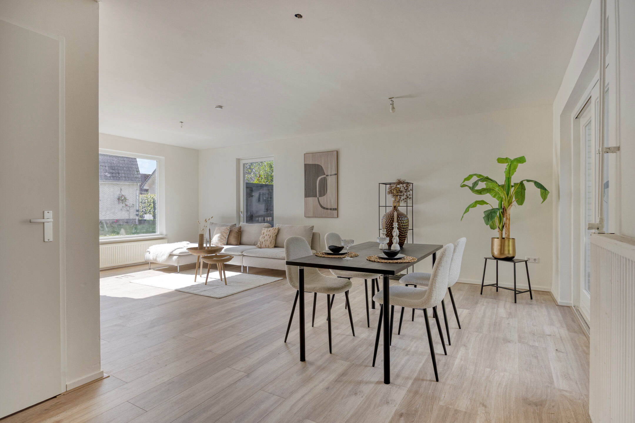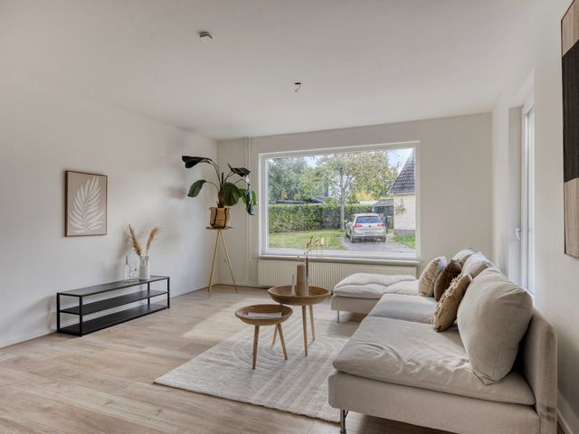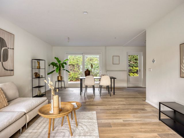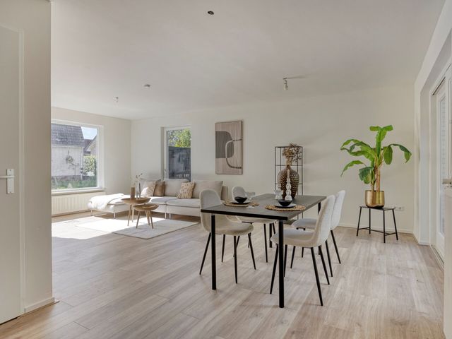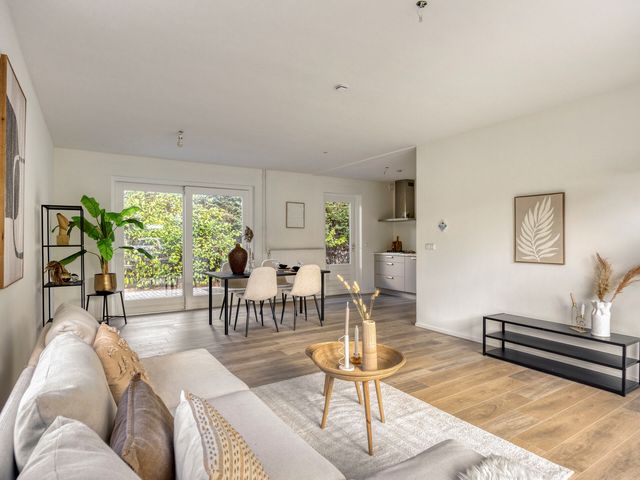 De ruime en lichte woonkamer beschikt over meerdere raampartijen en een schuifpui, wat zorgt voor veel natuurlijk licht. De vloer is afgewerkt met pvc laminaat en de wanden zijn voorzien van strak stucwerk.