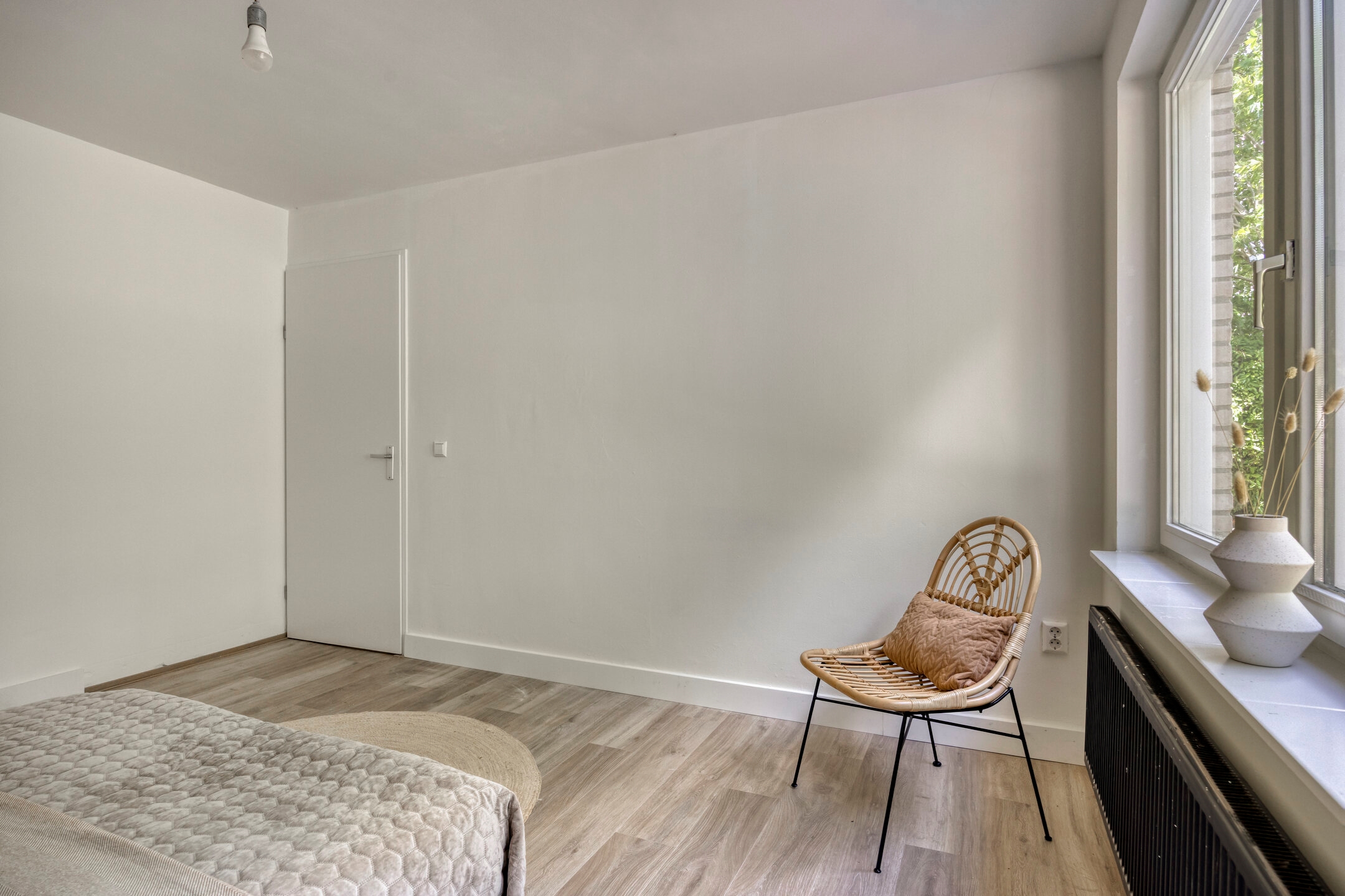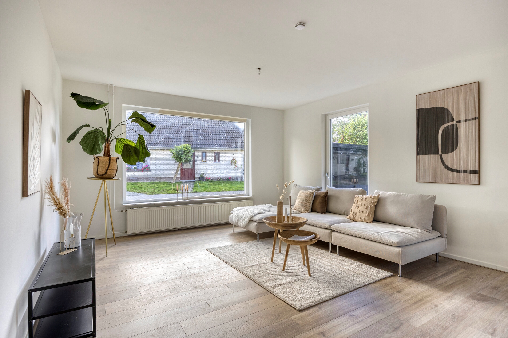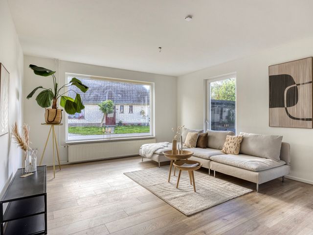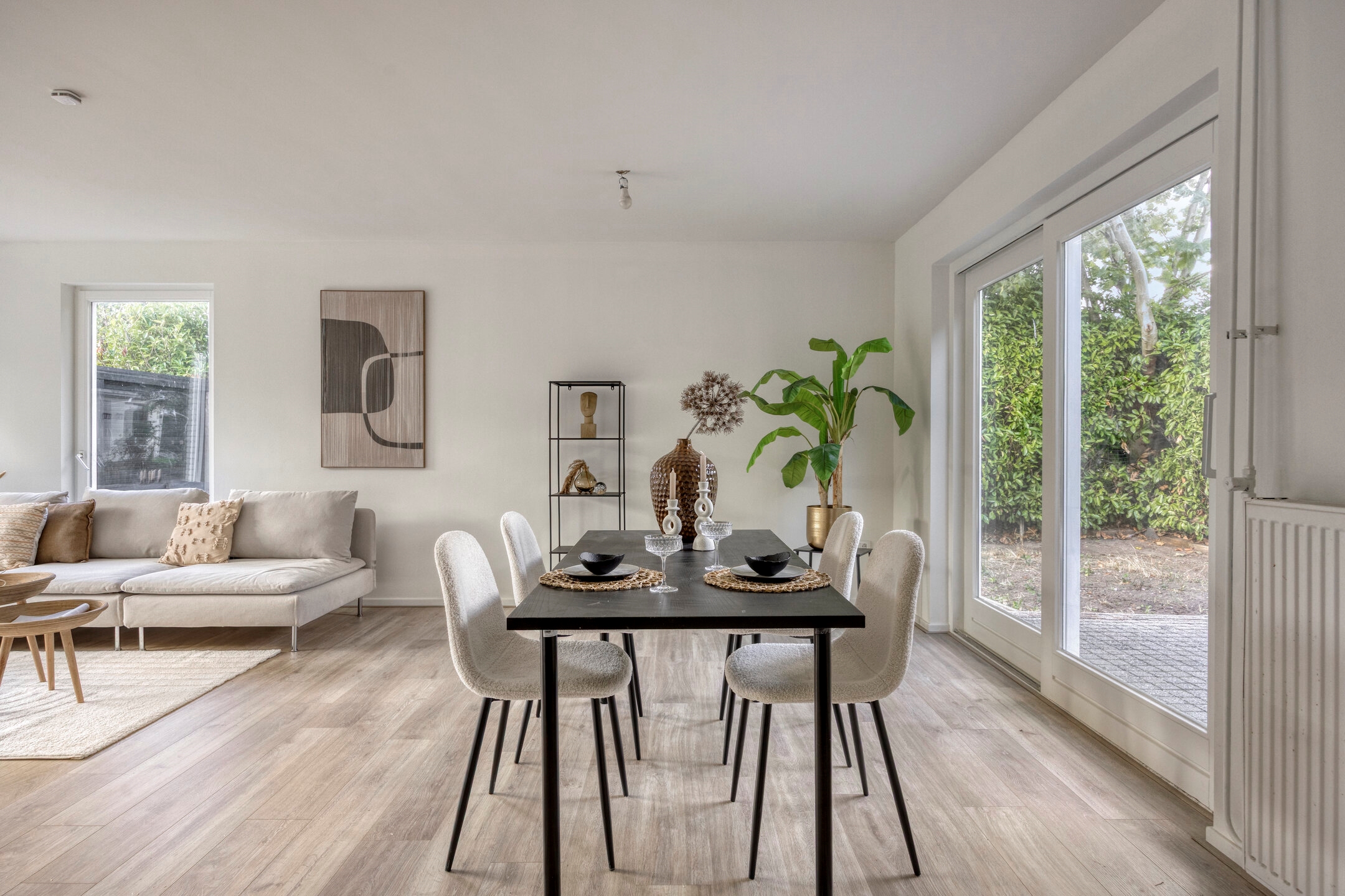 De ruime en lichte woonkamer beschikt over meerdere raampartijen en een schuifpui, wat zorgt voor veel natuurlijk licht. De vloer is afgewerkt met pvc laminaat en de wanden zijn voorzien van strak stucwerk.