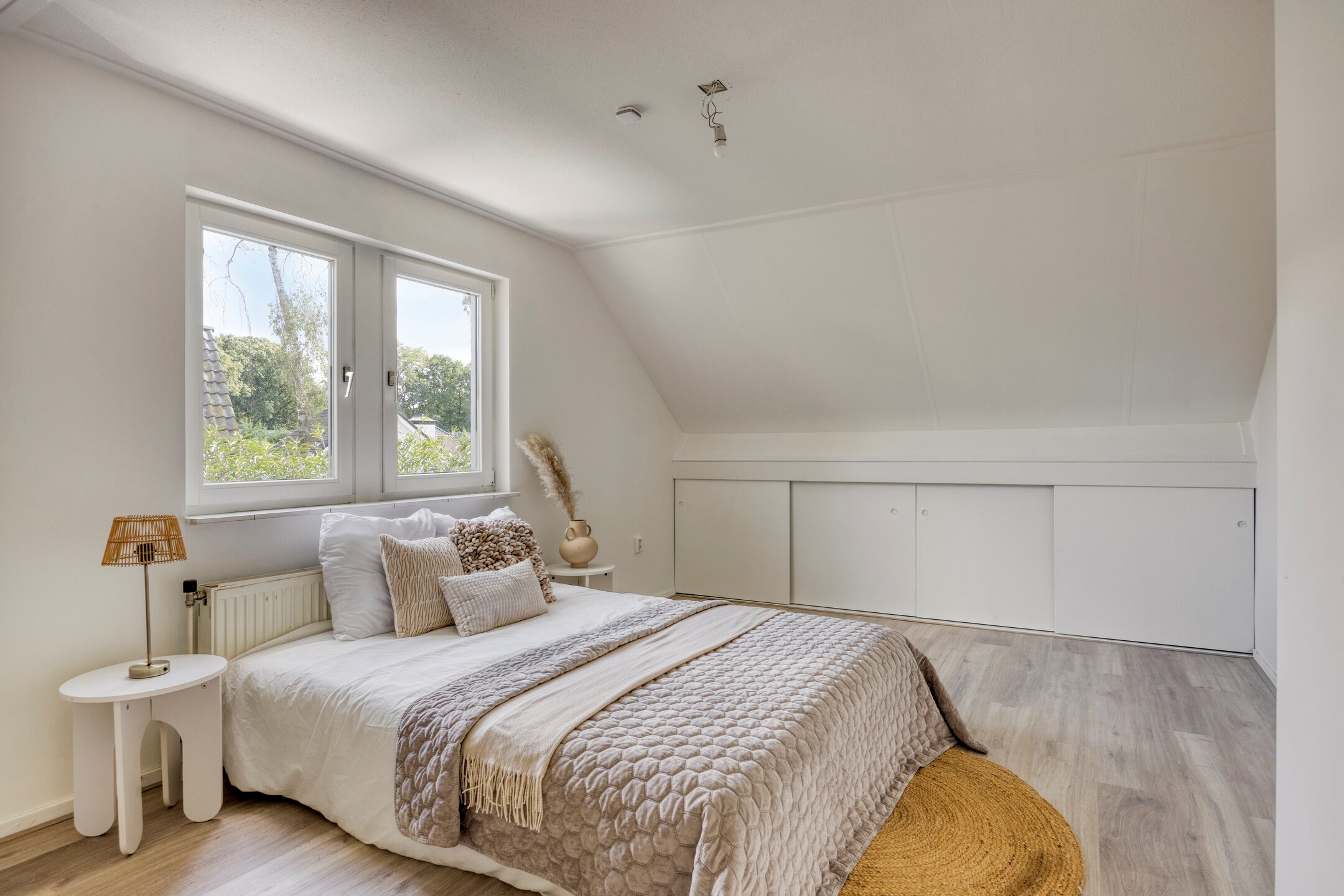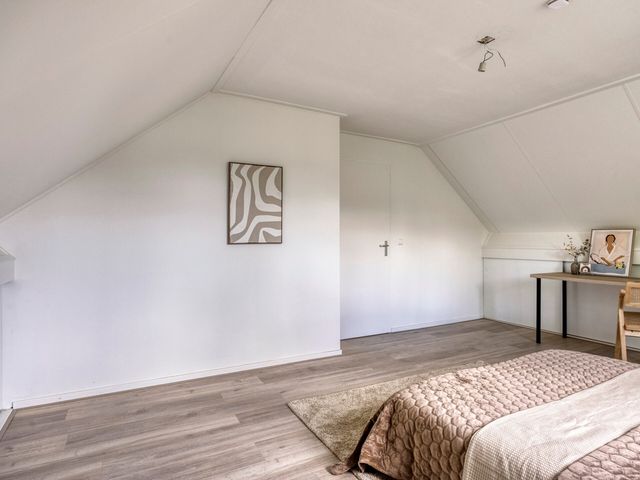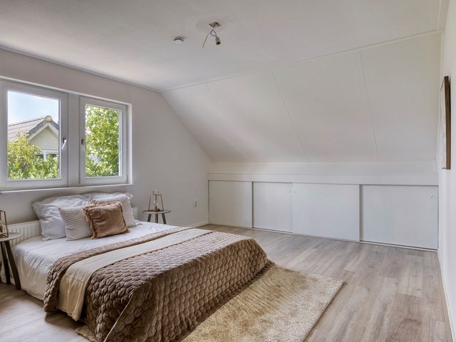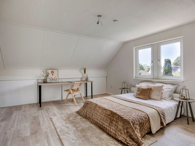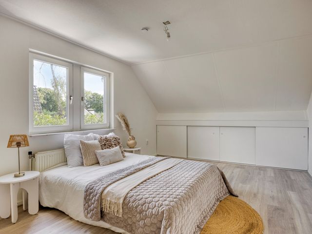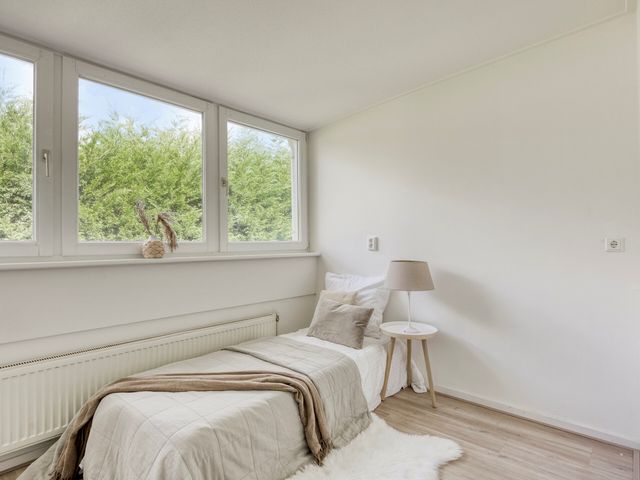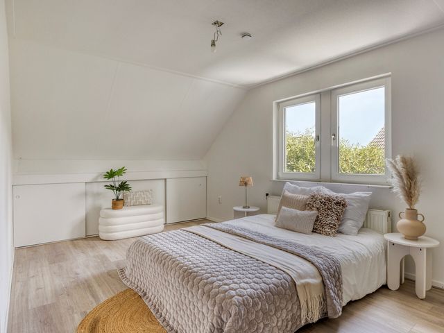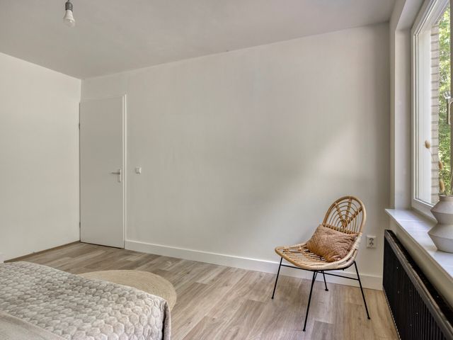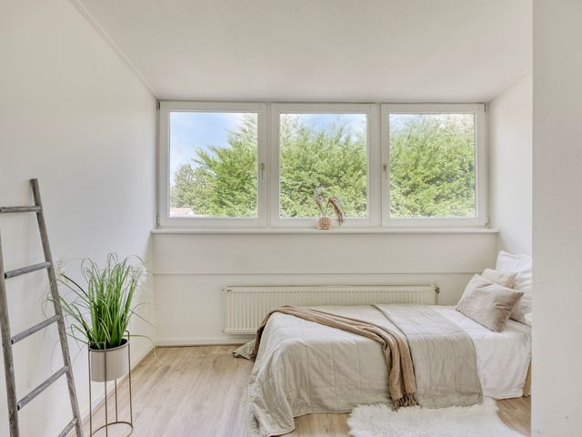 De slaapkamer op de begane grond heeft een pvc laminaatvloer en wanden zijn gestuct. Door de raampartijen geniet deze ruimte van een fijne lichtinval.
