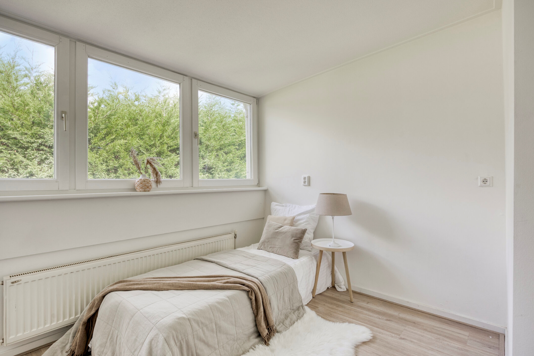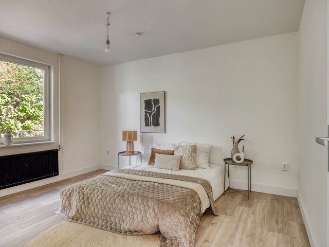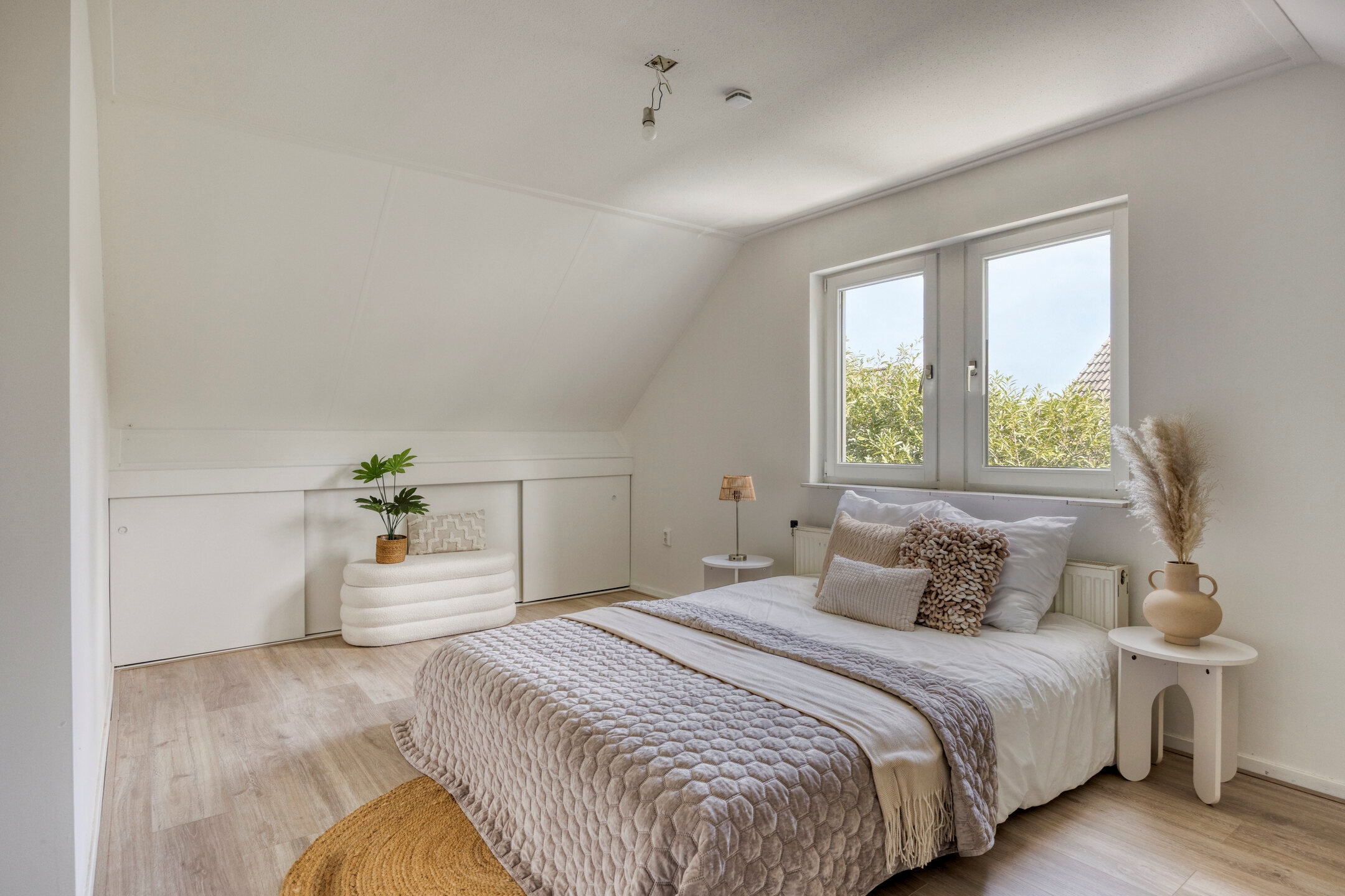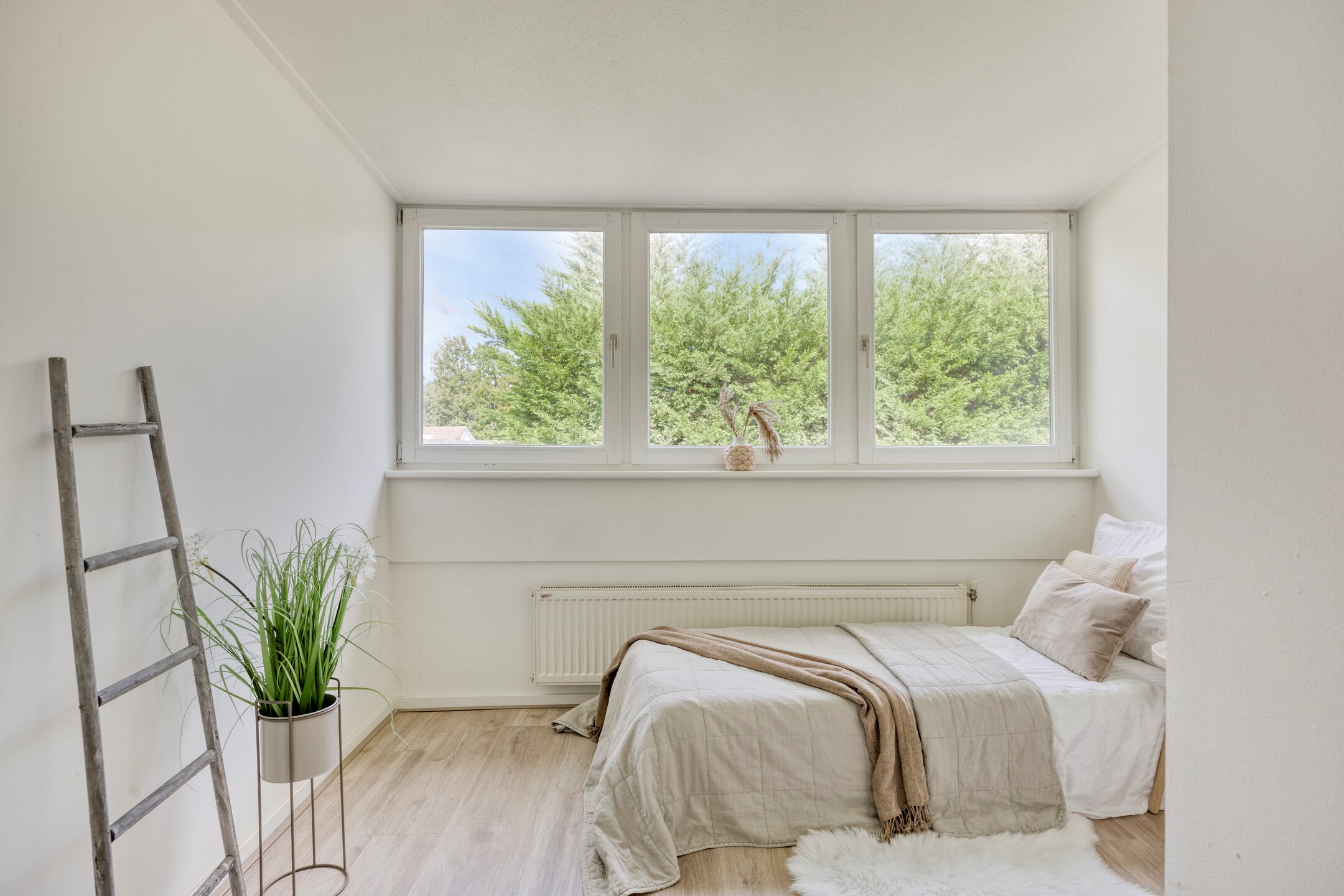 De slaapkamer op de begane grond heeft een pvc laminaatvloer en wanden zijn gestuct. Door de raampartijen geniet deze ruimte van een fijne lichtinval.