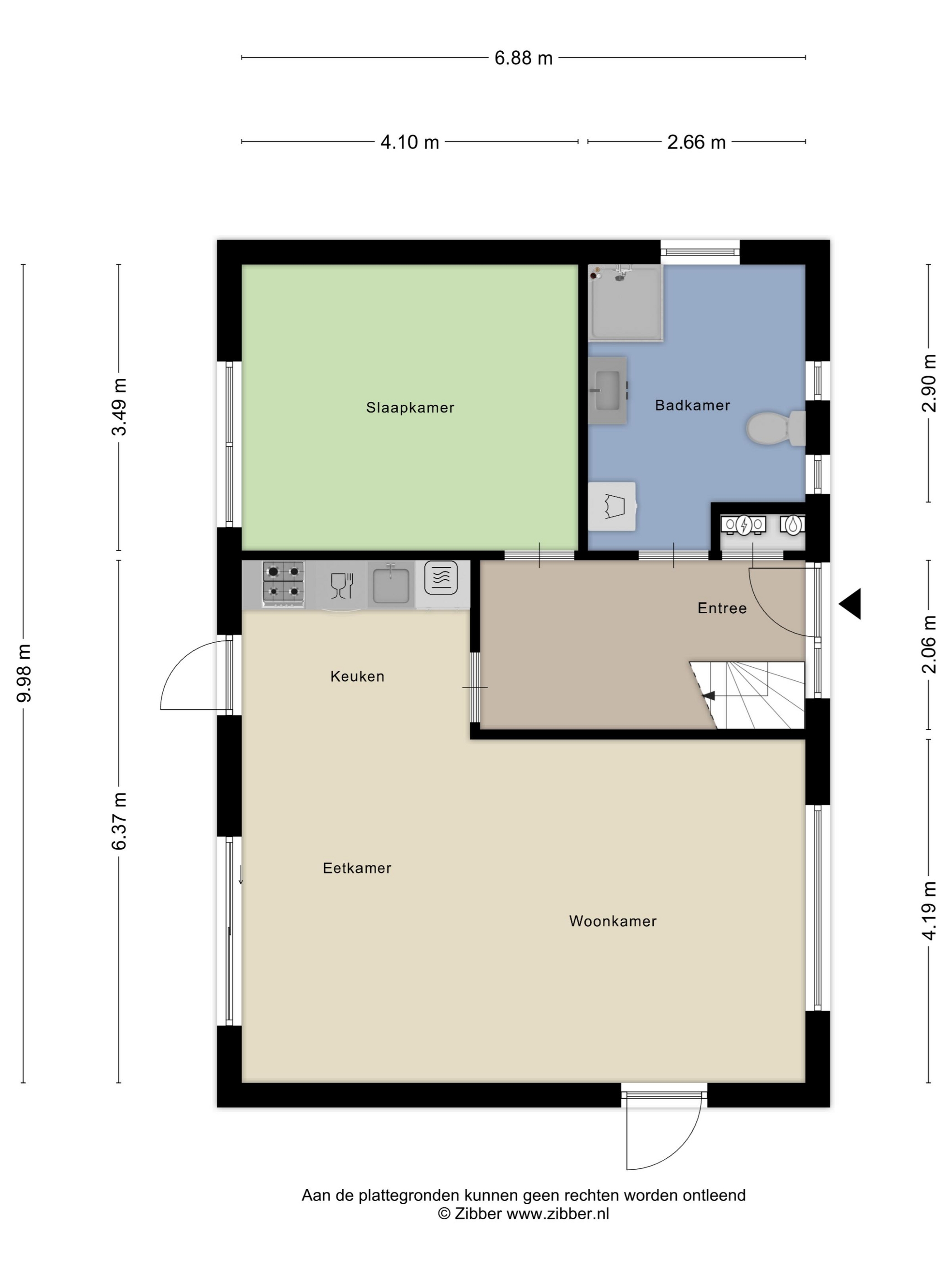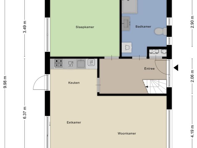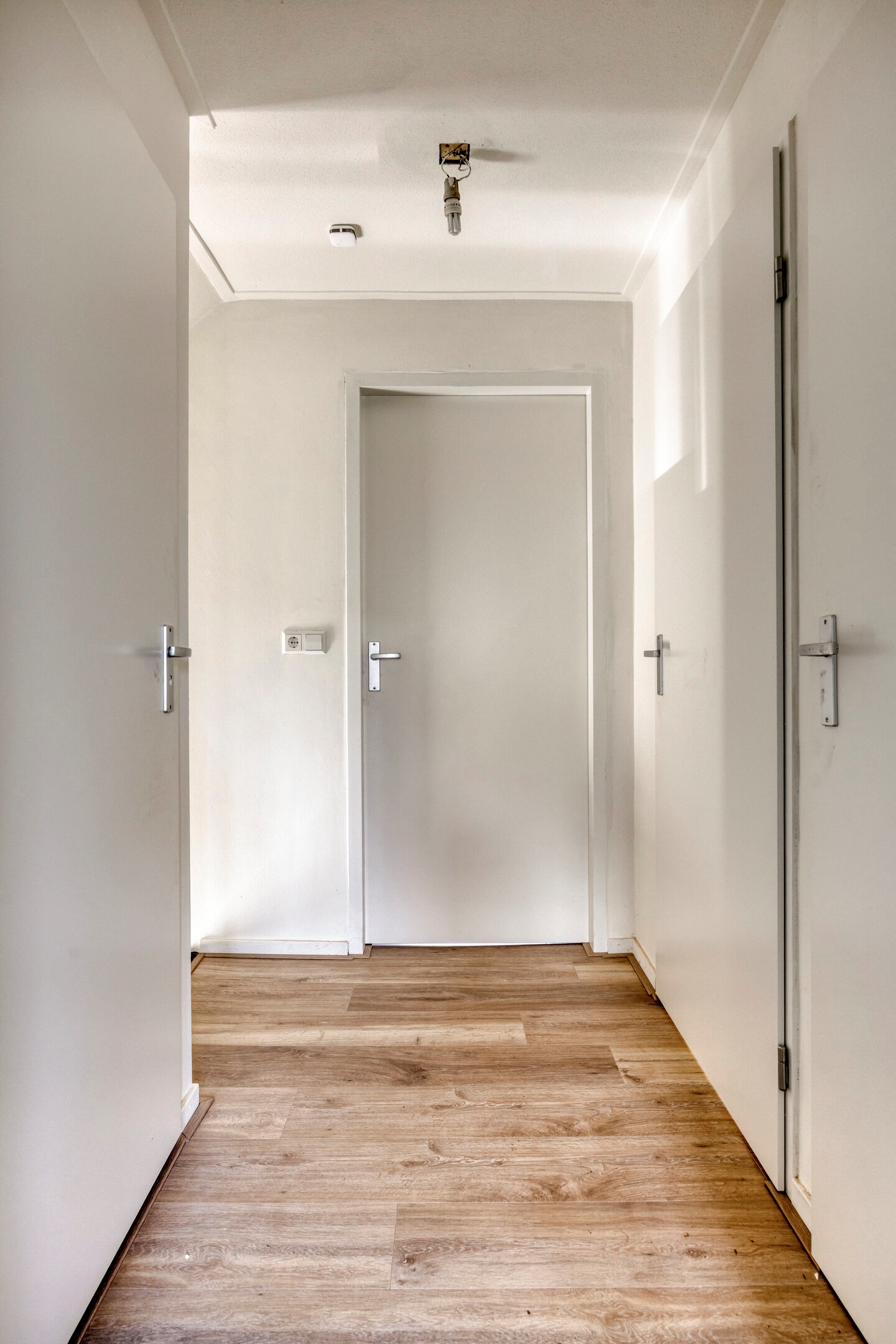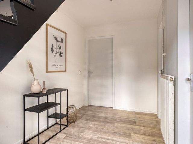 Vanuit de ruime hal heeft u toegang tot de woonkamer met open keuken, de slaapkamer, badkamer, c.v.-ruimte en de trap naar de eerste verdieping.