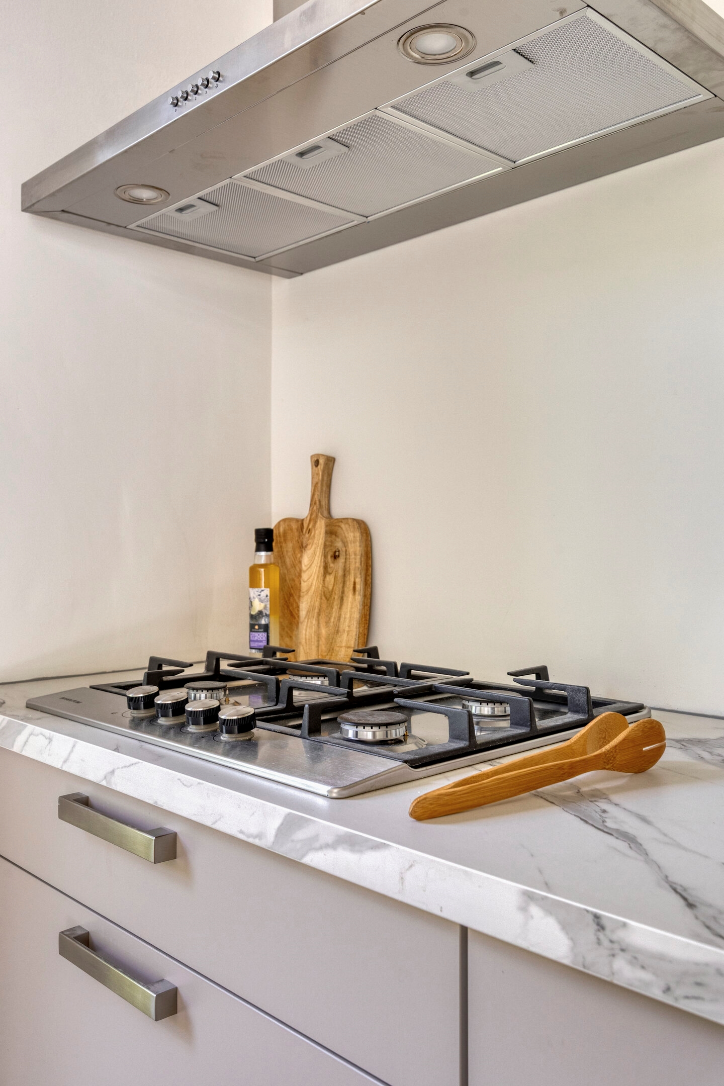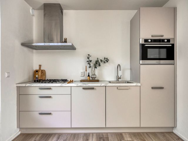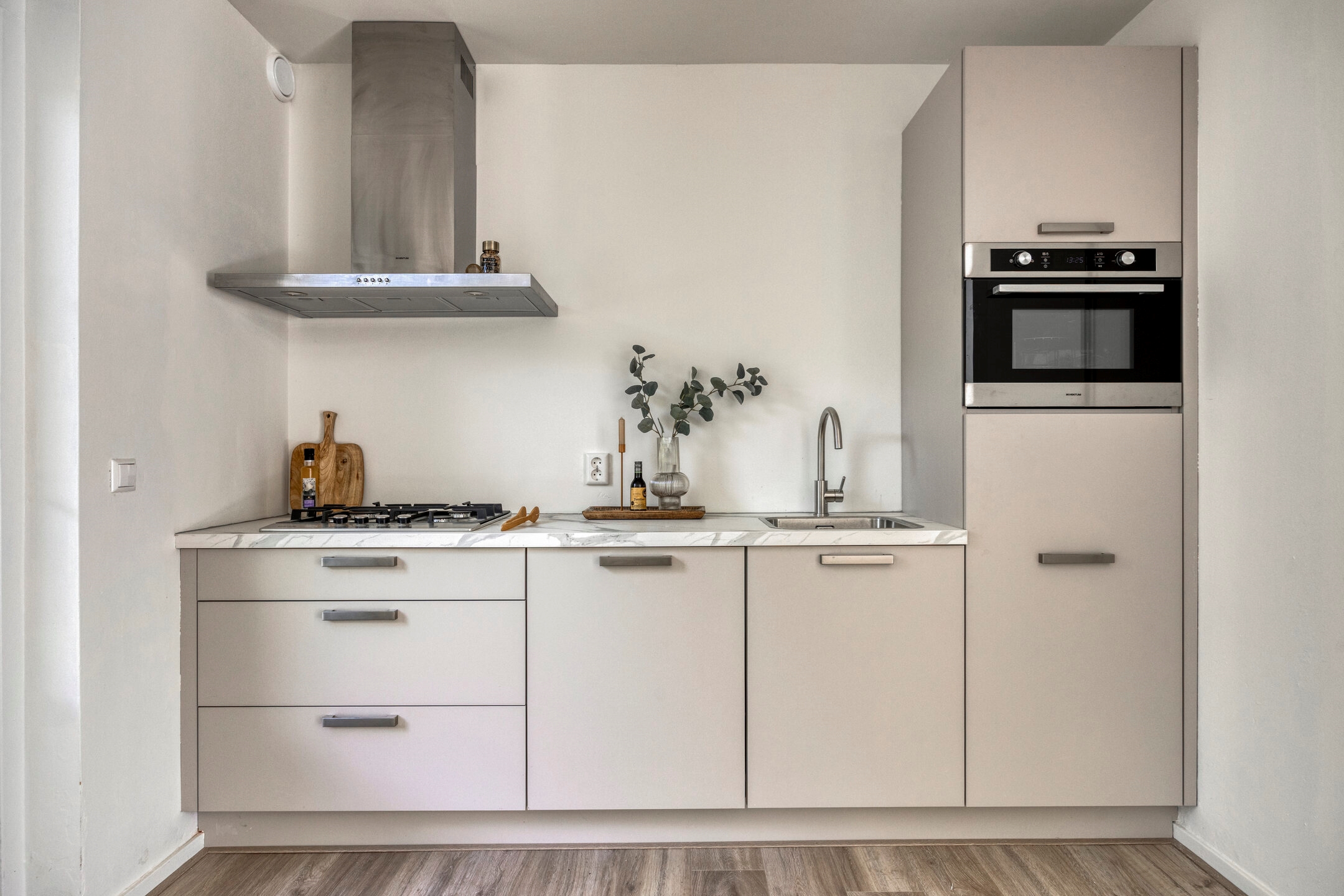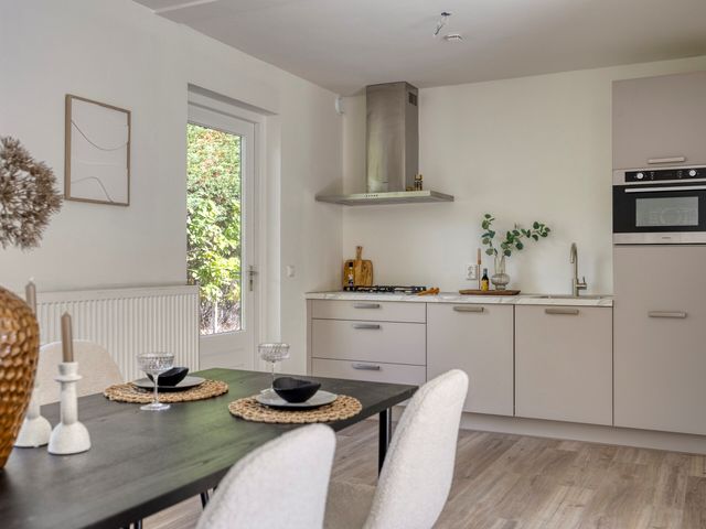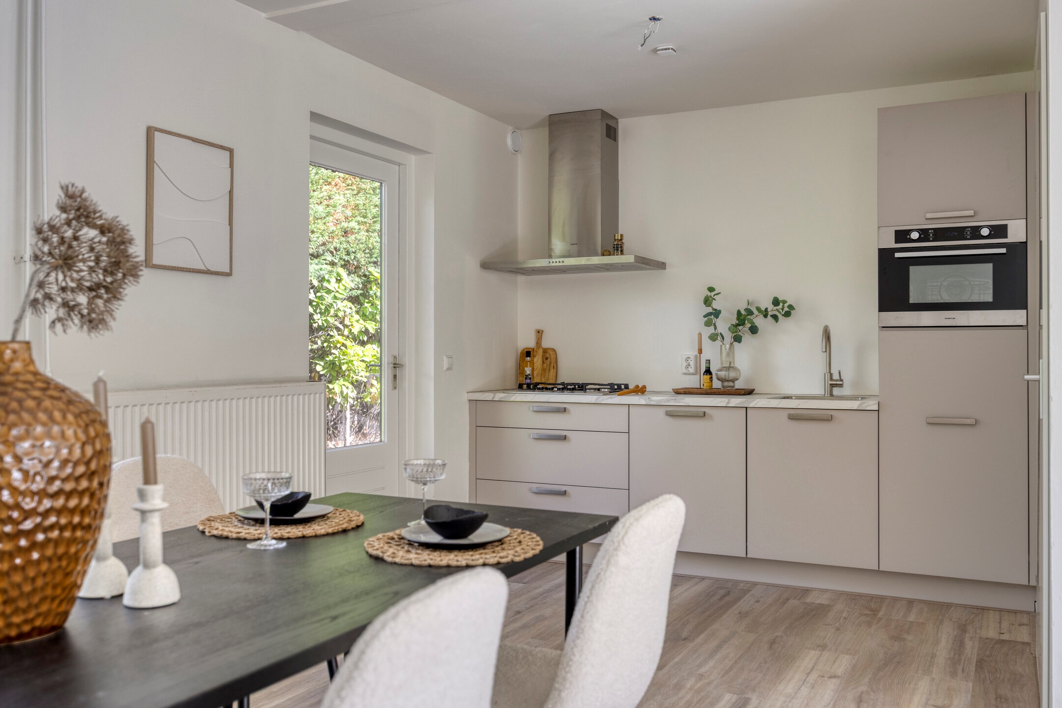 De open keuken biedt volop opbergruimte met diverse onderkasten en lades. De keuken is compleet uitgerust met een 4-pits gaskookplaat, rvs afzuigkap, vaatwasser, combi-oven en koelkast.