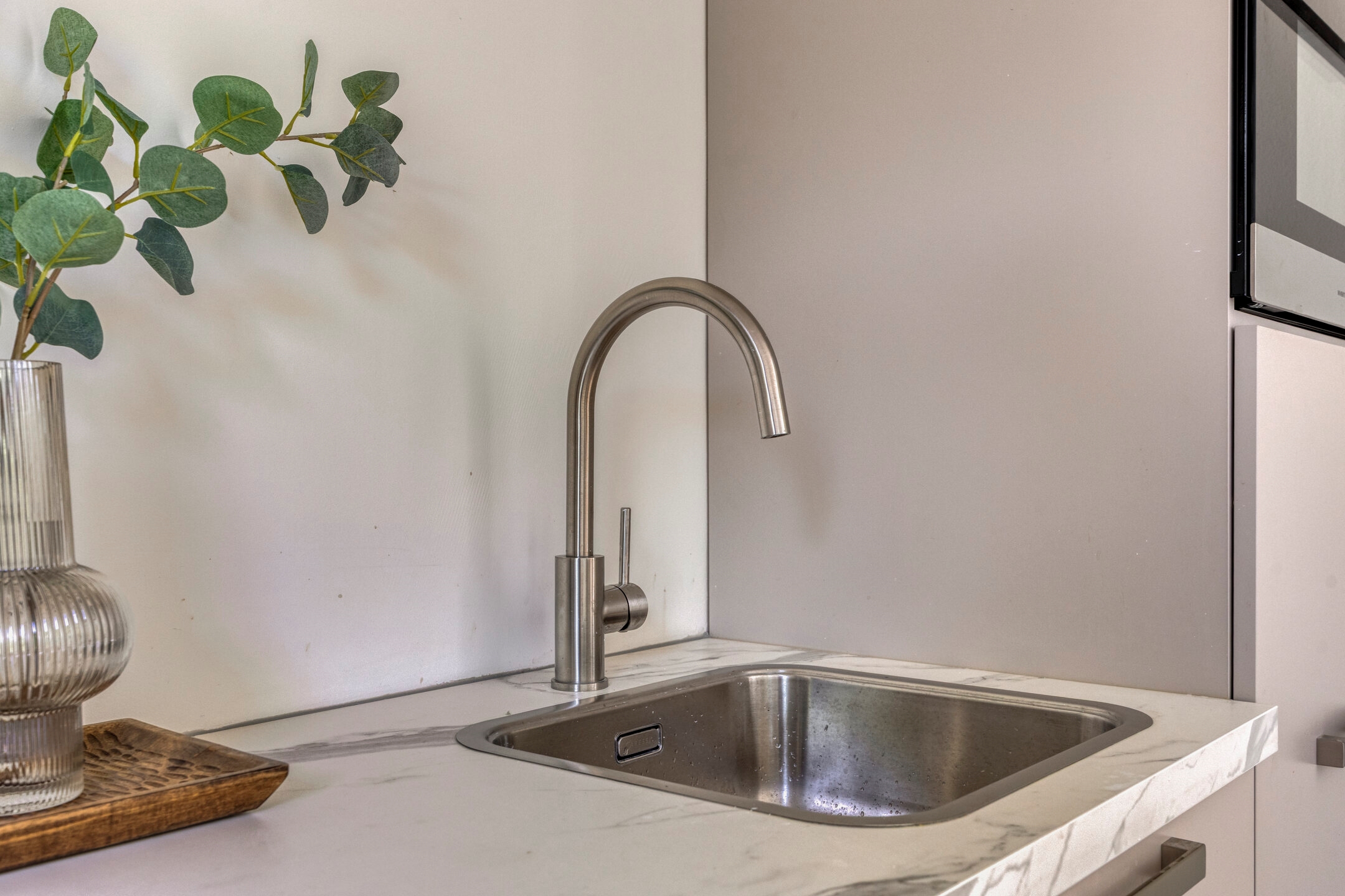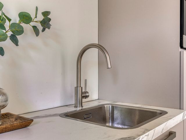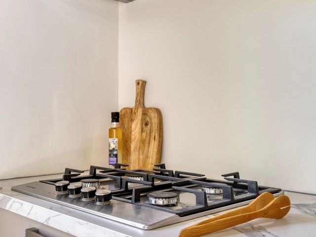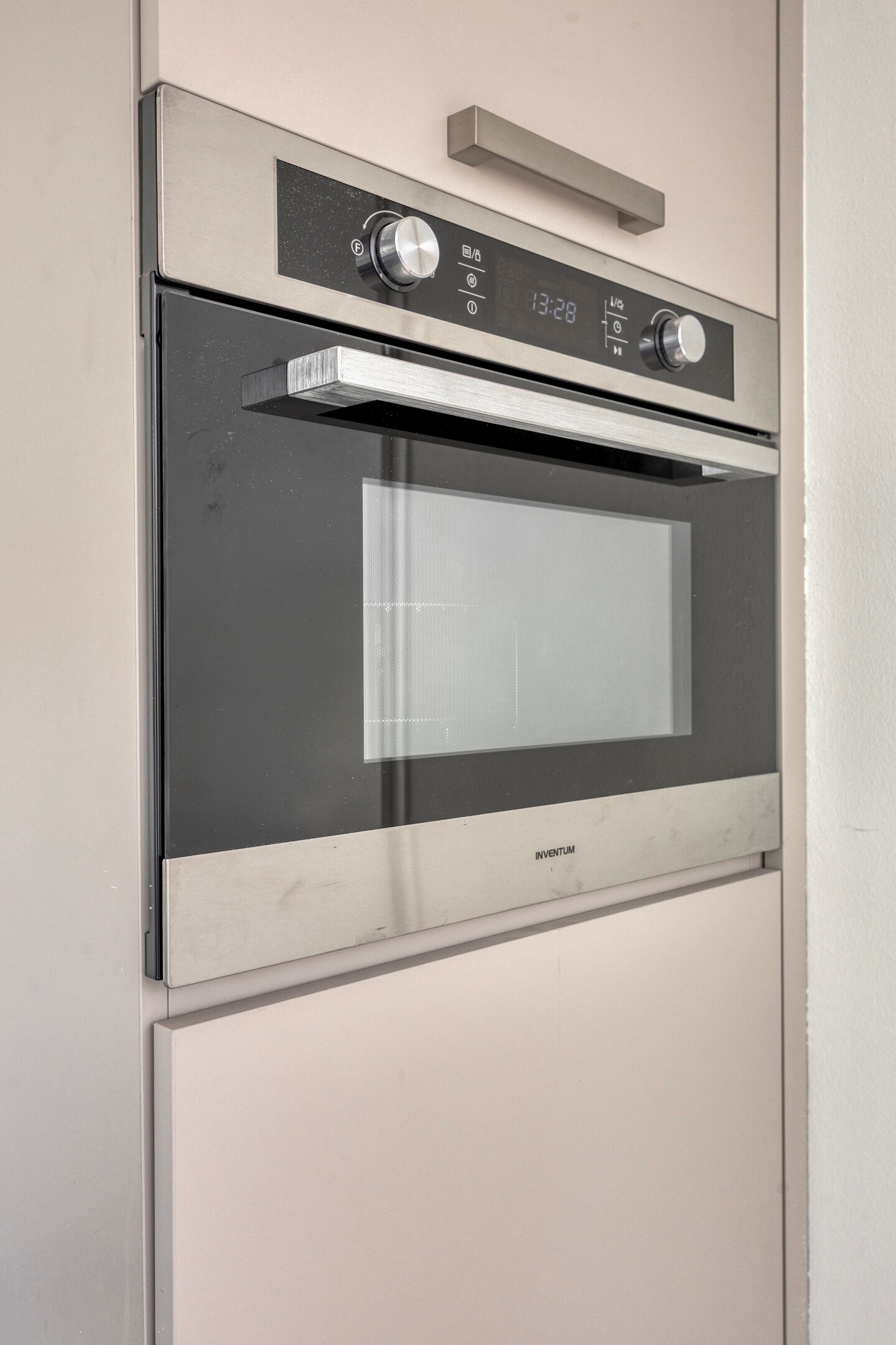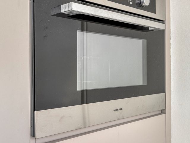De open keuken biedt volop opbergruimte met diverse onderkasten en lades. De keuken is compleet uitgerust met een 4-pits gaskookplaat, rvs afzuigkap, vaatwasser, combi-oven en koelkast.
