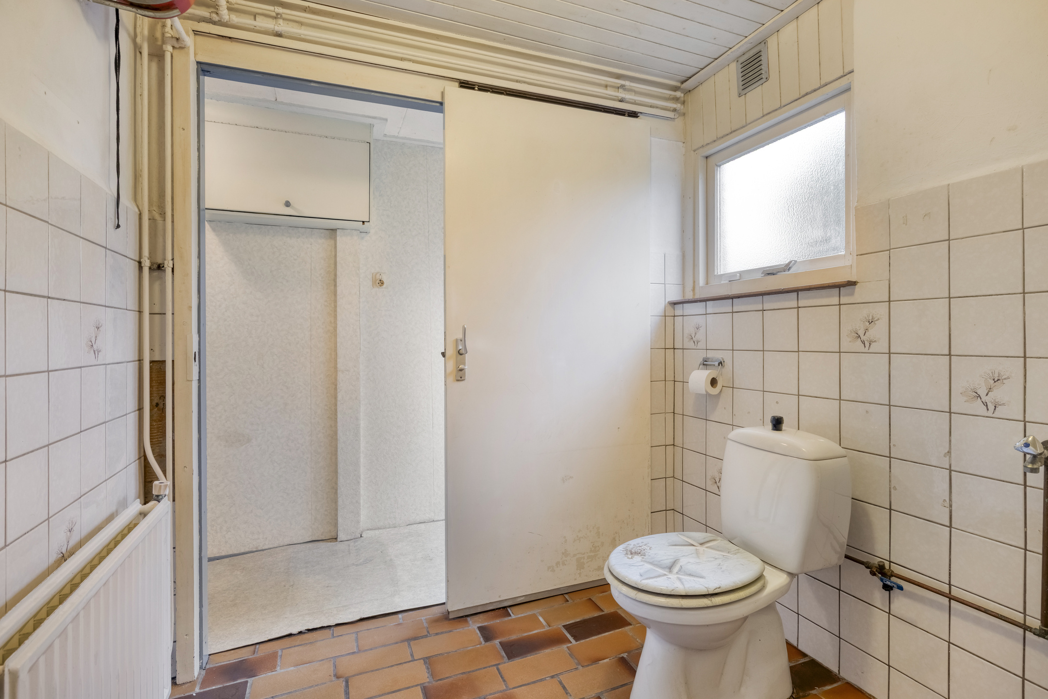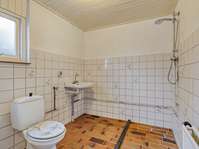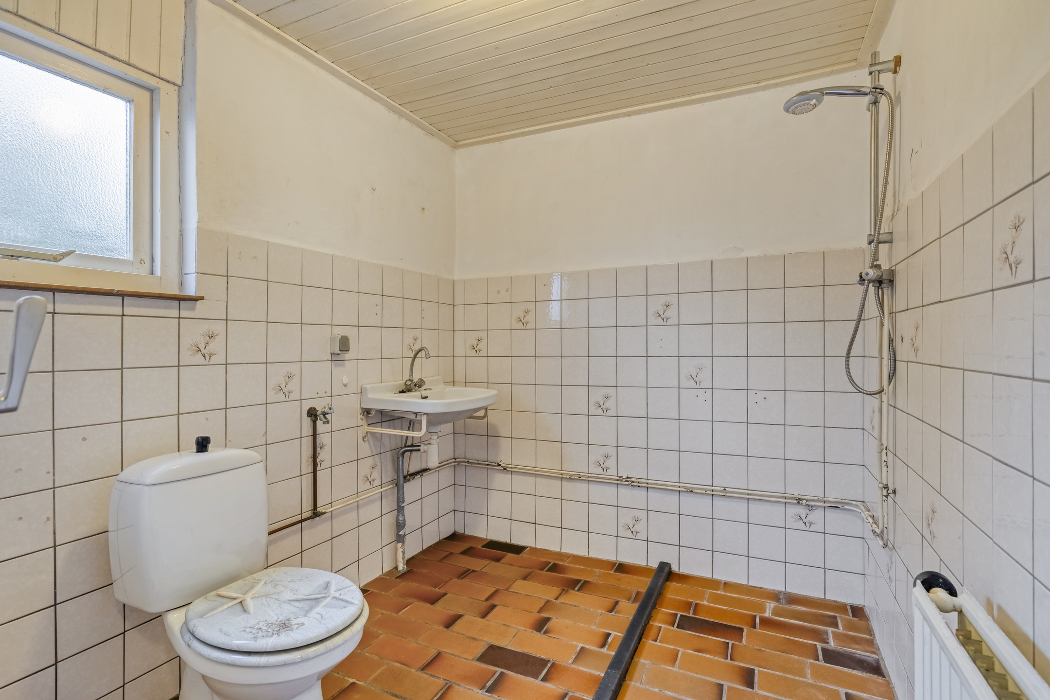 De badkamer is voorzien van een wastafel in een badkamermeubel, een douchecabine, toilet en de wanden en de vloer zijn geheel betegeld. In de badkamer is een aansluiting voor wasapparatuur.