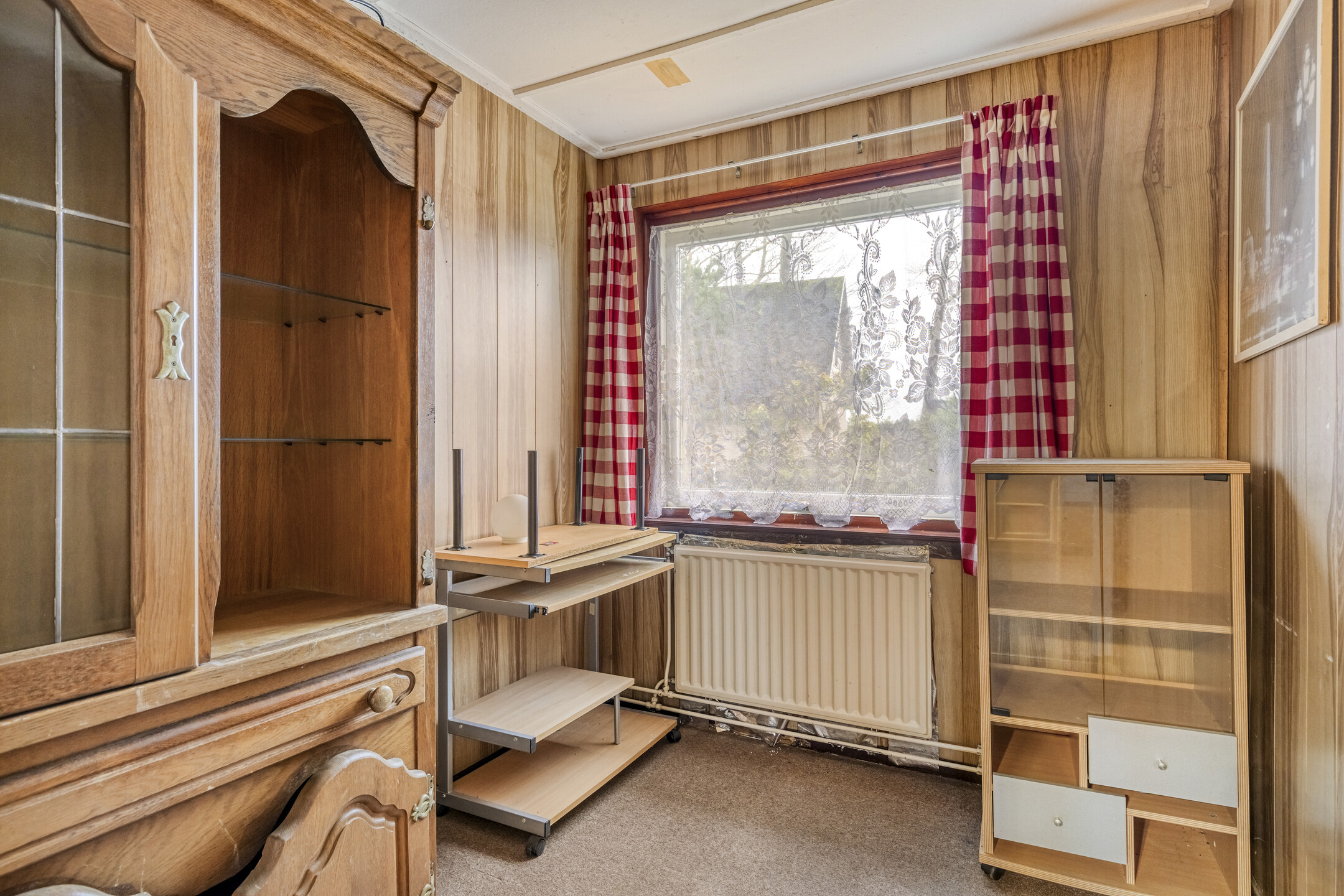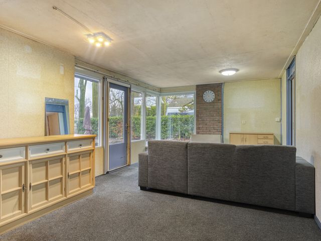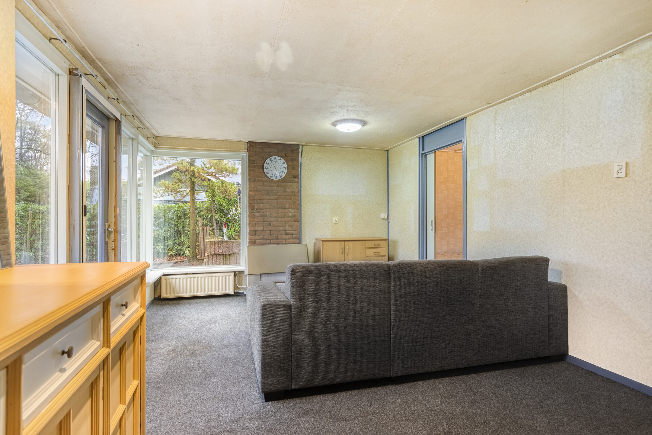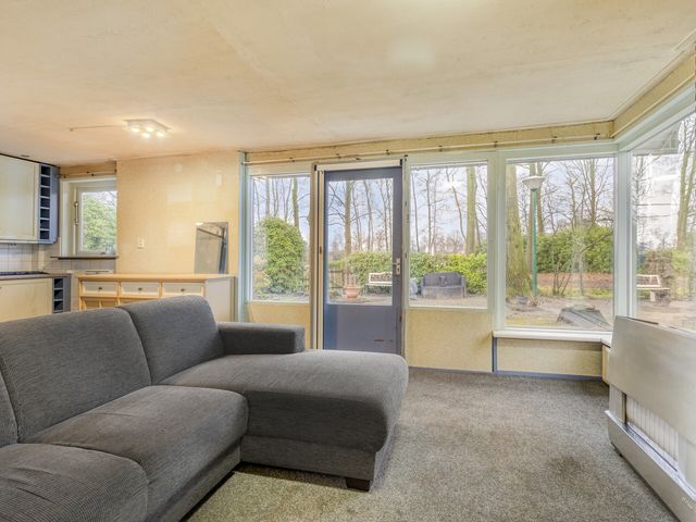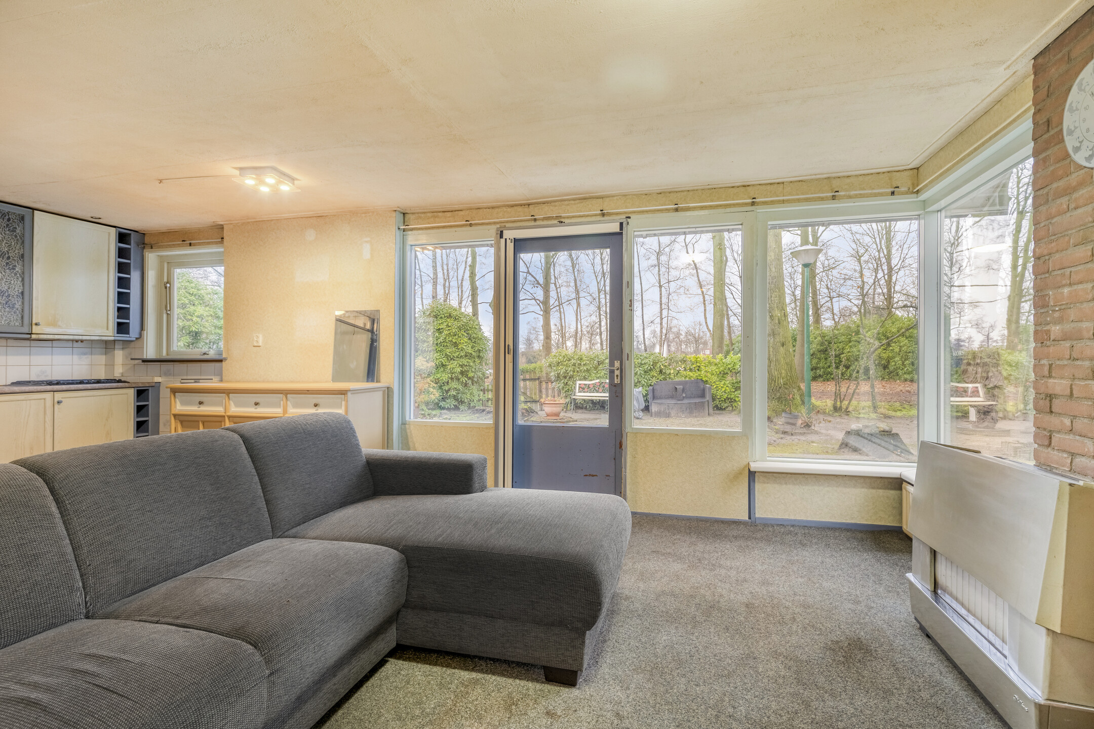 De sfeervolle, tuingerichte woonkamer met een eenvoudig keukenblok, een moederhaard & radiatoren, heeft forse raampartijen, ligt fraai aan de achterzijde, kijkt uit op uw eigen, brede achtertuin, met aangrenzend een parkachtige zone en uitzicht op de vennen.