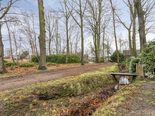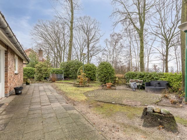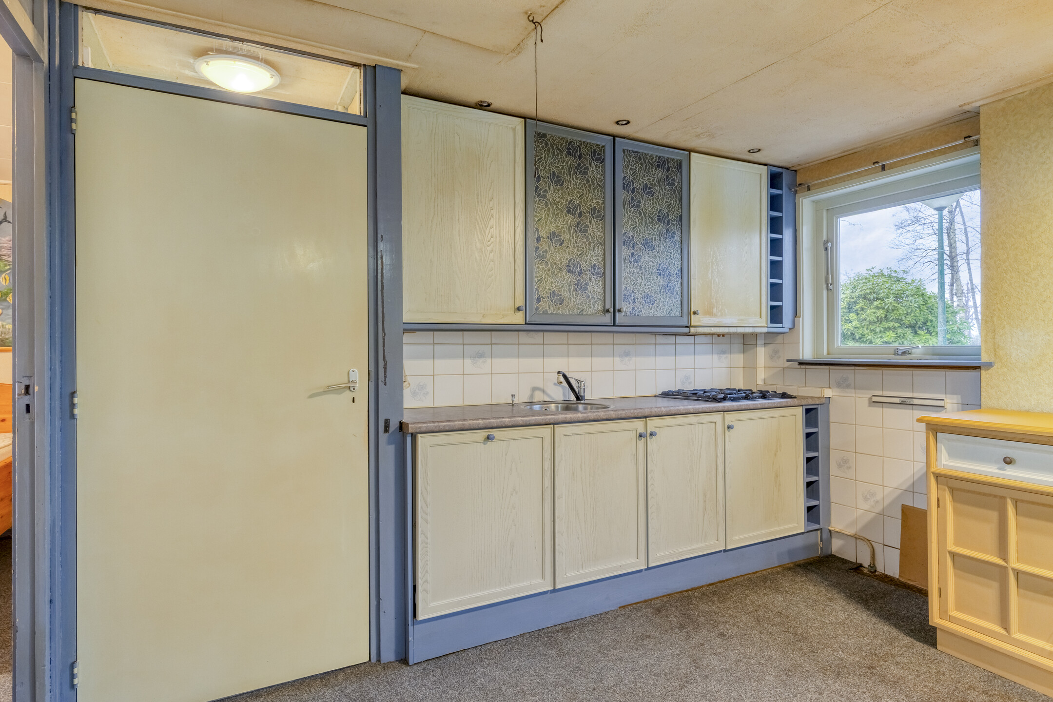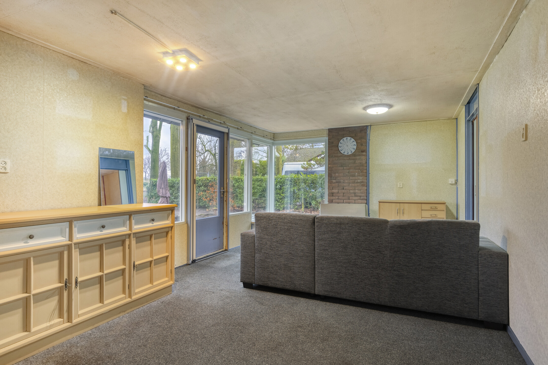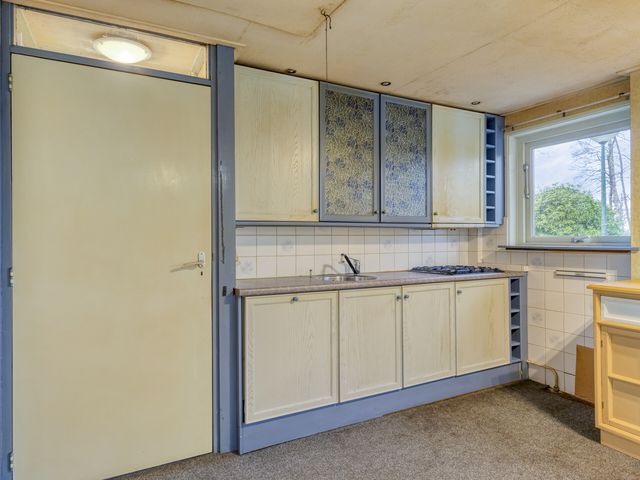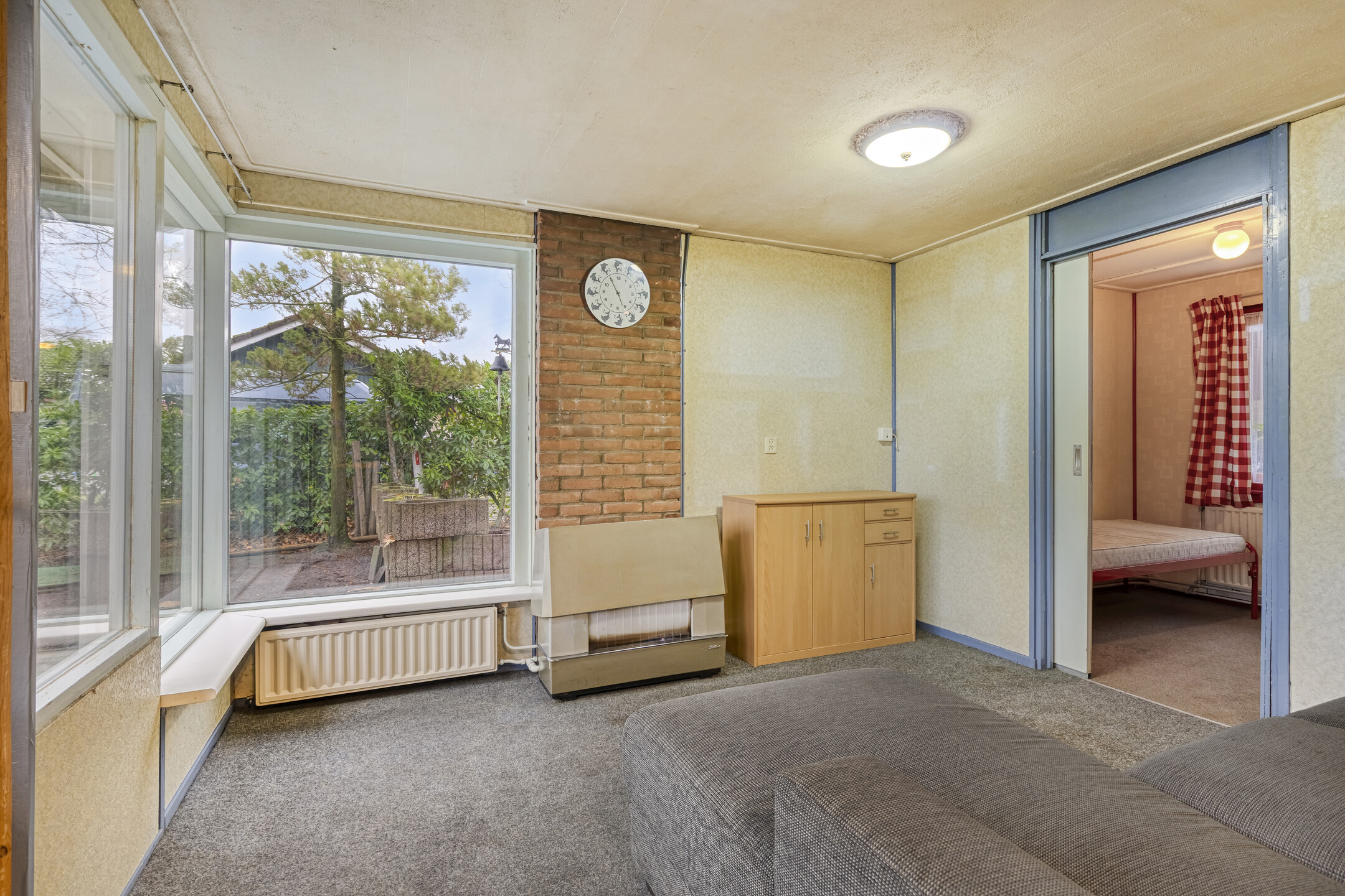 De sfeervolle, tuingerichte woonkamer met een eenvoudig keukenblok, een moederhaard & radiatoren, heeft forse raampartijen, ligt fraai aan de achterzijde, kijkt uit op uw eigen, brede achtertuin, met aangrenzend een parkachtige zone en uitzicht op de vennen.