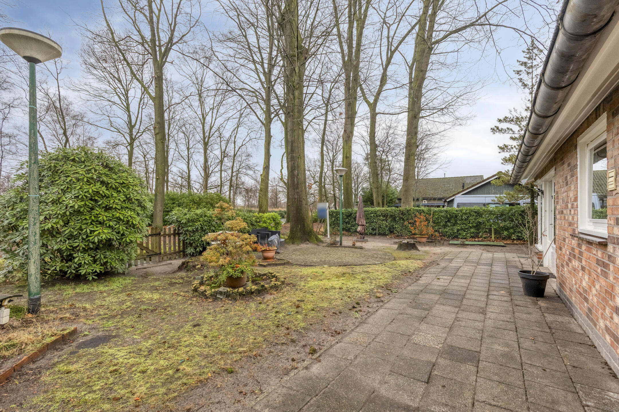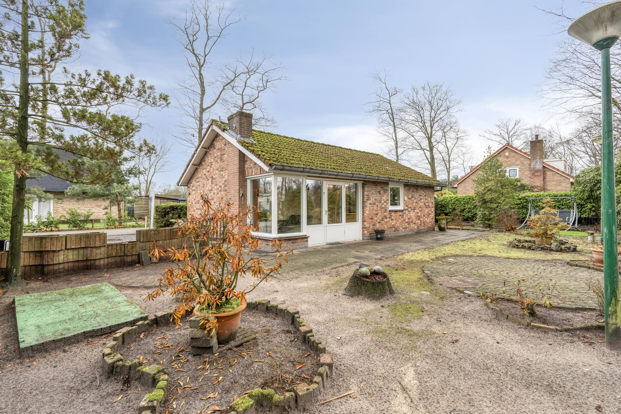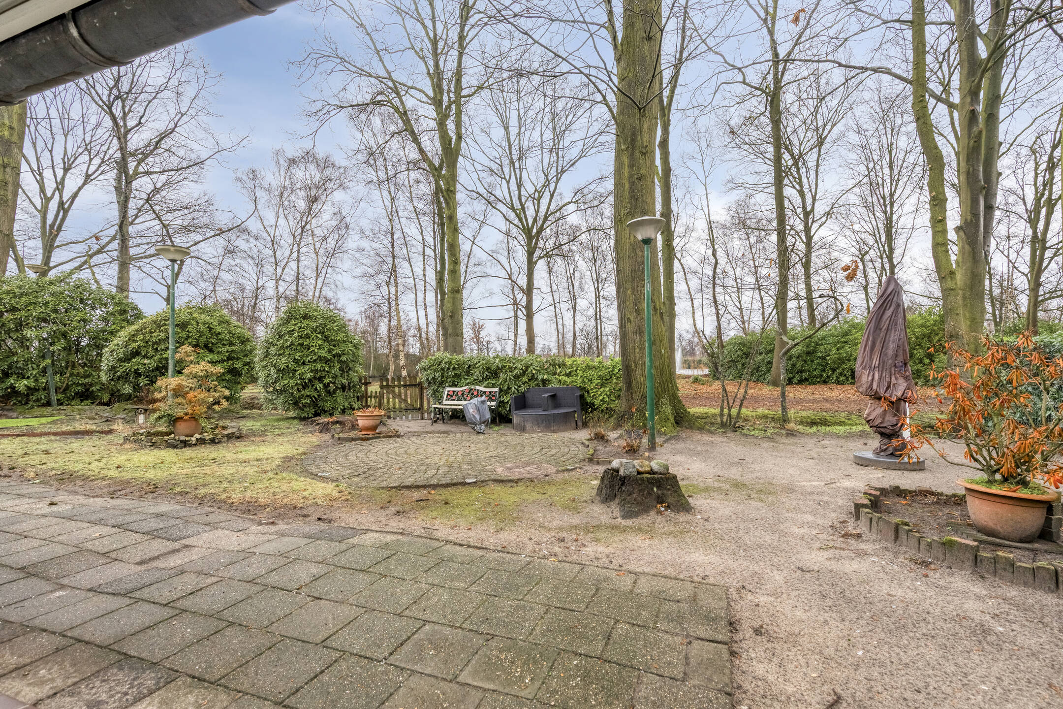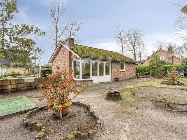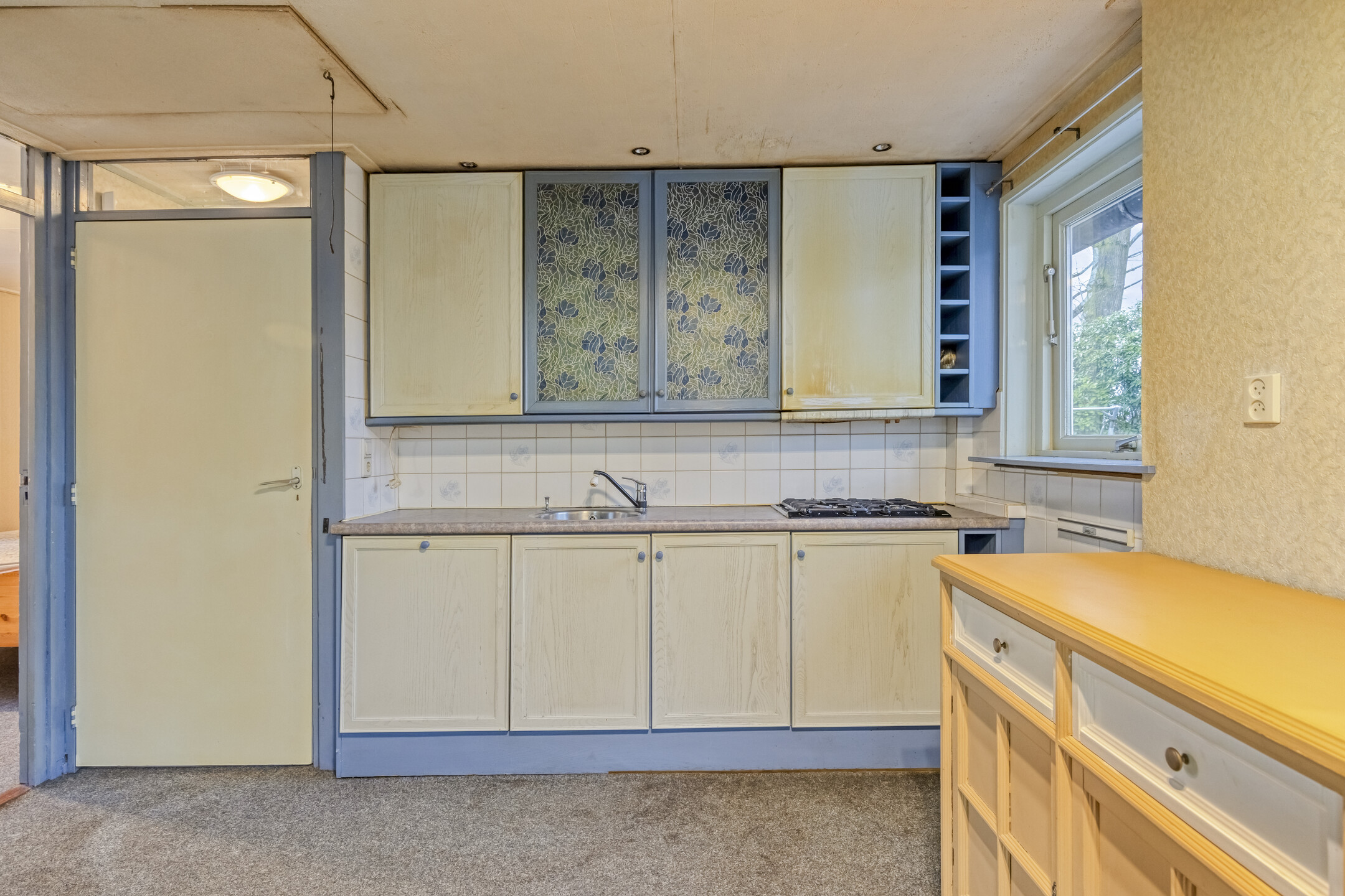 De sfeervolle, tuingerichte woonkamer met een eenvoudig keukenblok, een moederhaard & radiatoren, heeft forse raampartijen, ligt fraai aan de achterzijde, kijkt uit op uw eigen, brede achtertuin, met aangrenzend een parkachtige zone en uitzicht op de vennen.