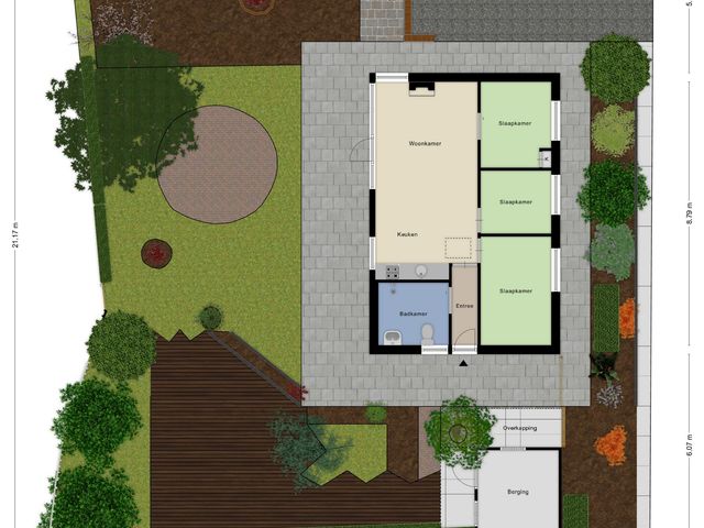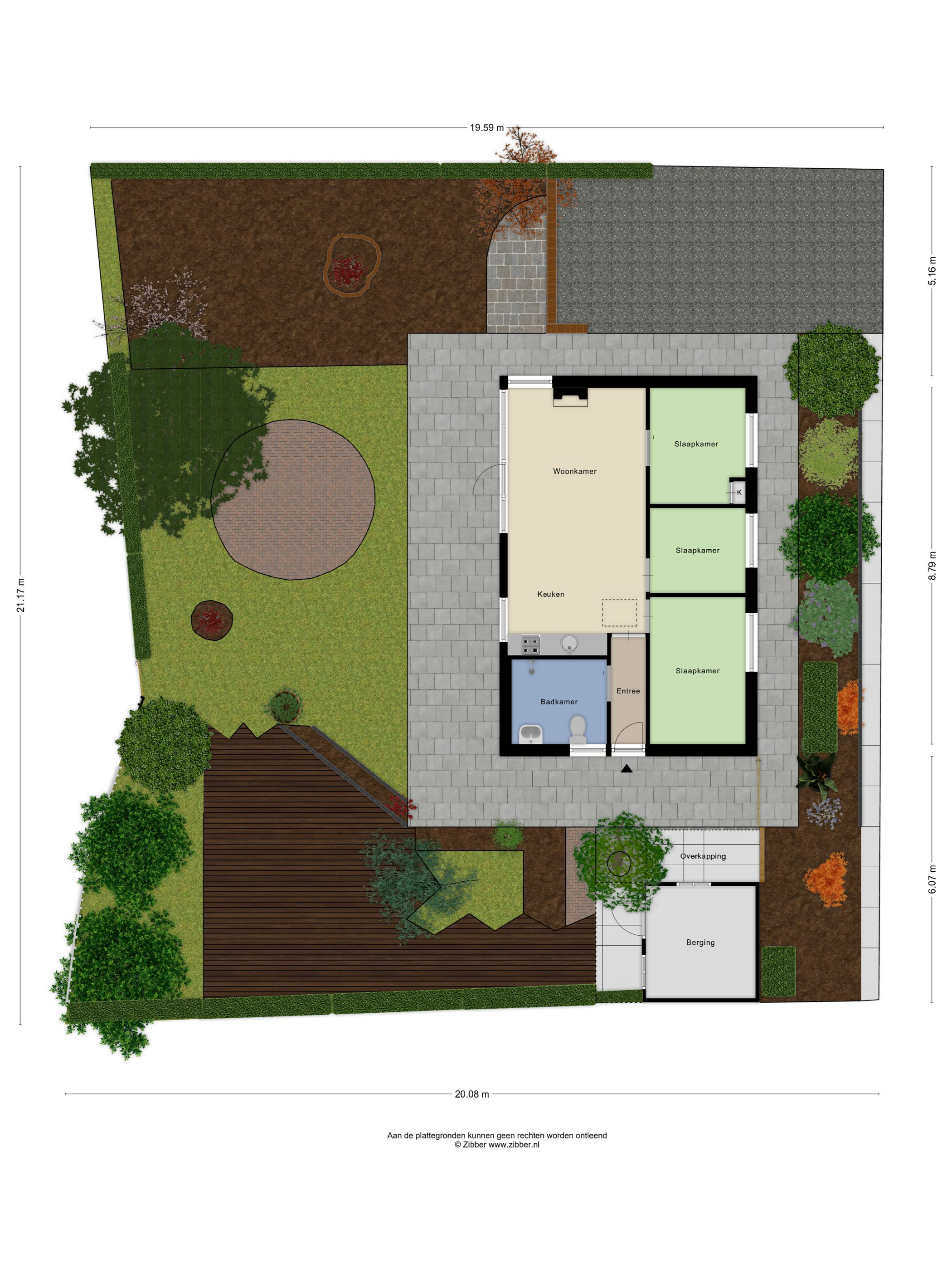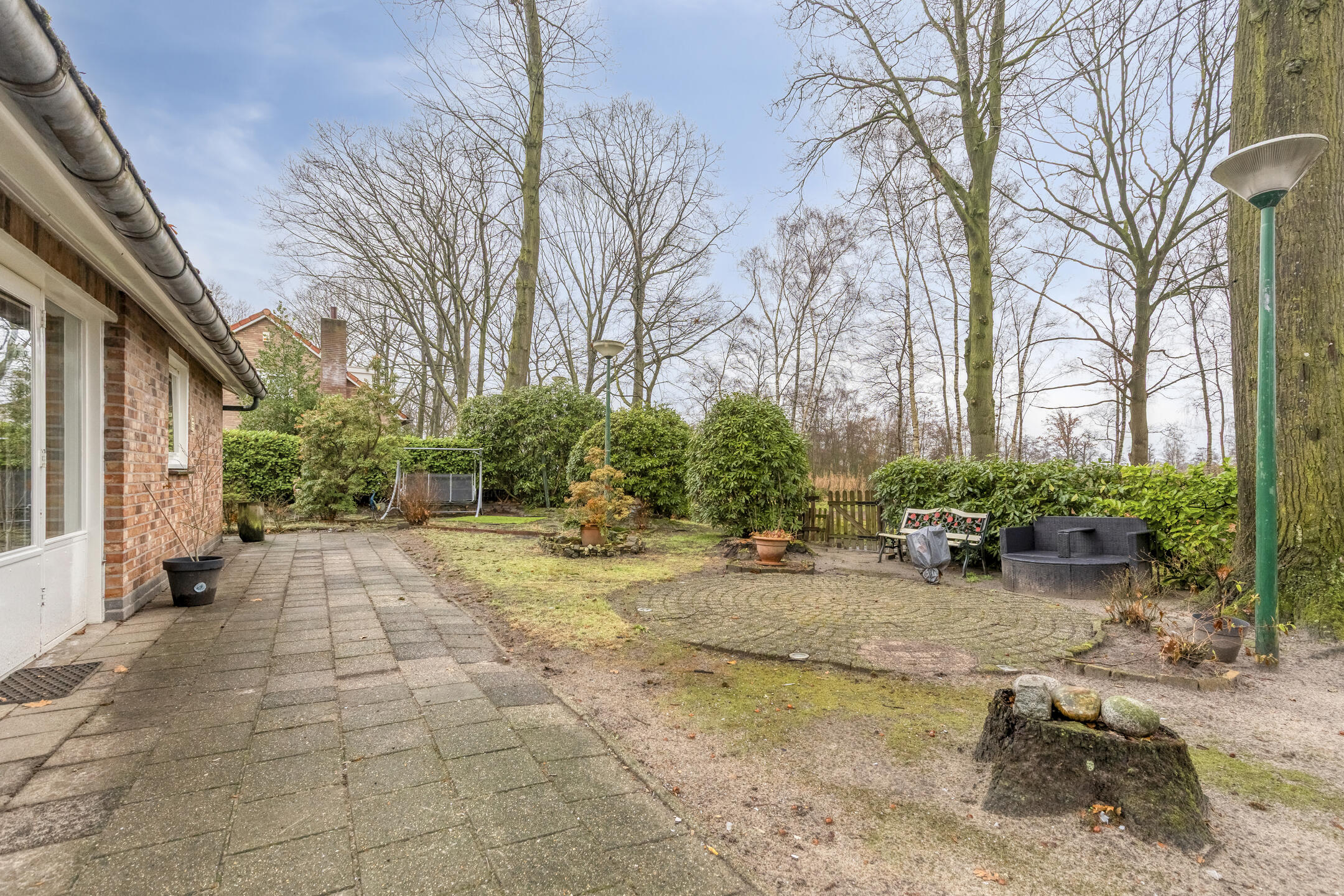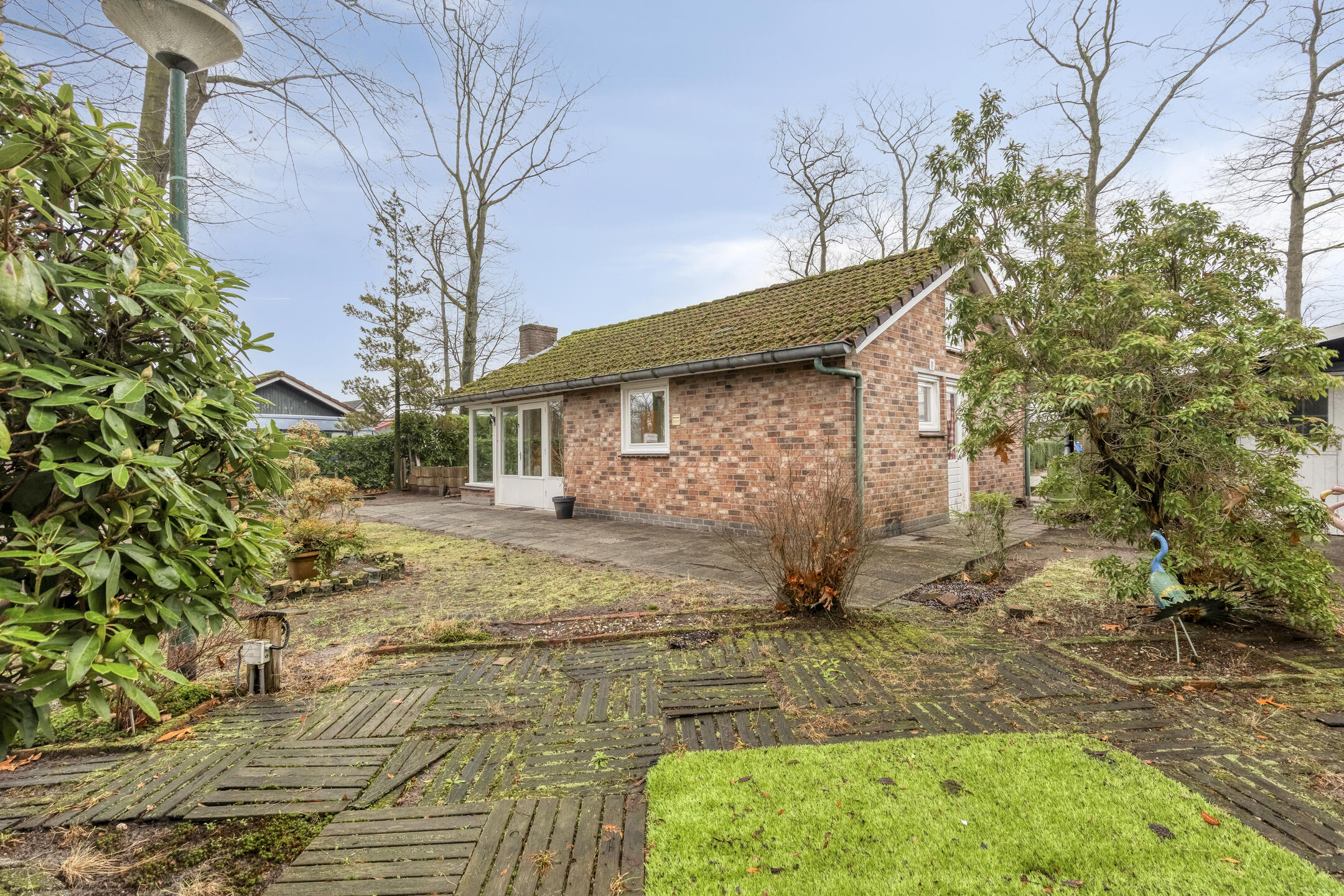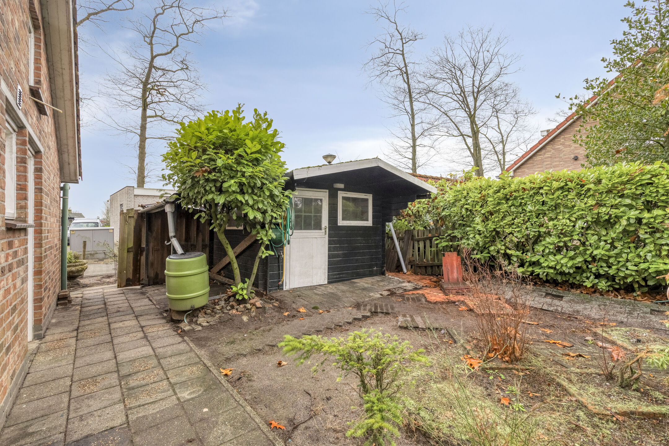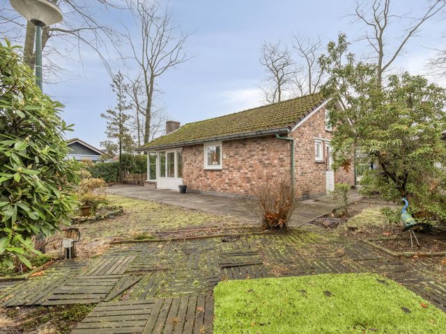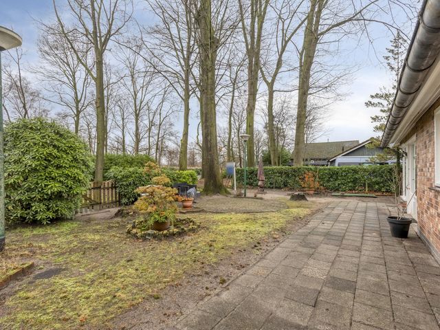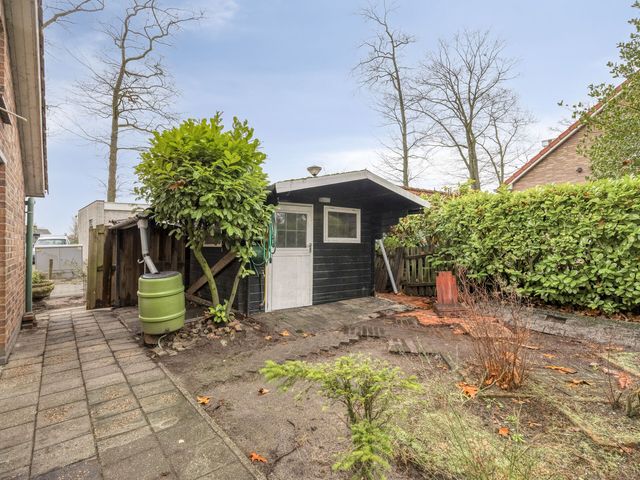 De tuin is voorzien van bestrating, vaste beplanting en een tuinhuis.
