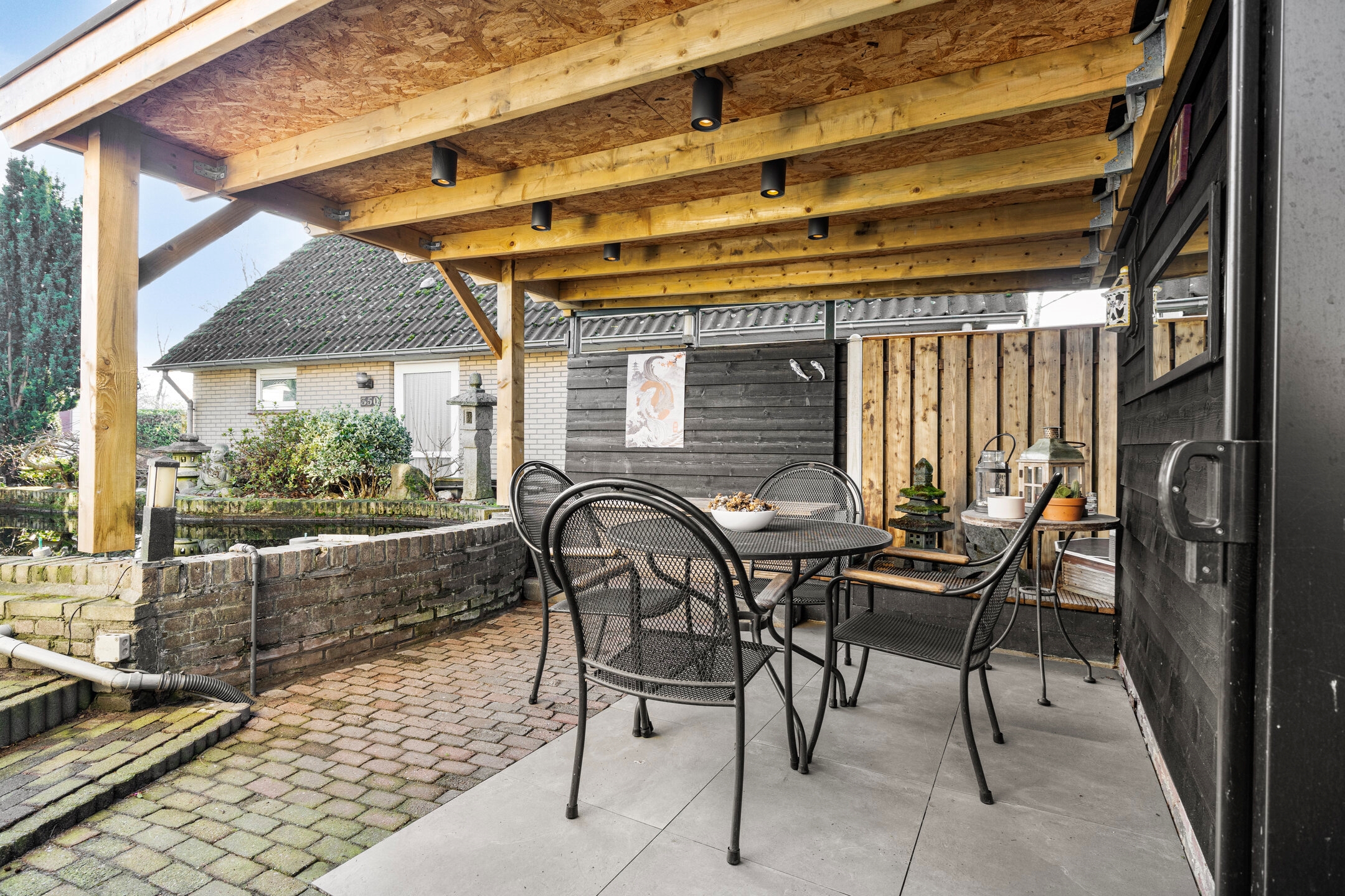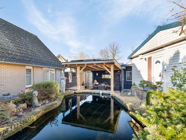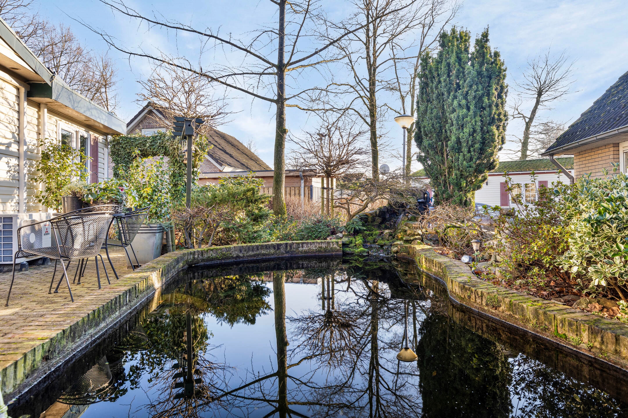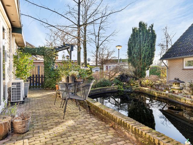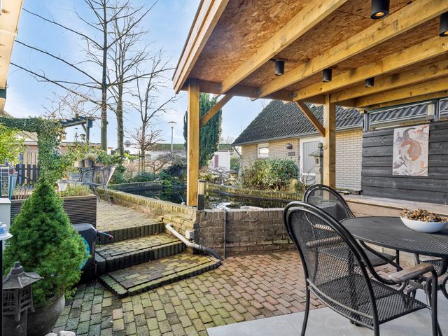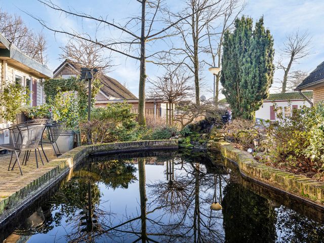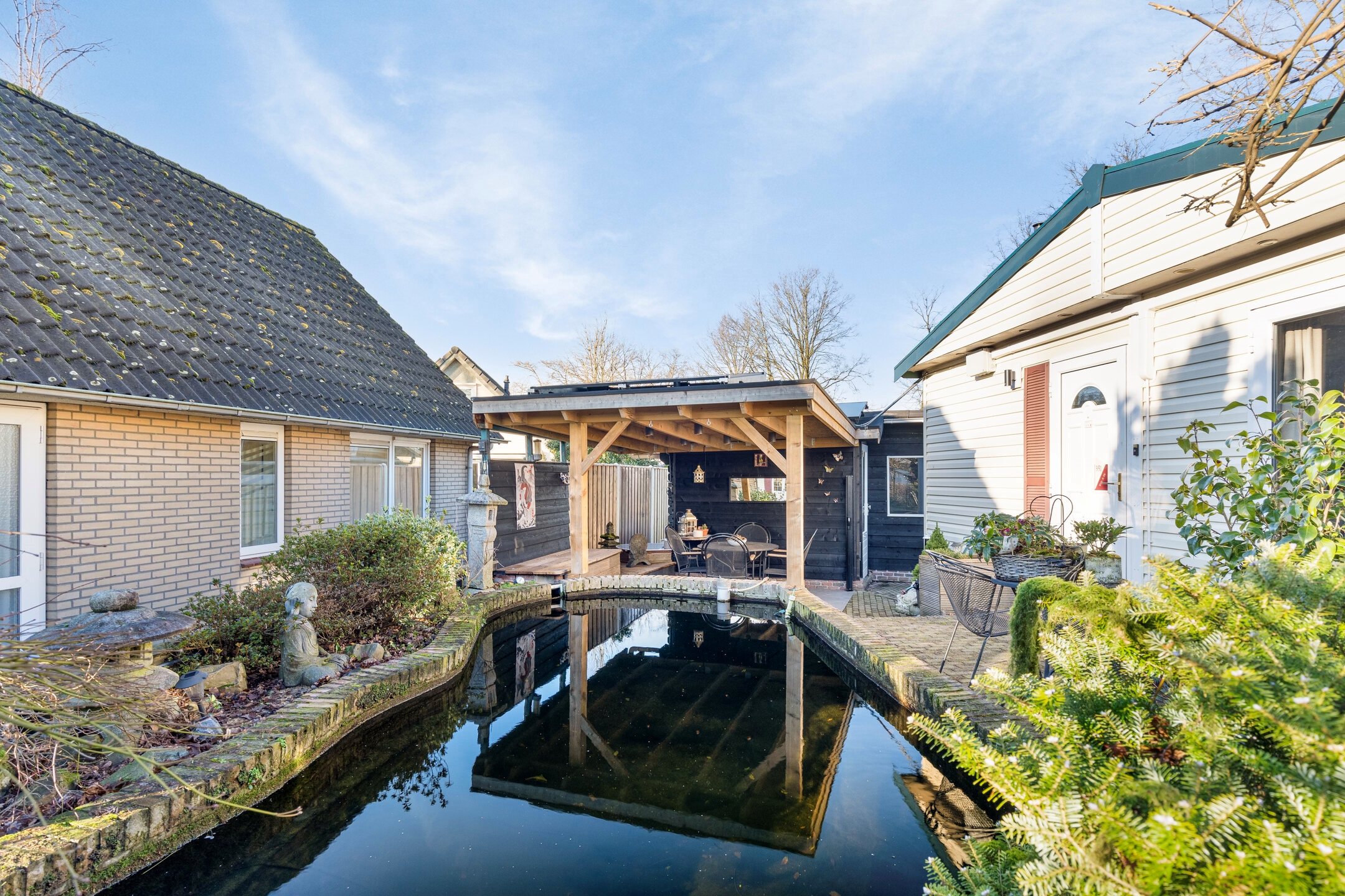 De tuin biedt voldoende privacy en is voorzien van sierbestrating, diverse vaste planten en een vijver. De sfeervolle overkapping is een heerlijk plekje om te genieten van de tuin. De twee bergingen zijn ideale ruimtes voor bijvoorbeeld het opbergen van uw tuinspullen. Een berging is voorzien van een praktisch keukenblok.