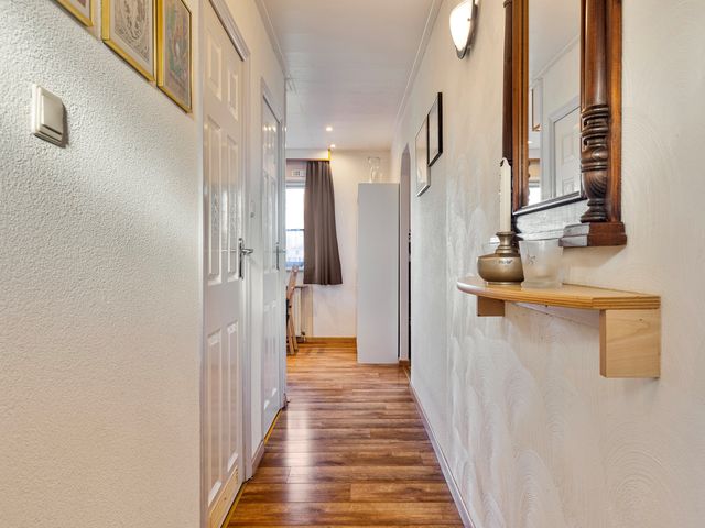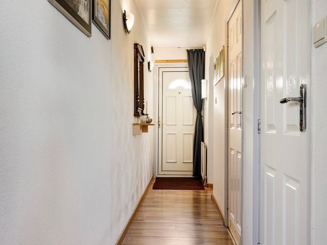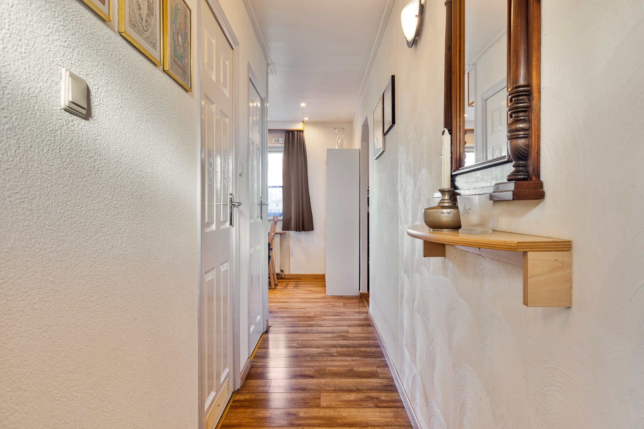 De hal is een lichte ruimte met toegang tot de woonkamer, het toilet, de badkamer en het kantoor.