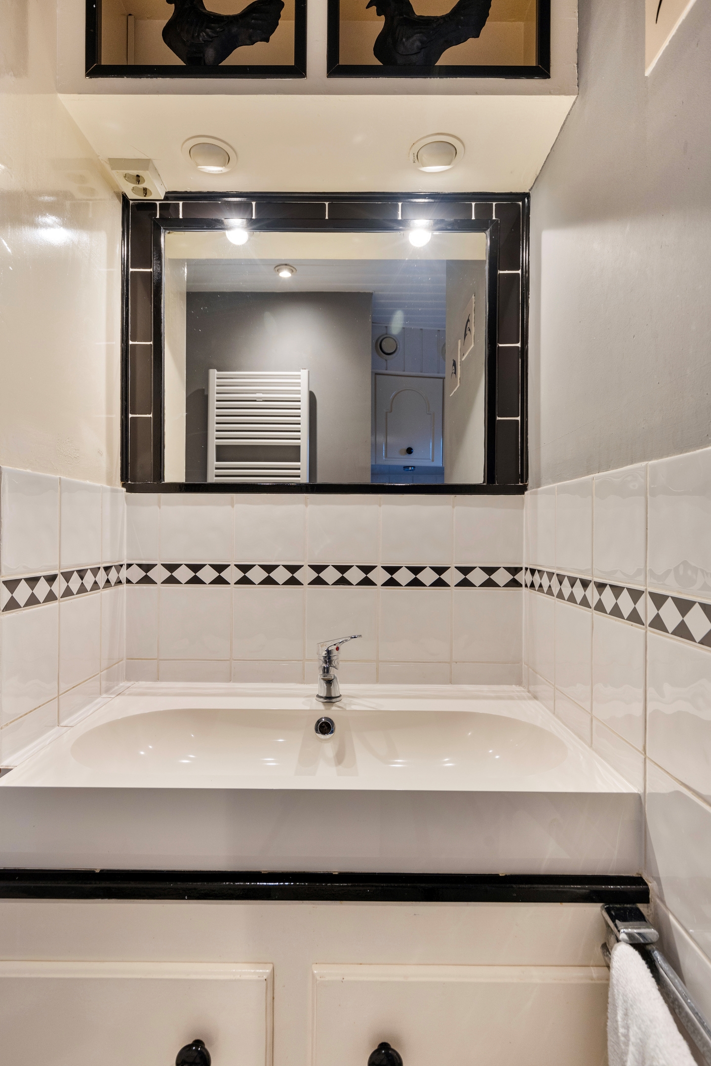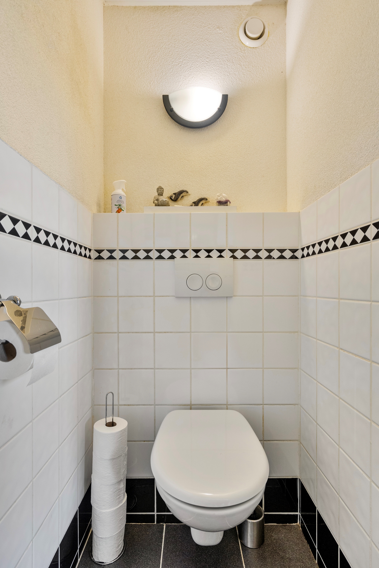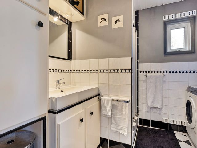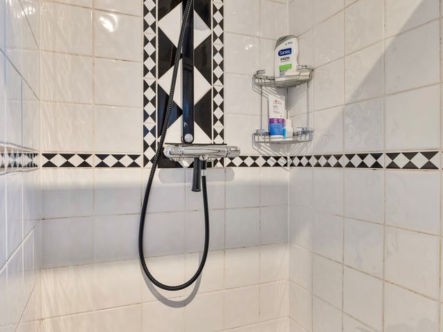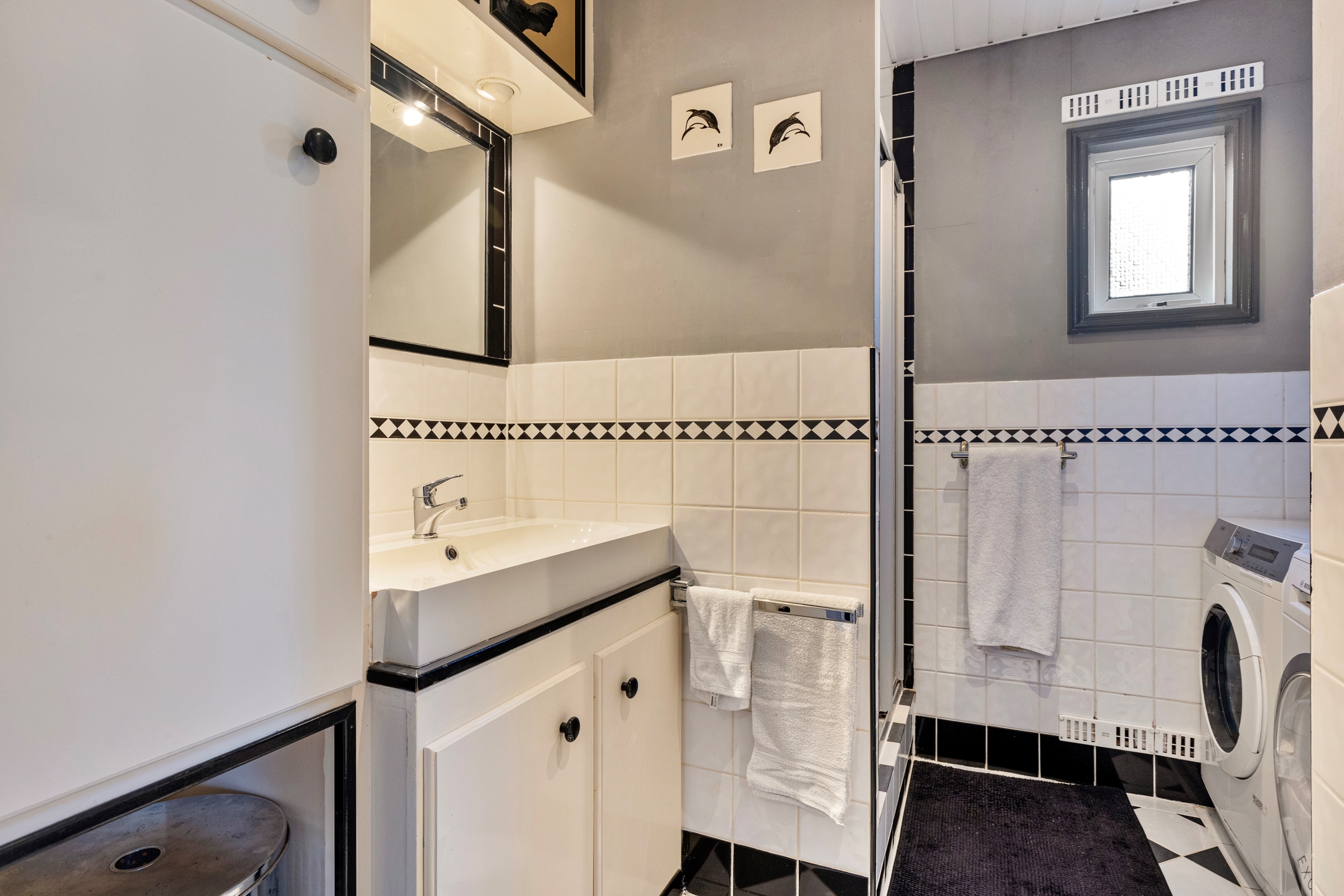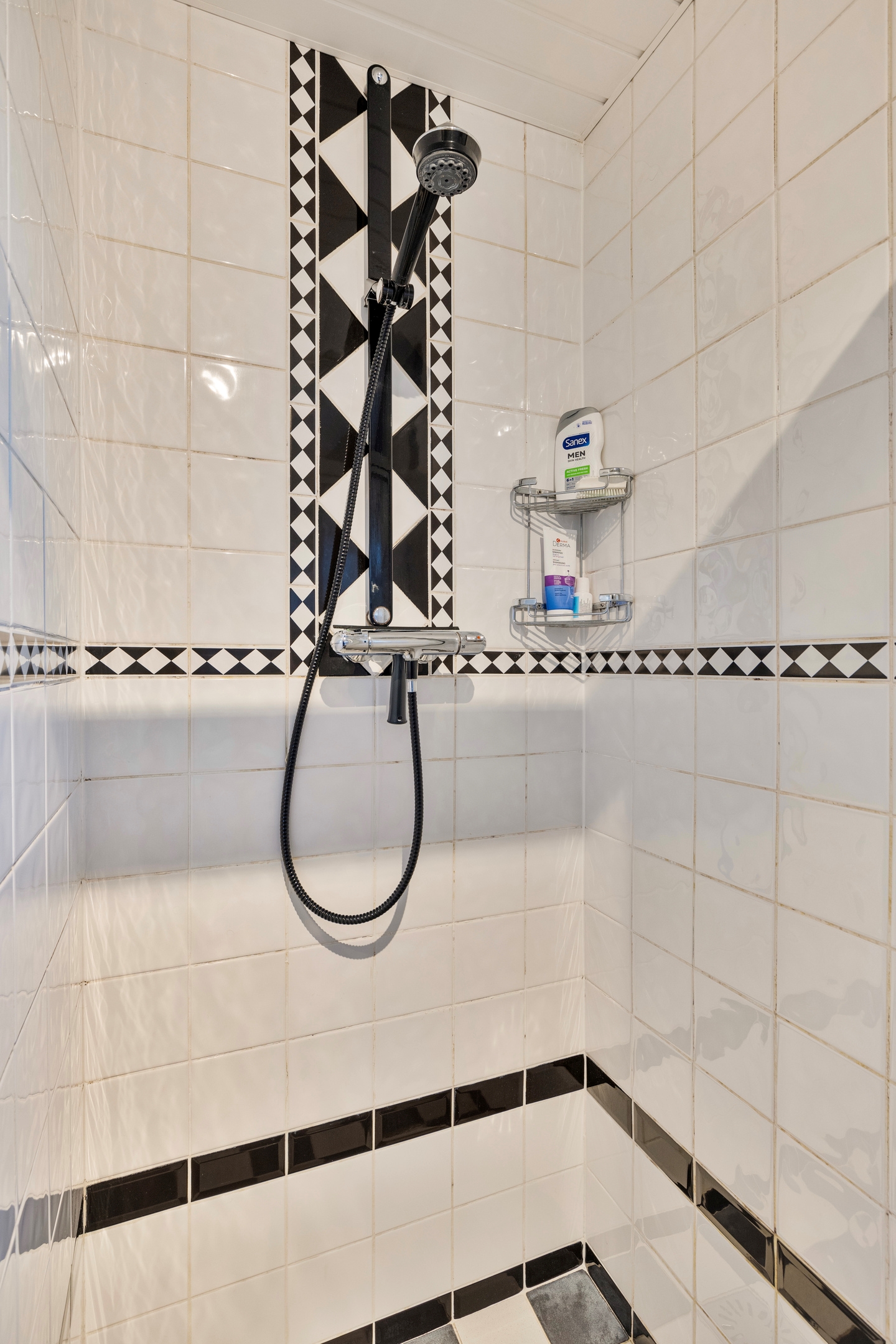 De badkamer is voorzien van een douche en wastafel in badkamermeubel. De badkamer is deels betegeld. Tevens zit er in de badkamer een aansluiting voor een wasmachine en droger.