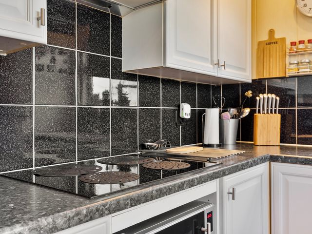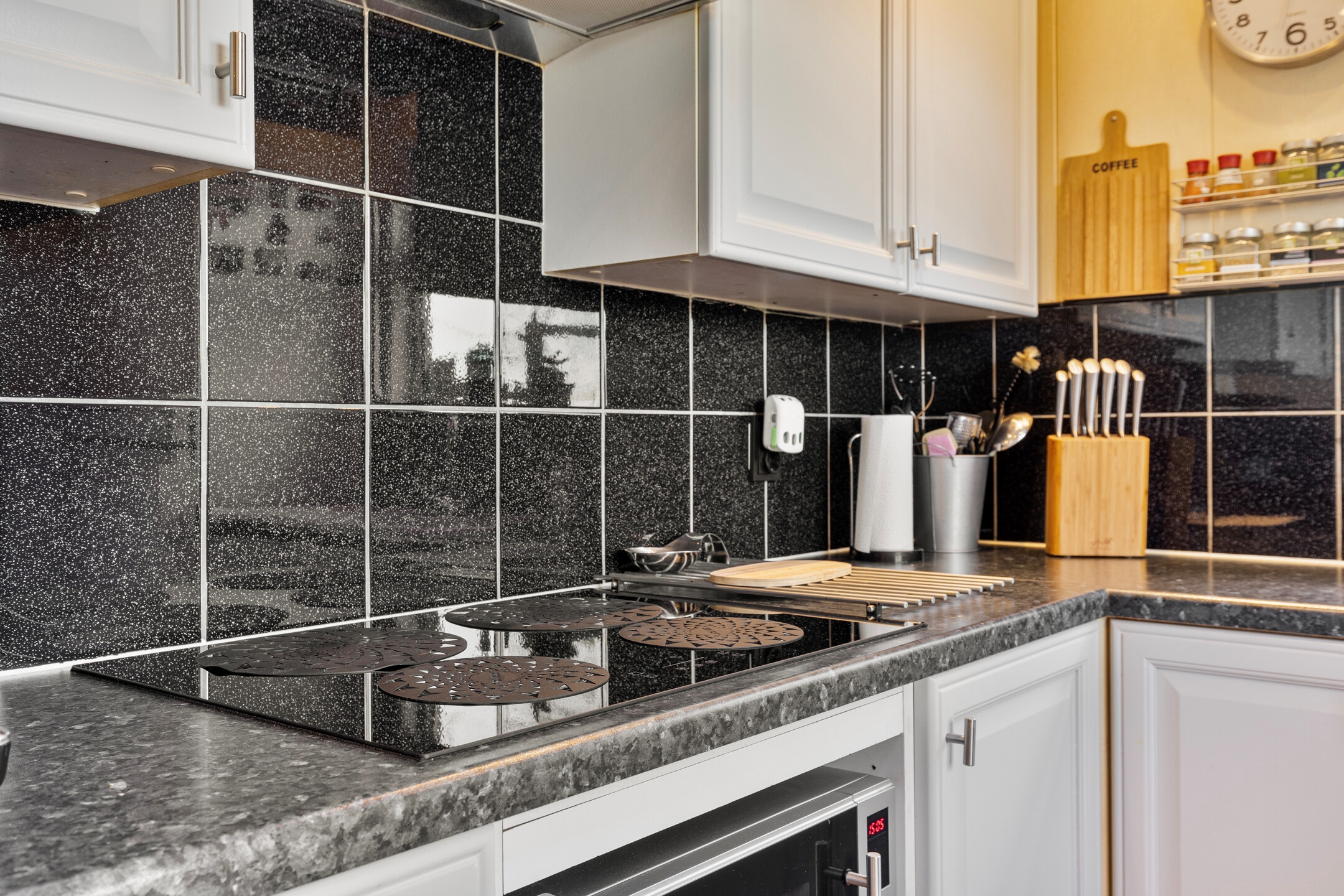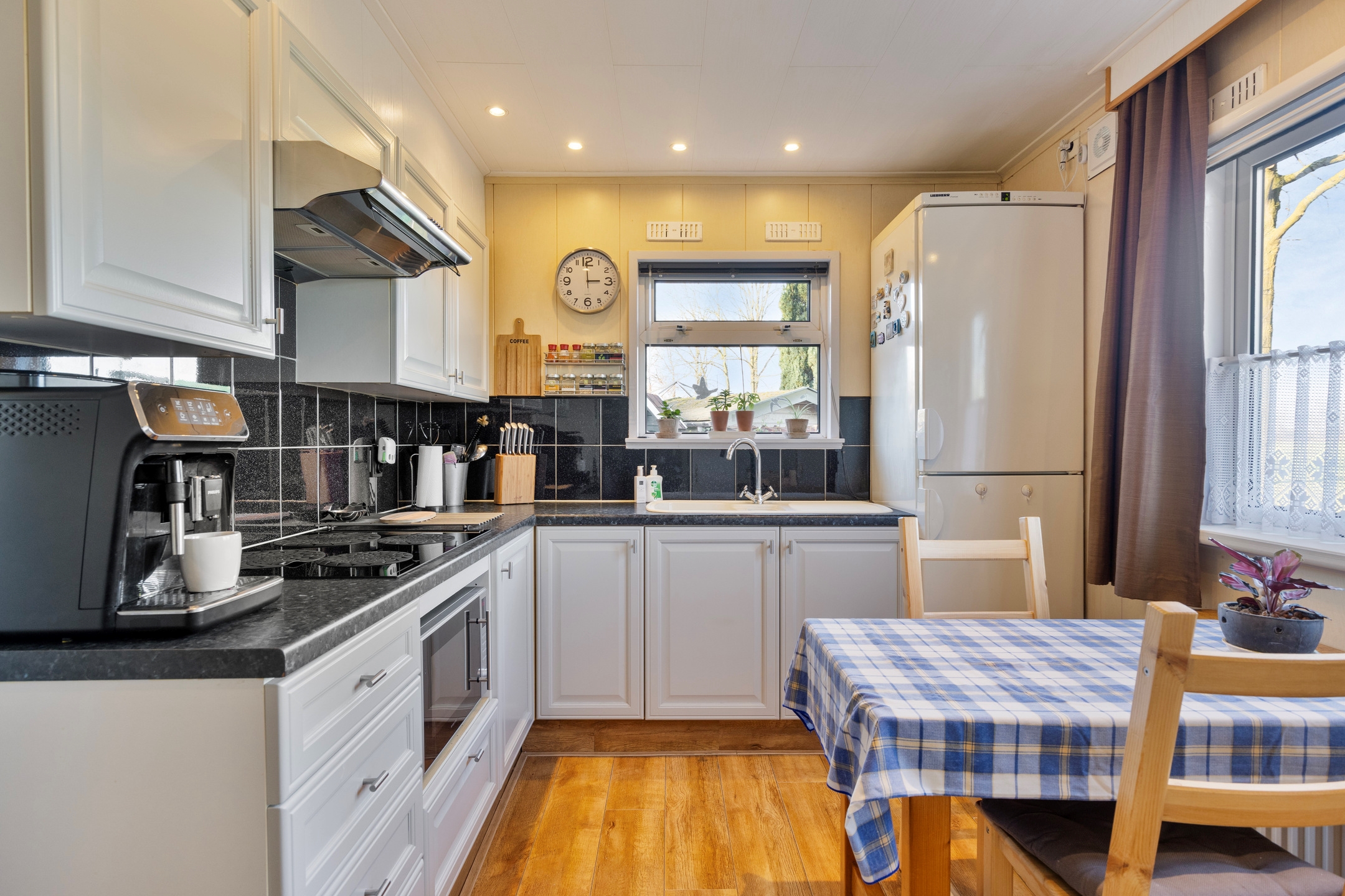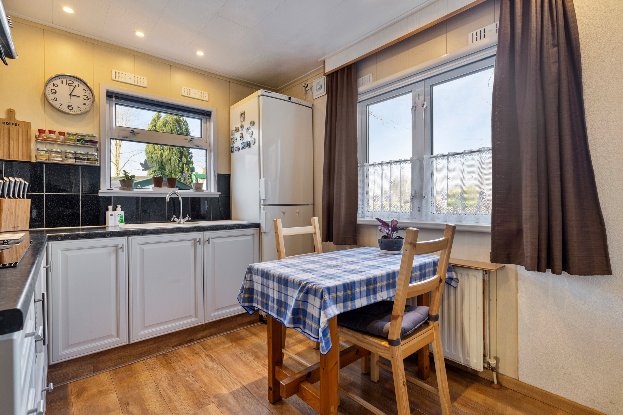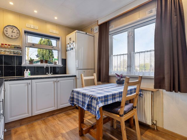 De keuken is voorzien van diverse boven- en onderkasten en is voorzien van een 4-pitskookplaat, afzuigkap en een losse koel-vriescombinatie. De vloer is afgewerkt met laminaat en in het plafond zijn inbouwspots geplaatst.