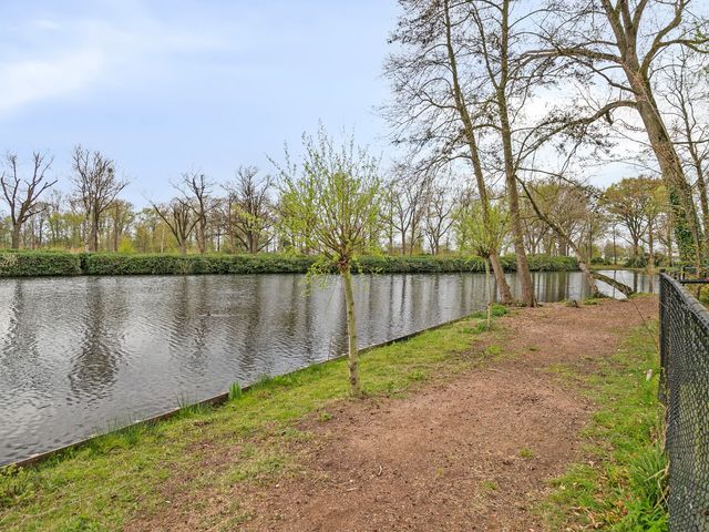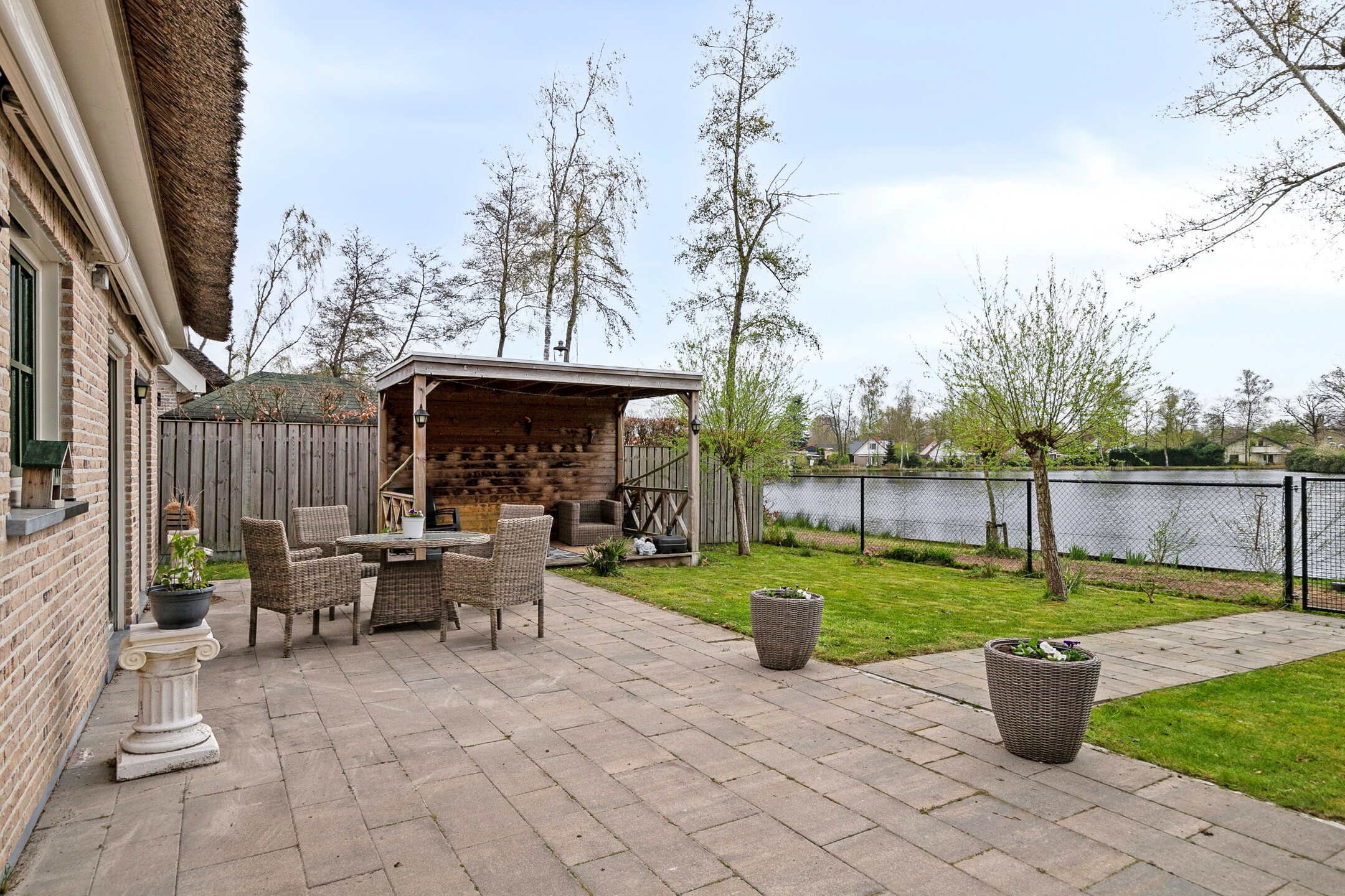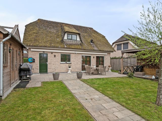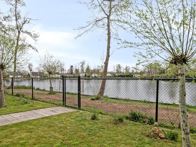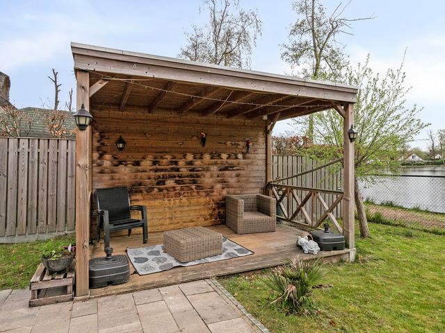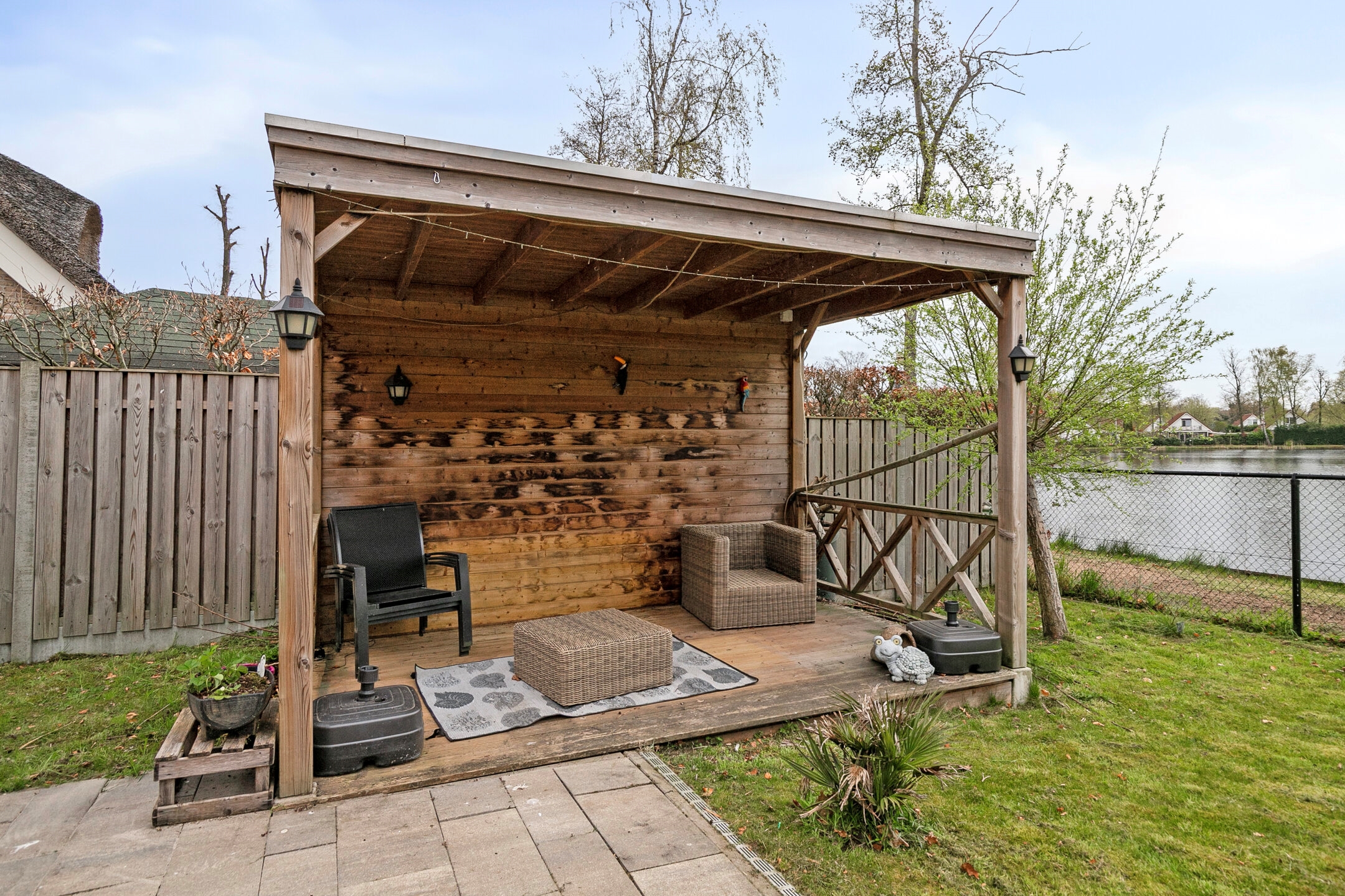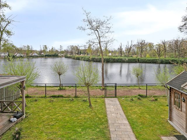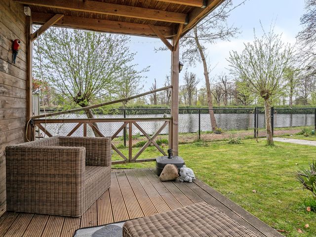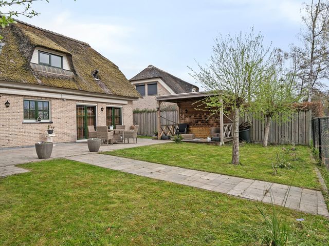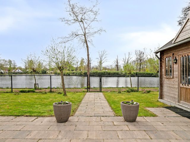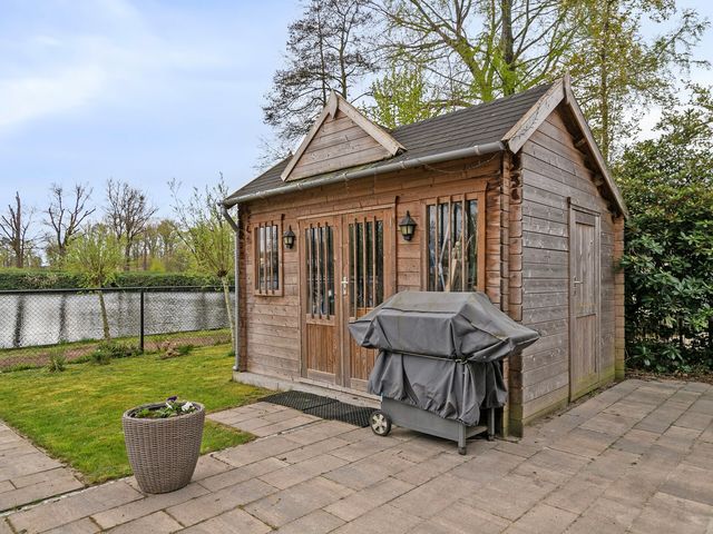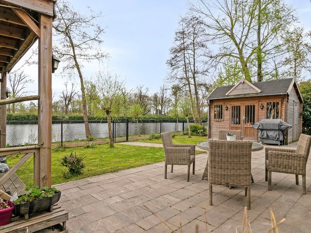 De keurig aangelegde tuin met een weids en vrij uitzicht over het ven is een oase van rust. Met een verzorgd gazon, een zonnig terras, een sfeervolle overkapping en een ruim tuinhuis is dit een plek om in alle jaargetijden volop te genieten van het buitenleven.