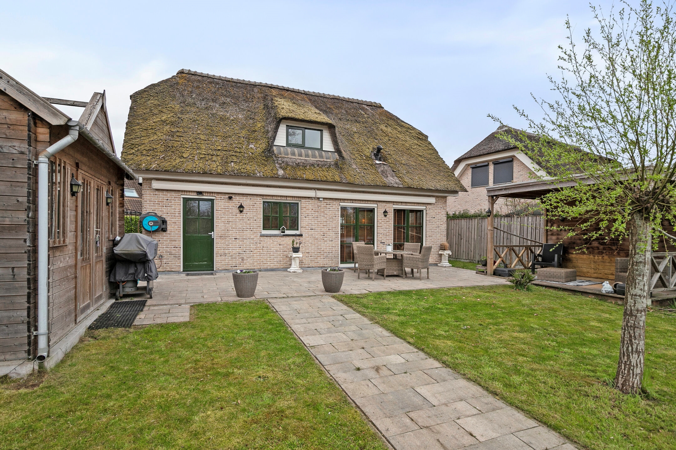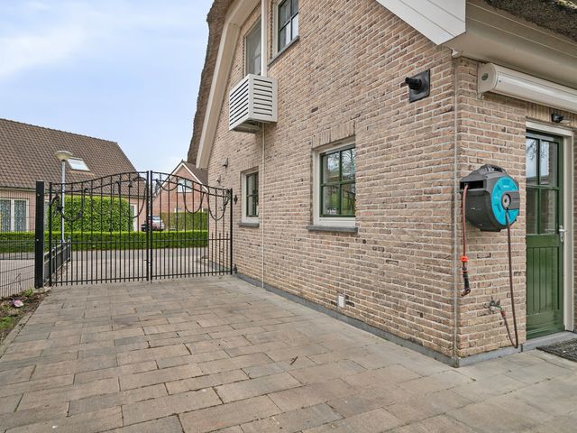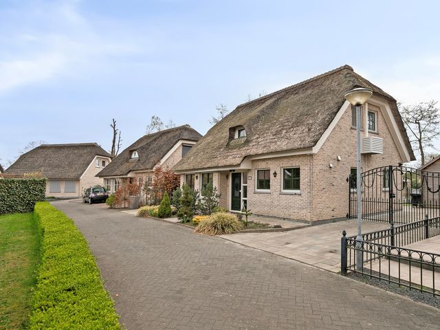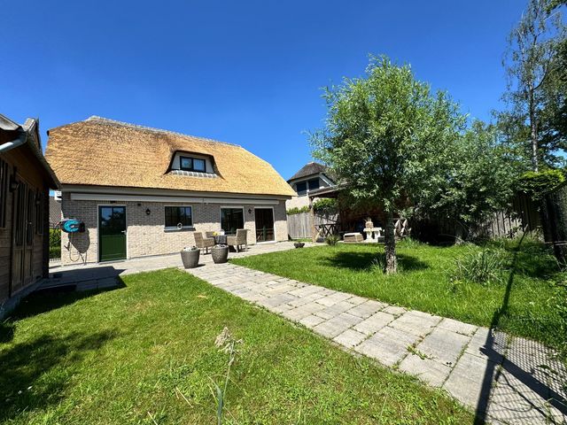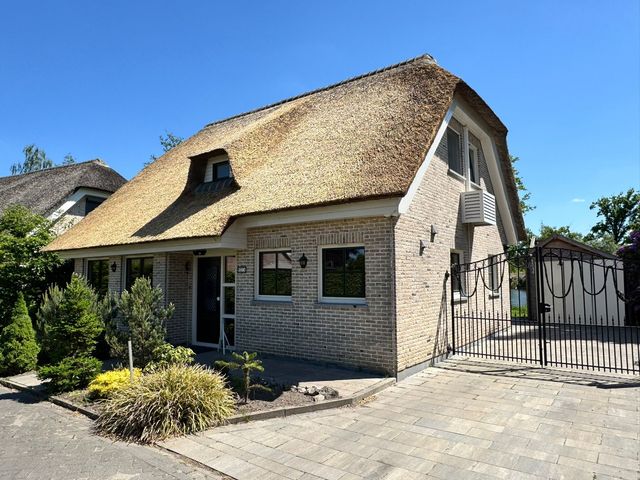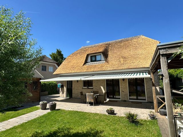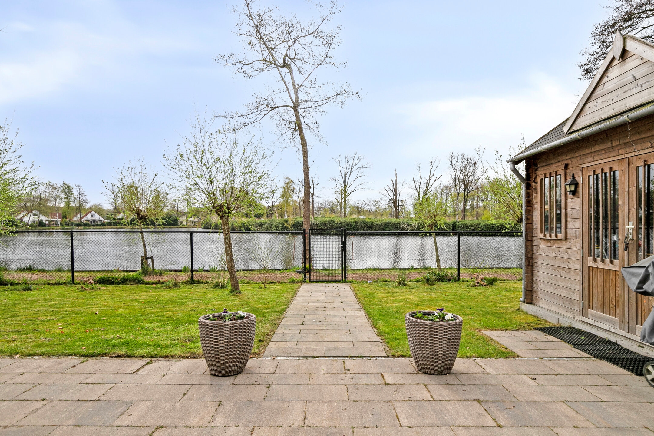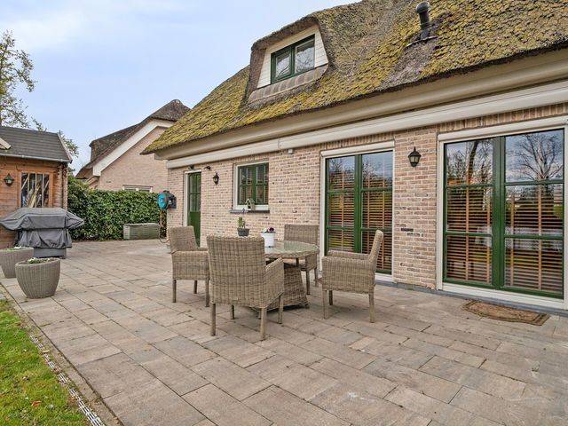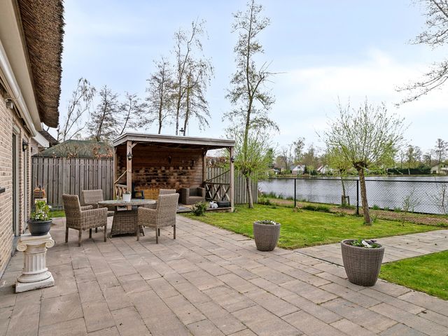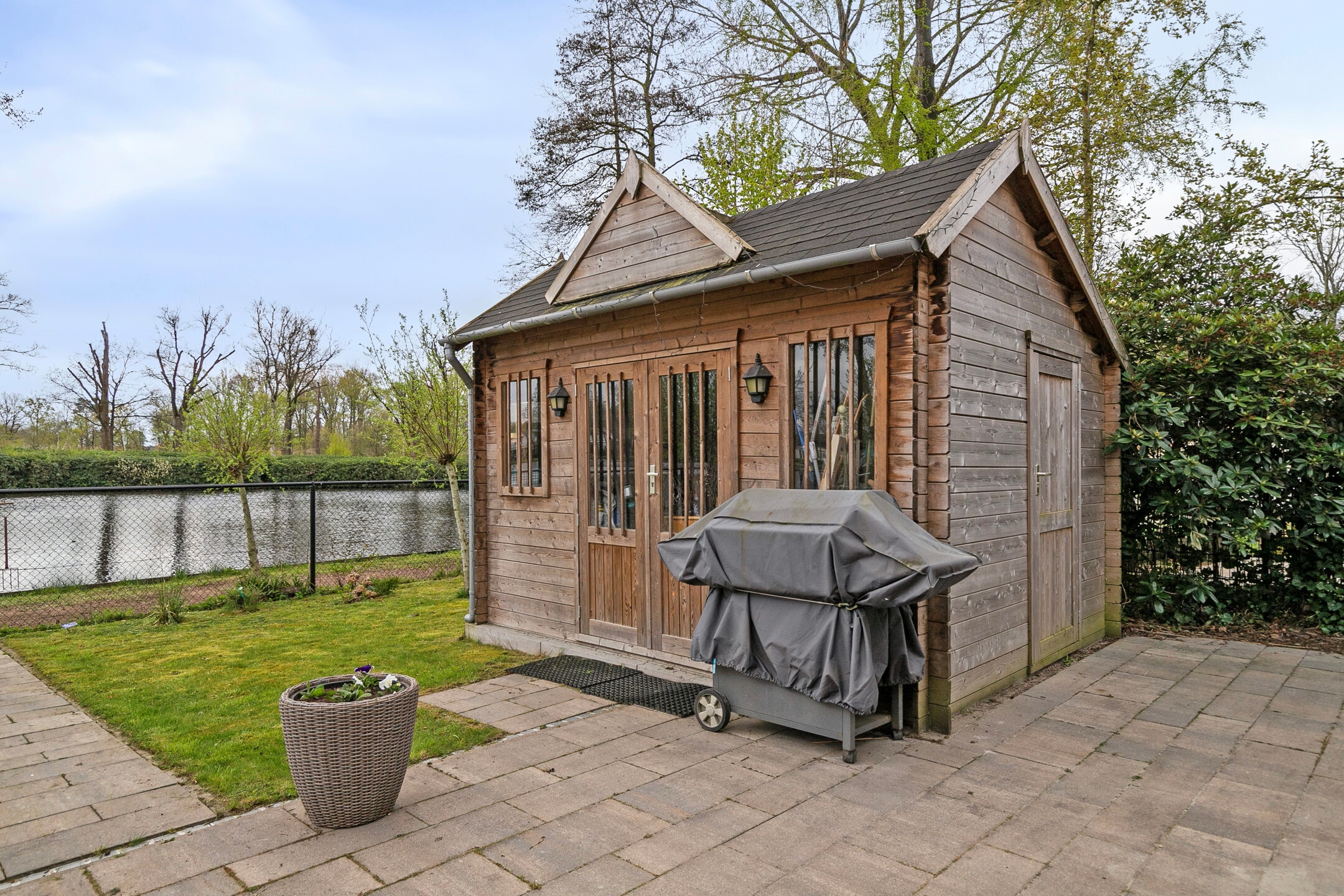 De keurig aangelegde tuin met een weids en vrij uitzicht over het ven is een oase van rust. Met een verzorgd gazon, een zonnig terras, een sfeervolle overkapping en een ruim tuinhuis is dit een plek om in alle jaargetijden volop te genieten van het buitenleven.