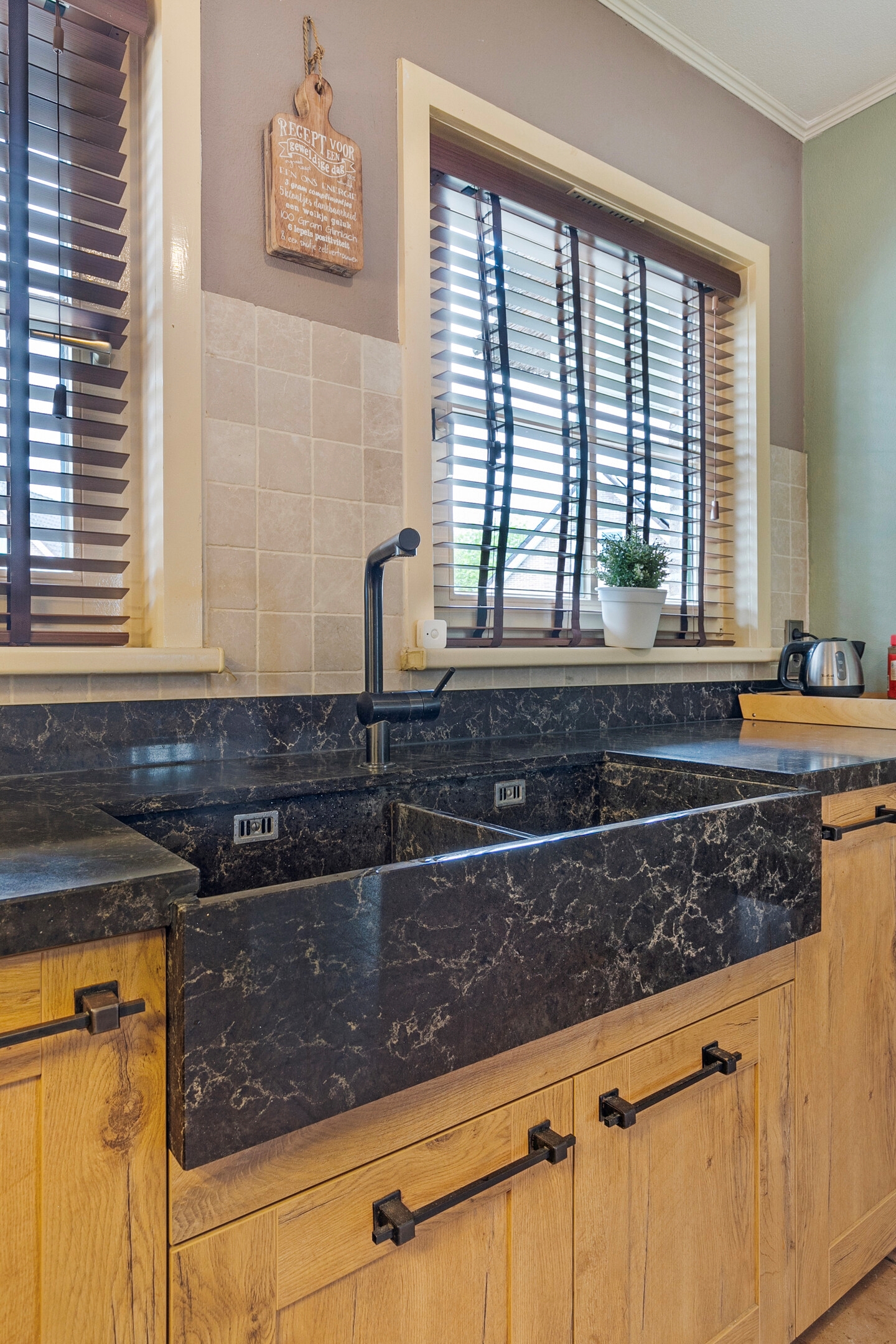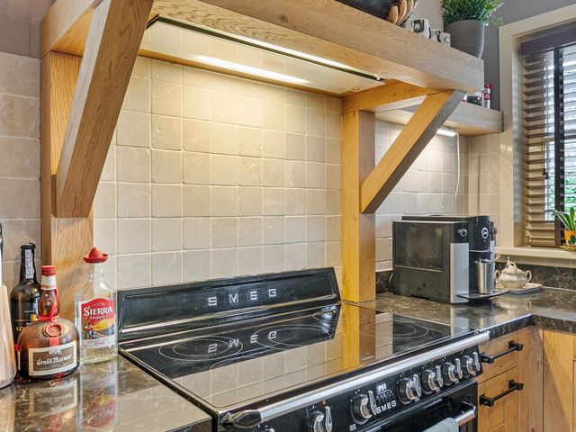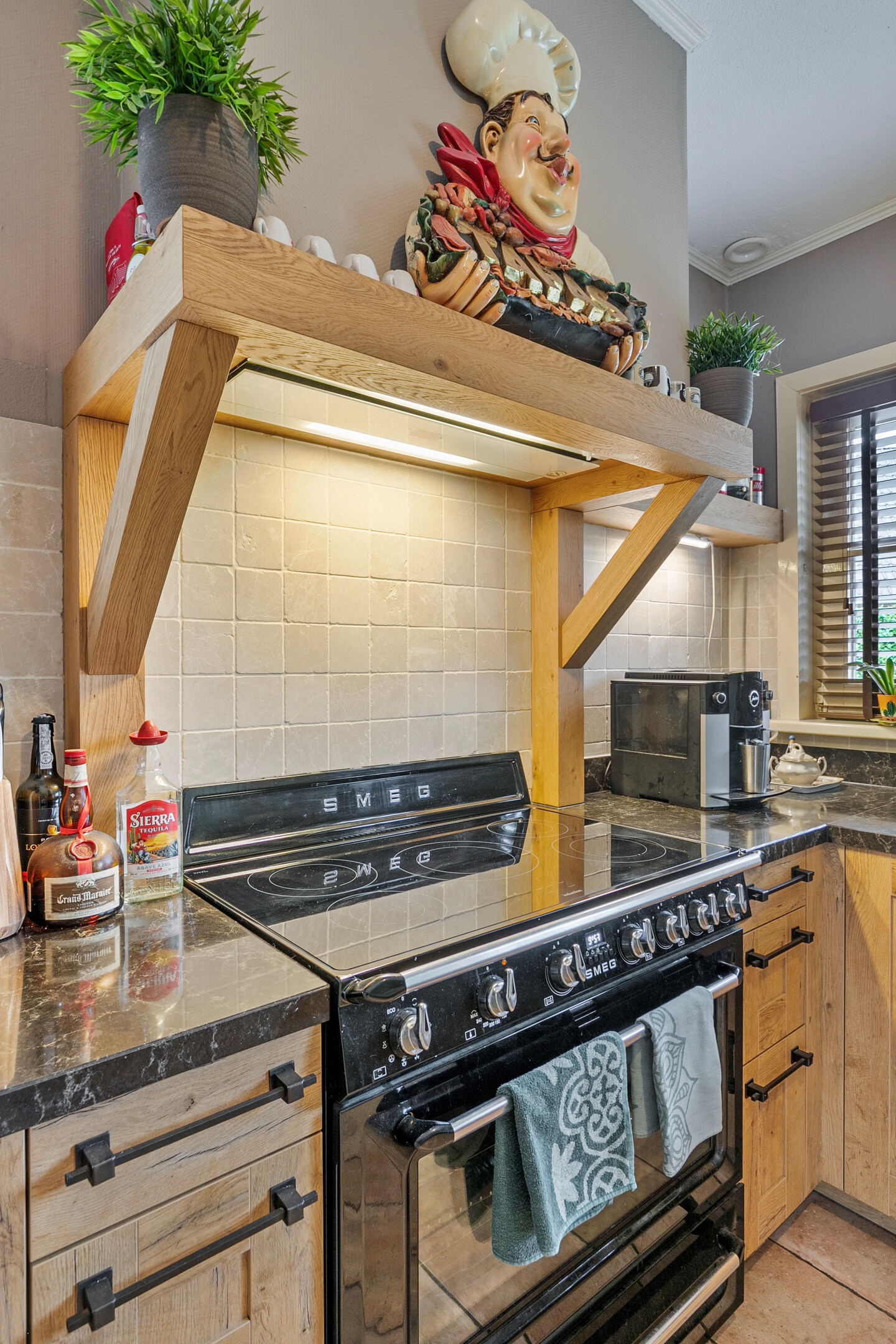 De keuken heeft een royale U-vormige opstelling en is geheel in stijl! De keuken is uitgevoerd met kunststofdeurtjes in een houtlook en een composiet aanrechtblad. De inrichting bestaat uit een SMEG fornuis met een grote oven, afzuigkap in schouw en koelkast. Door de royale opstelling met zowel lades als kasten, ontbreekt het je zeker niet aan bergruimte, ideaal.