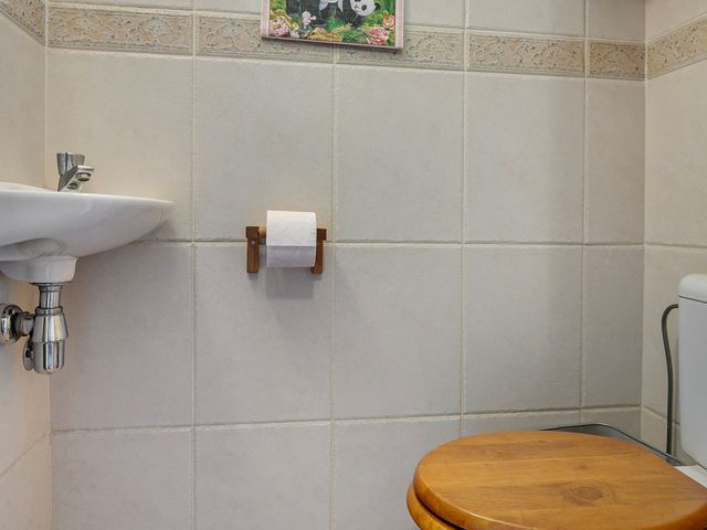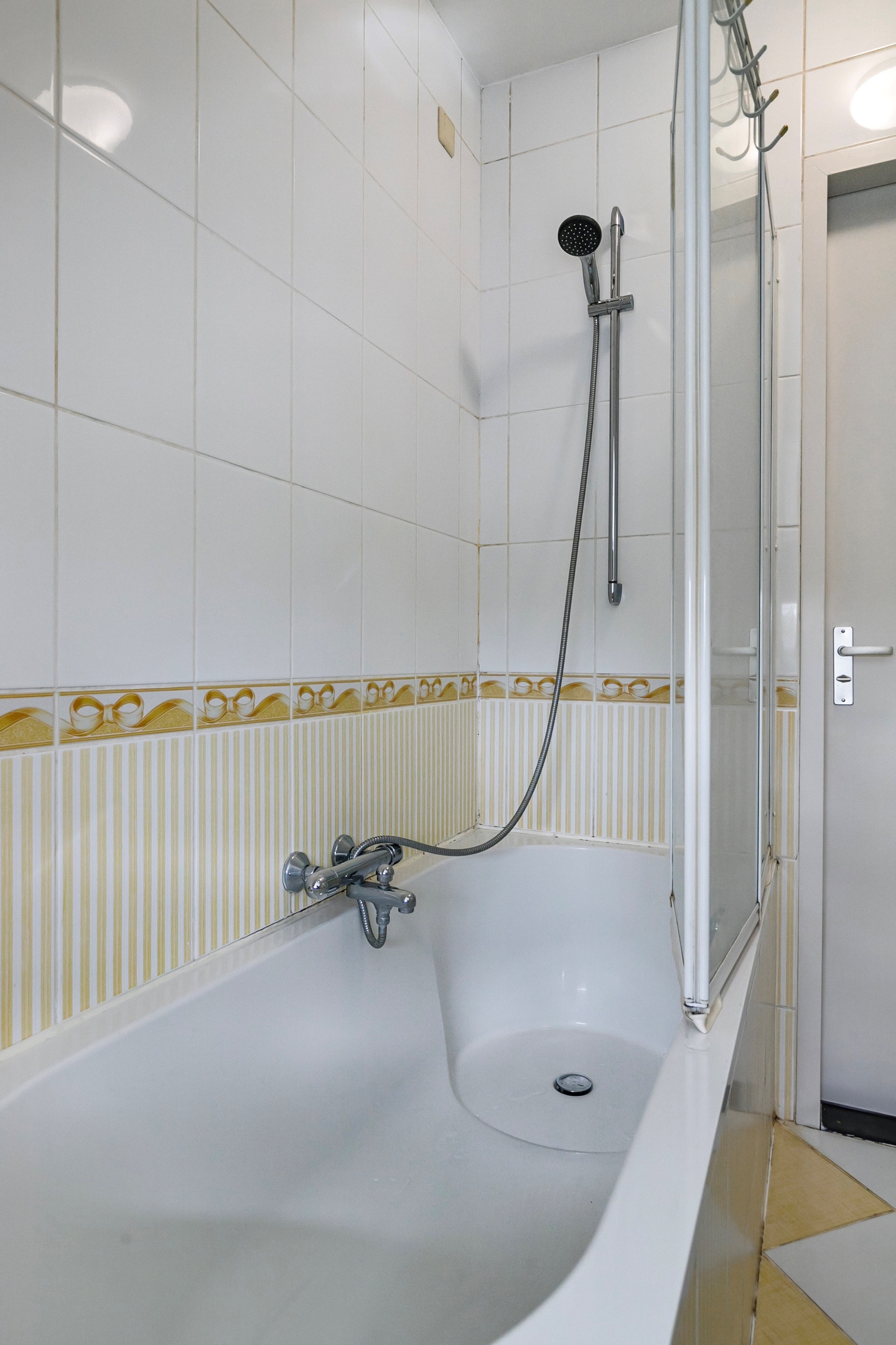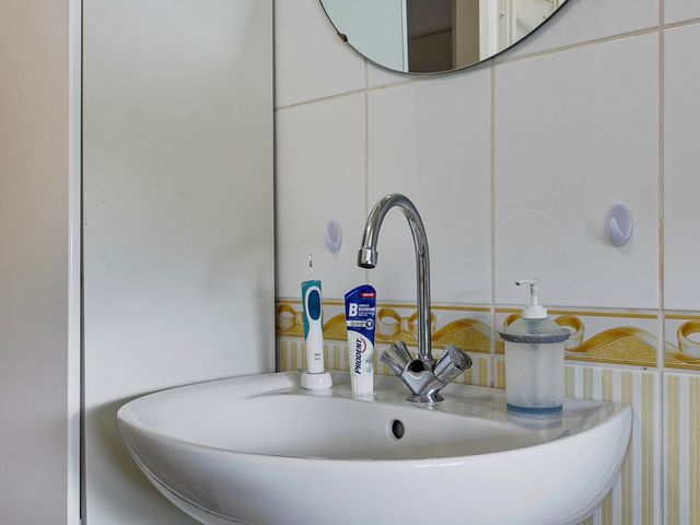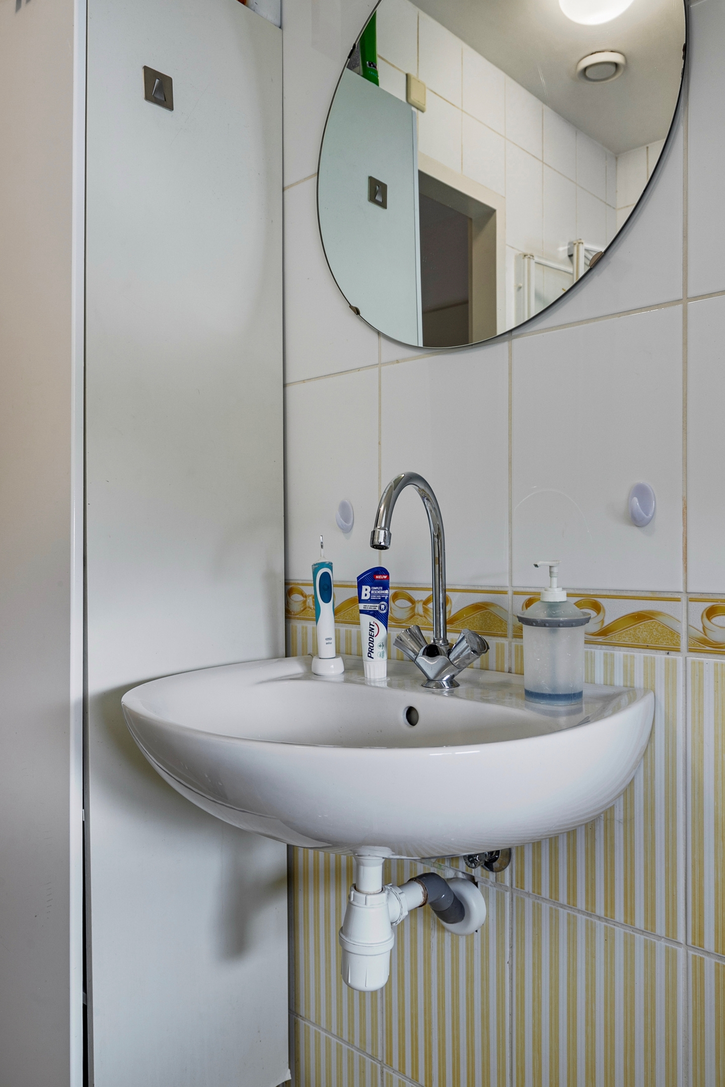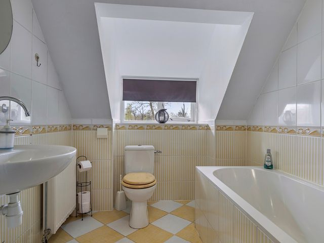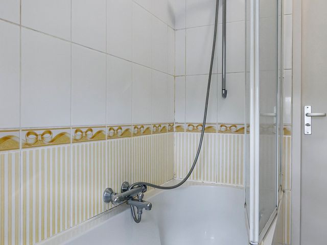 De badkamer is compleet ingericht met een ligbad, 2e toilet, radiator en een wastafel met spiegel. De ruimte is geheel betegeld en is voorzien van een raampartij voor natuurlijke ventilatie.
