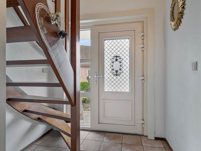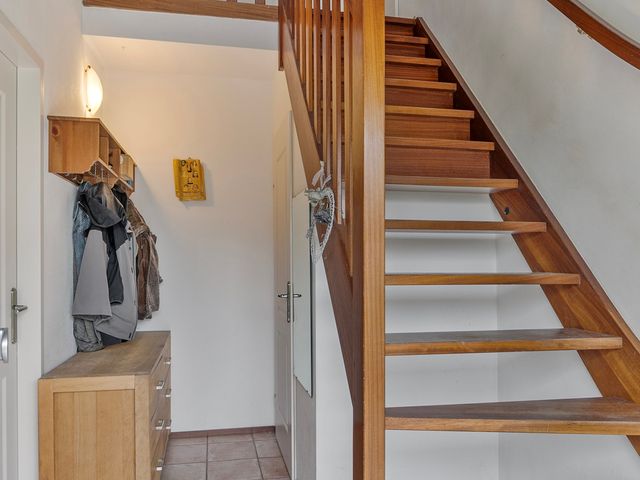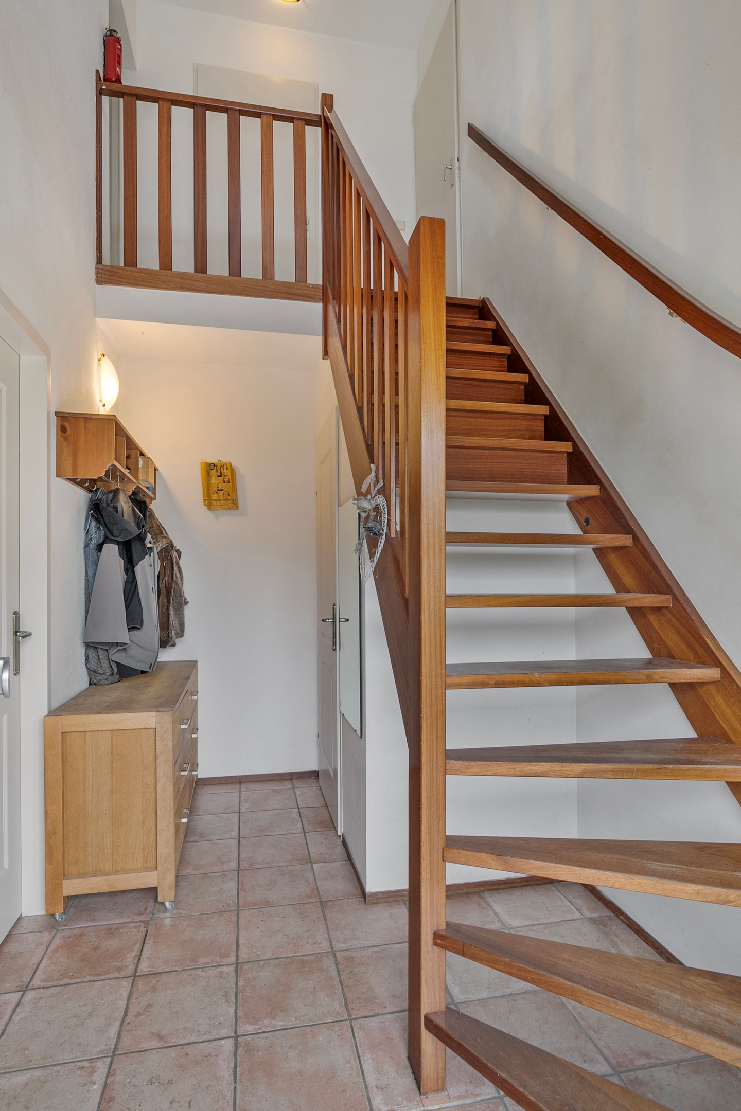 De entree is landhuiswaardig! Een ruime ontvangsthal met stijlvolle houten trap naar de 1e verdieping. Vanuit de ontvangsthal is er toegang tot de nette toiletruimte en woonkamer.