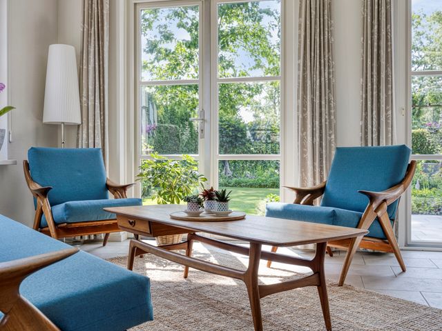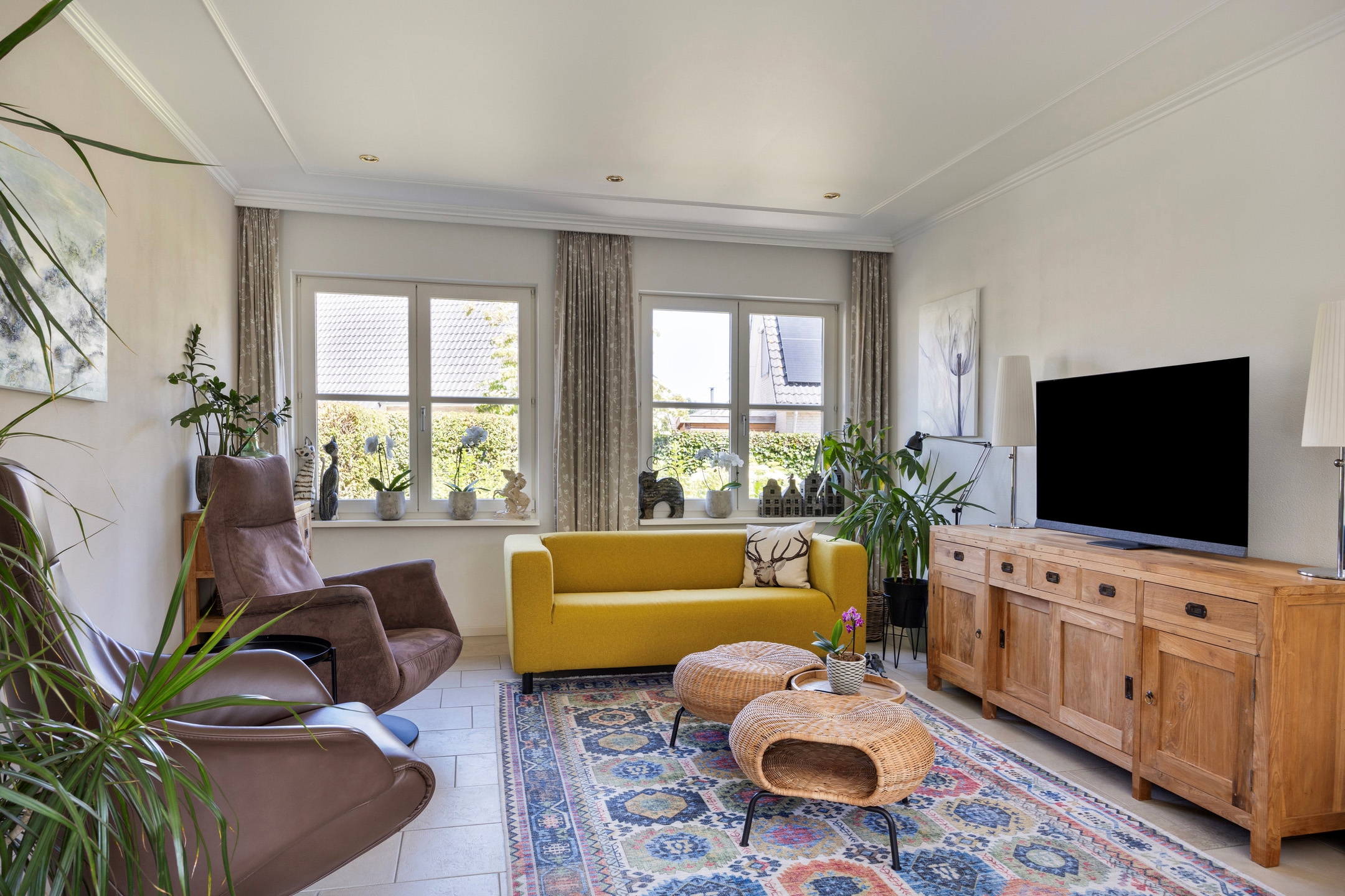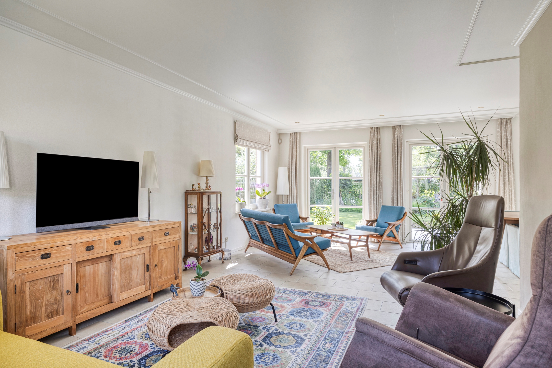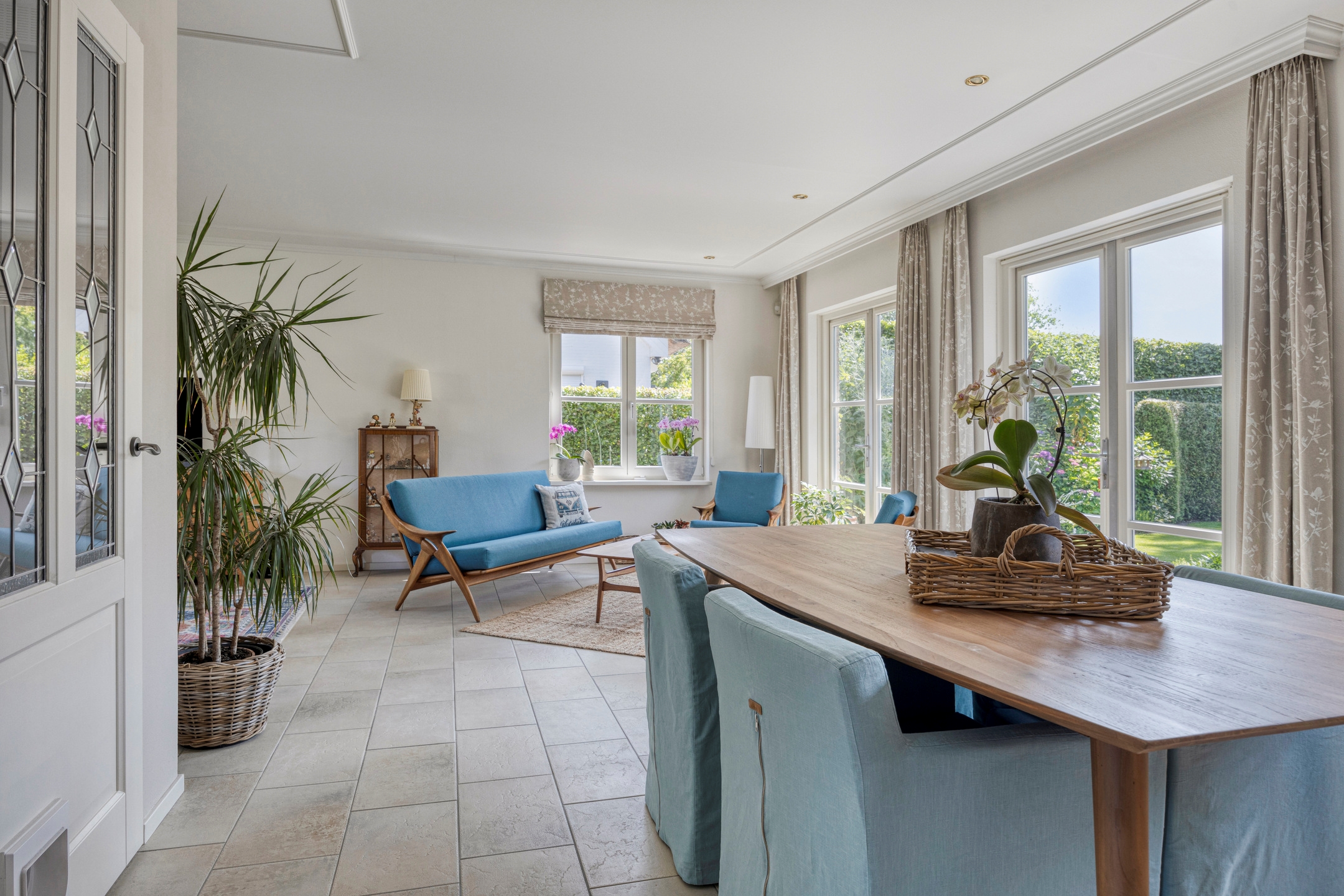 De L-vormige woonkamer heeft veel lichtinval door de aanwezigheid van meerdere raampartijen en de dubbele openslaande tuindeuren. Deze raampartijen zorgen niet alleen voor direct daglicht maar geven ook een prachtig zicht op de fraai aangelegde achtertuin.