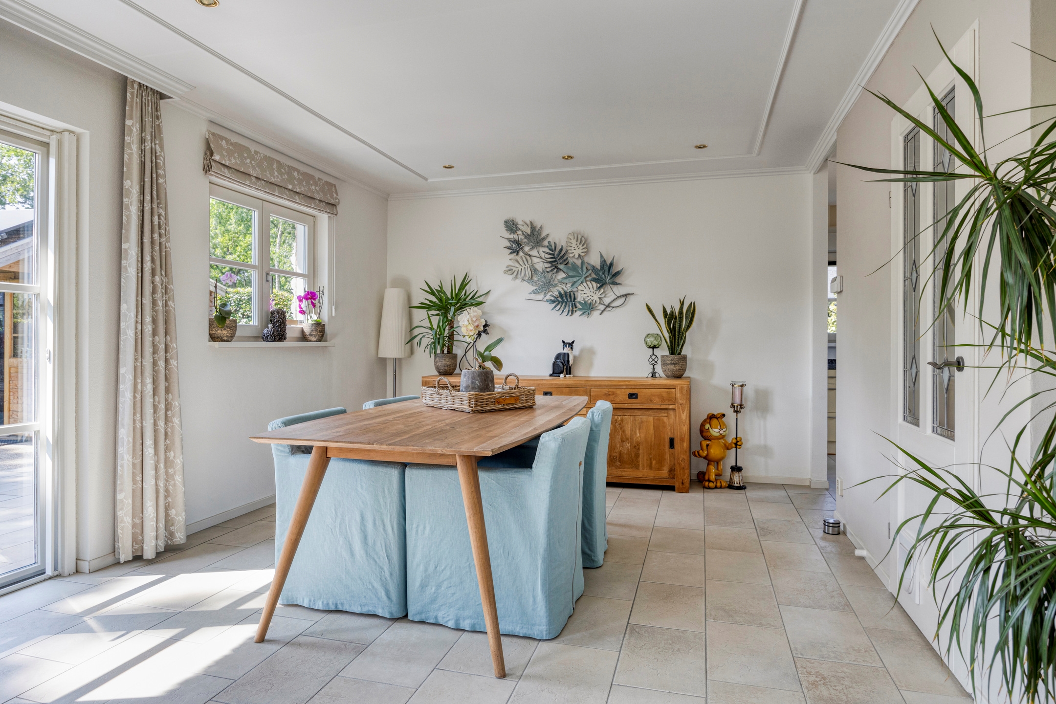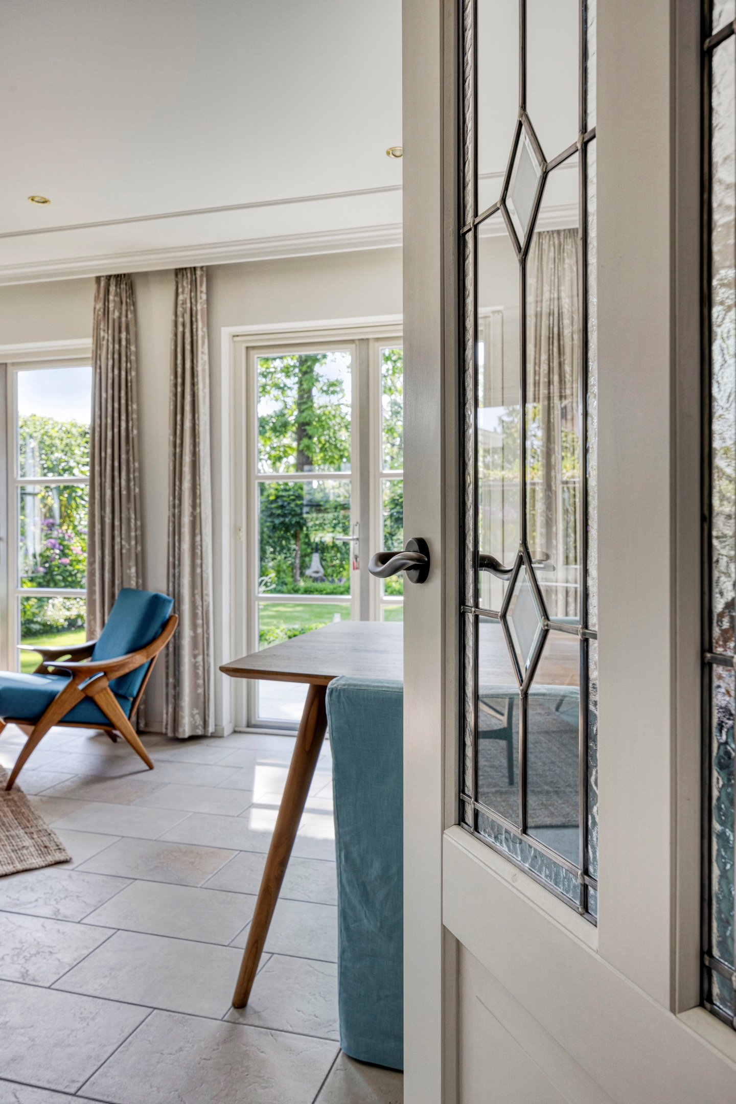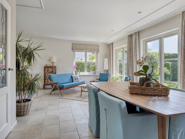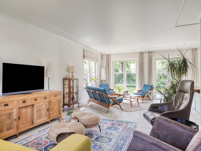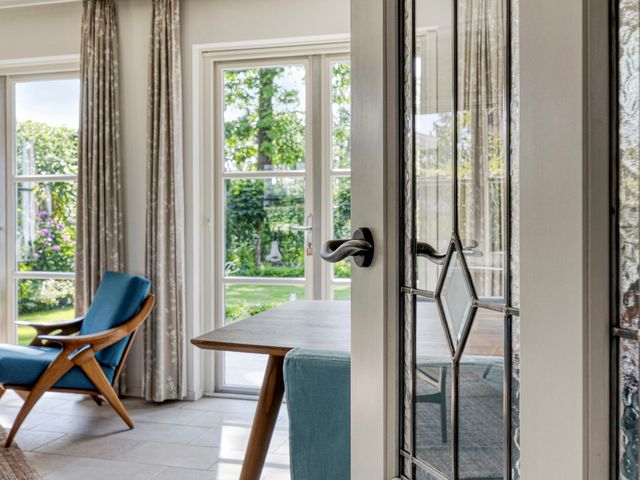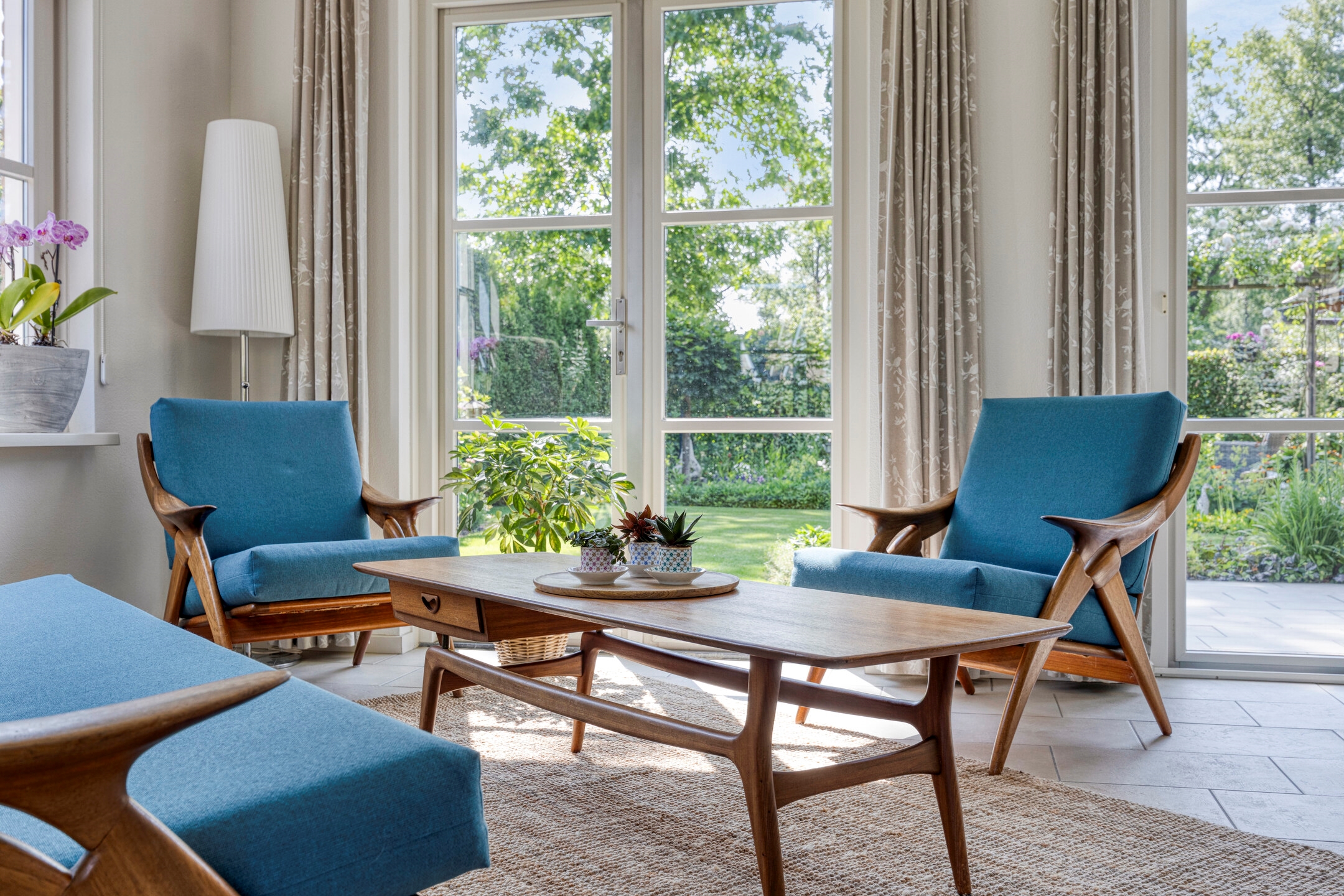 De L-vormige woonkamer heeft veel lichtinval door de aanwezigheid van meerdere raampartijen en de dubbele openslaande tuindeuren. Deze raampartijen zorgen niet alleen voor direct daglicht maar geven ook een prachtig zicht op de fraai aangelegde achtertuin.
