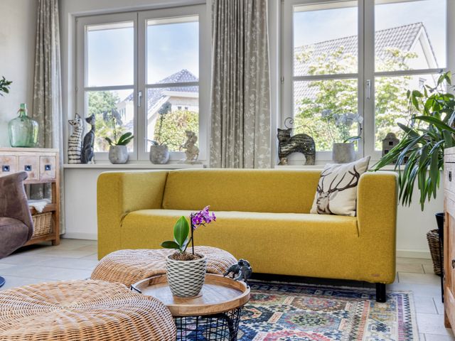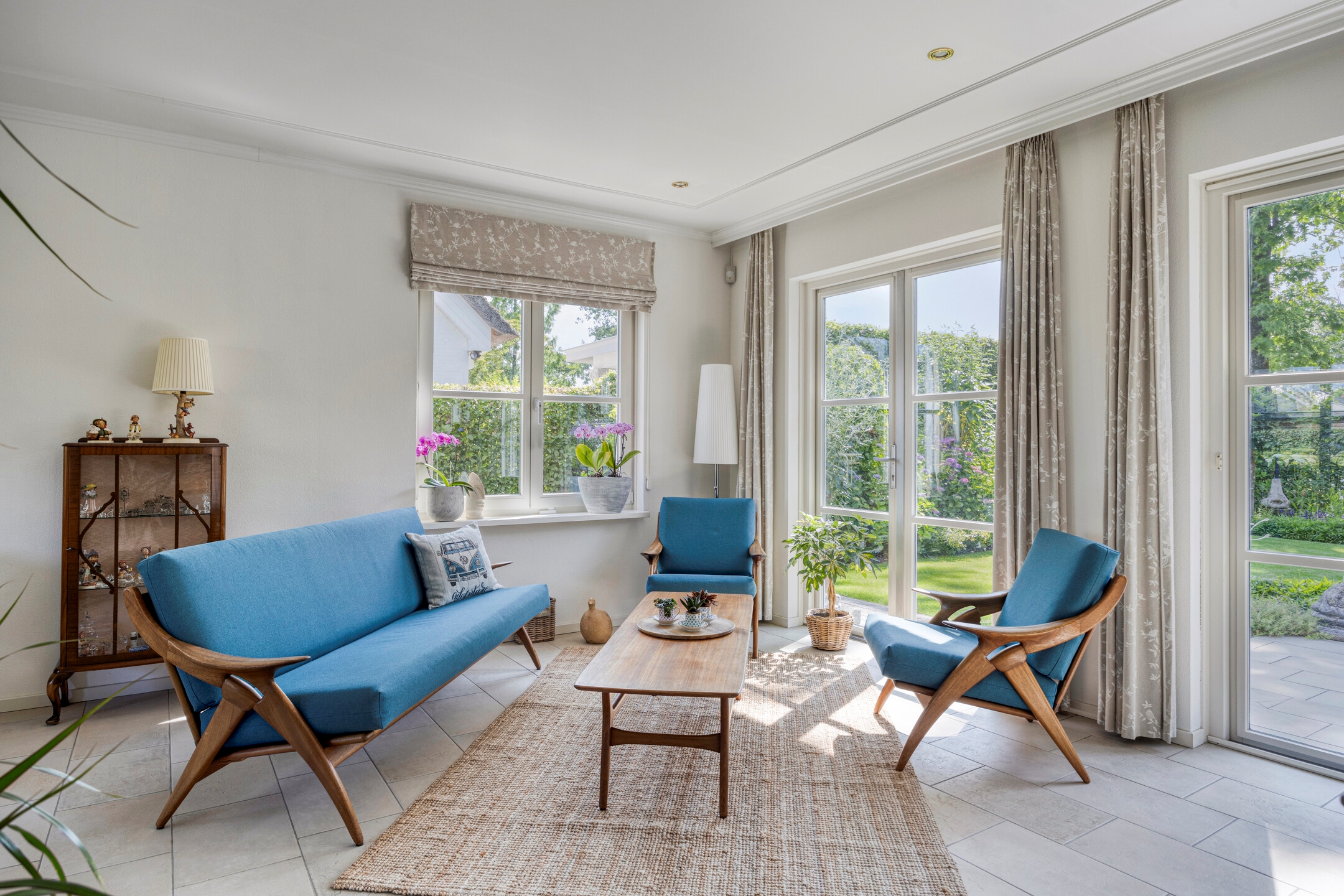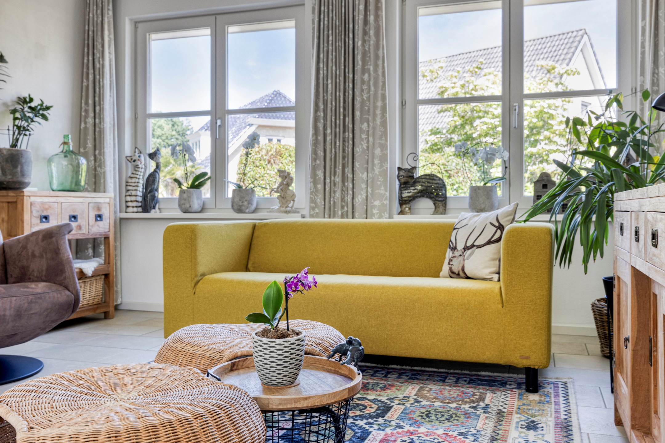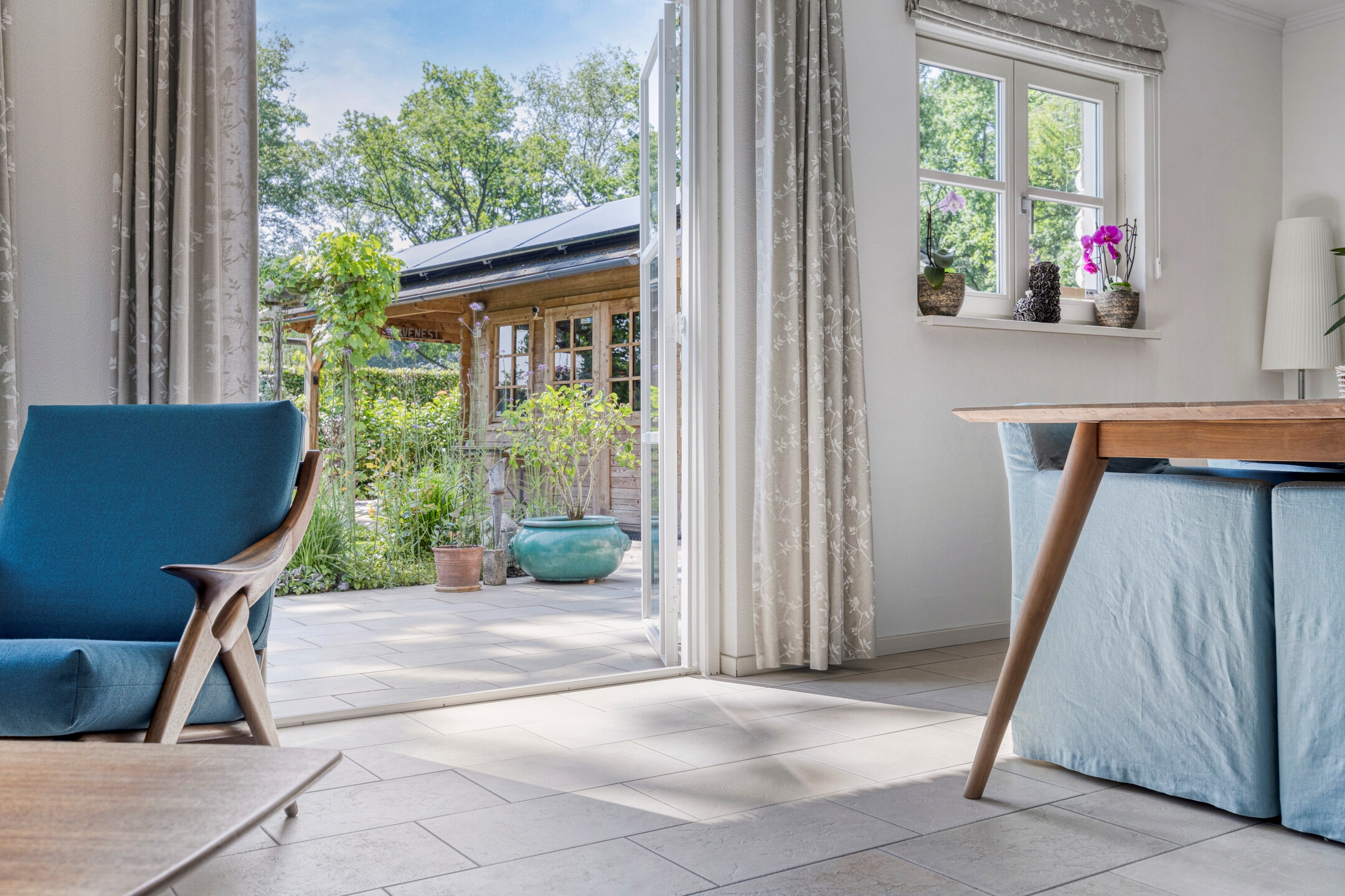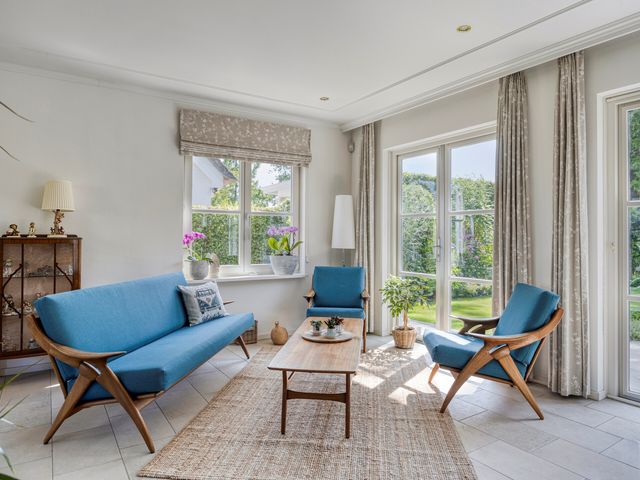 De L-vormige woonkamer heeft veel lichtinval door de aanwezigheid van meerdere raampartijen en de dubbele openslaande tuindeuren. Deze raampartijen zorgen niet alleen voor direct daglicht maar geven ook een prachtig zicht op de fraai aangelegde achtertuin.